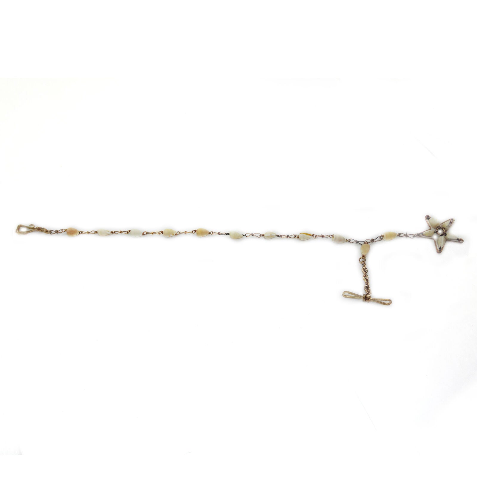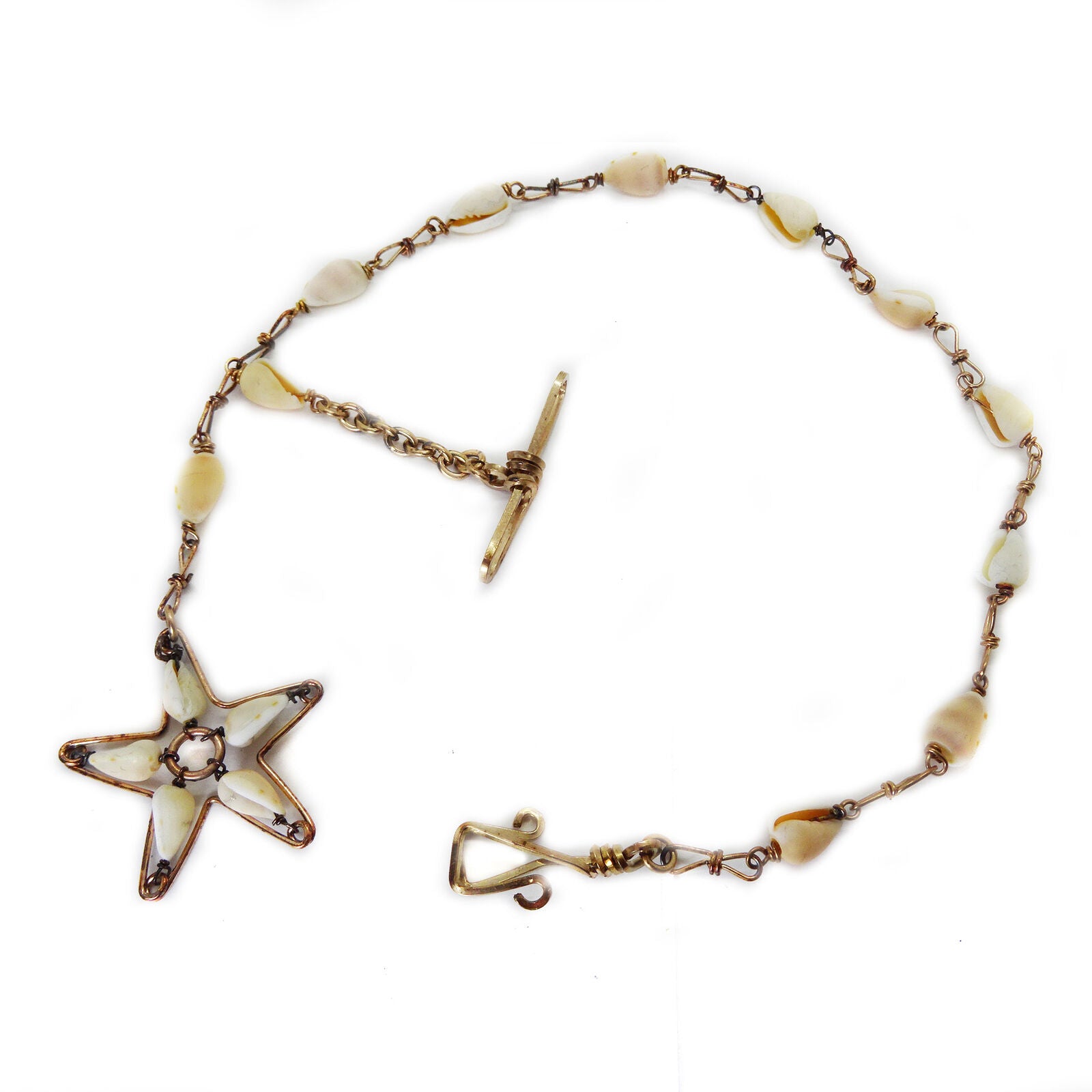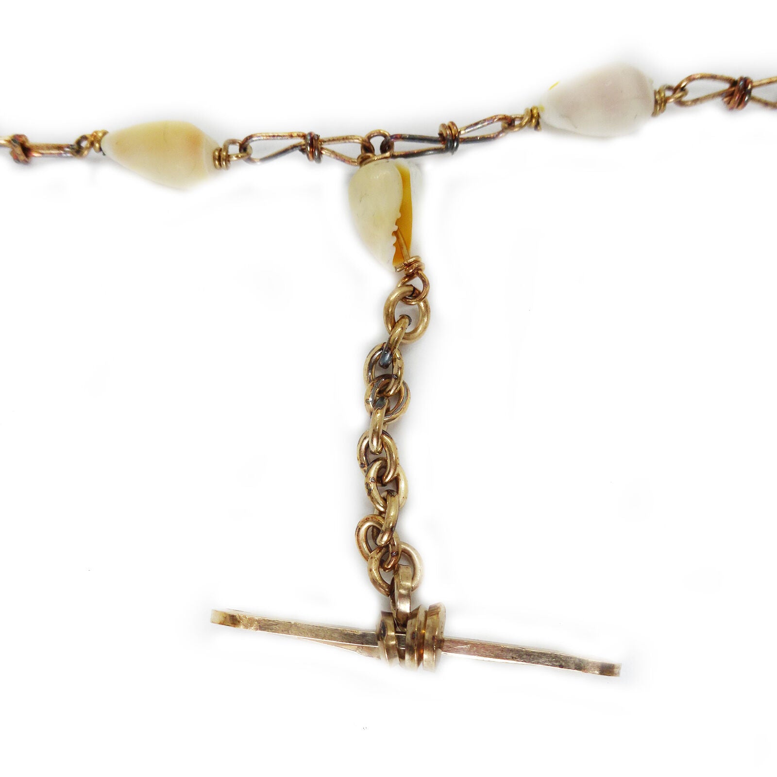 Charming antique artisan watch fob for a pocket watch. Gold plated chain has pretty sea shells, and a charming gold plated star design at the end with five shells connected to a central ring.