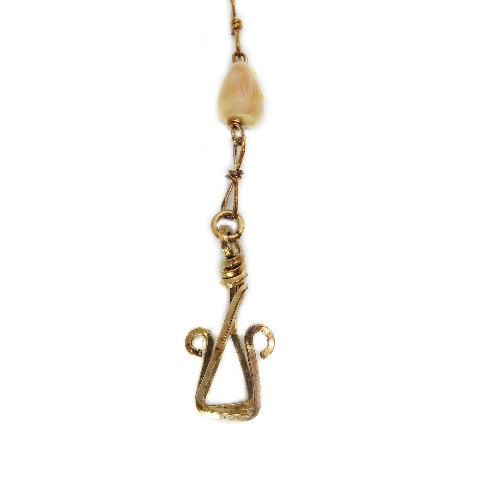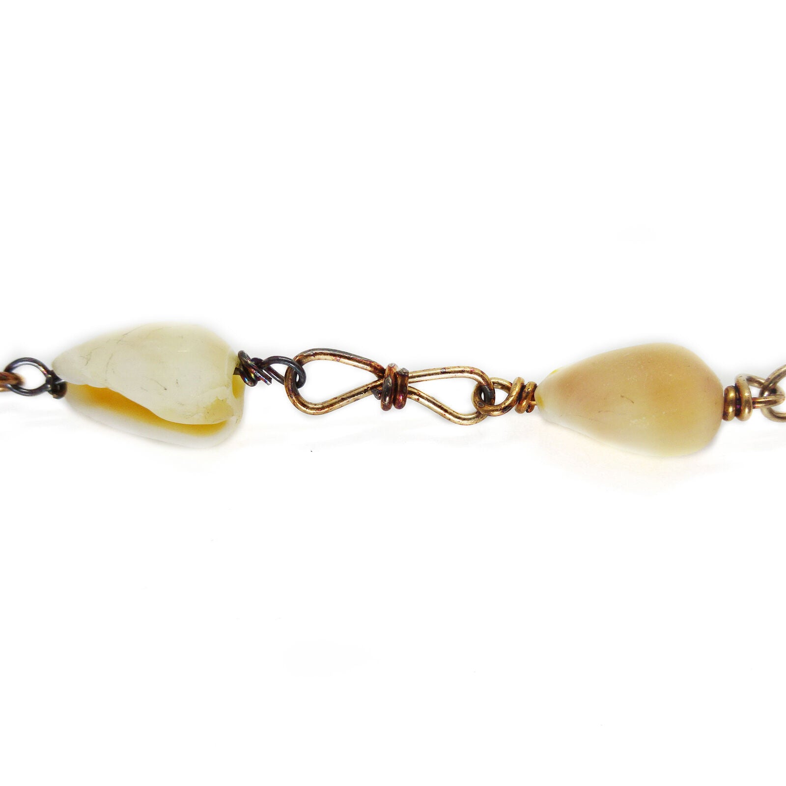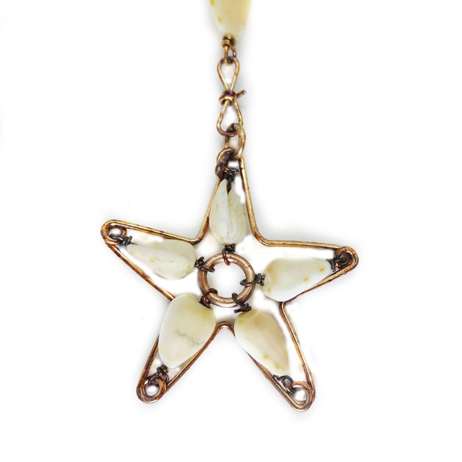 Charming antique artisan watch fob for a pocket watch. Gold plated chain has pretty sea shells, and a charming gold plated star design at the end with five shells connected to a central ring.