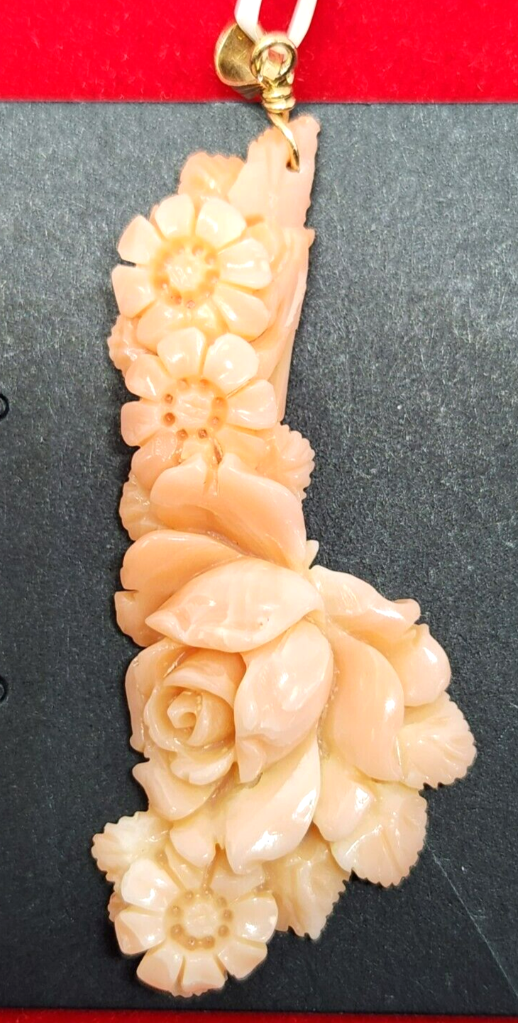 Carved Floral Angel Skin Coral 14k Gold Pendant 2.5" Long