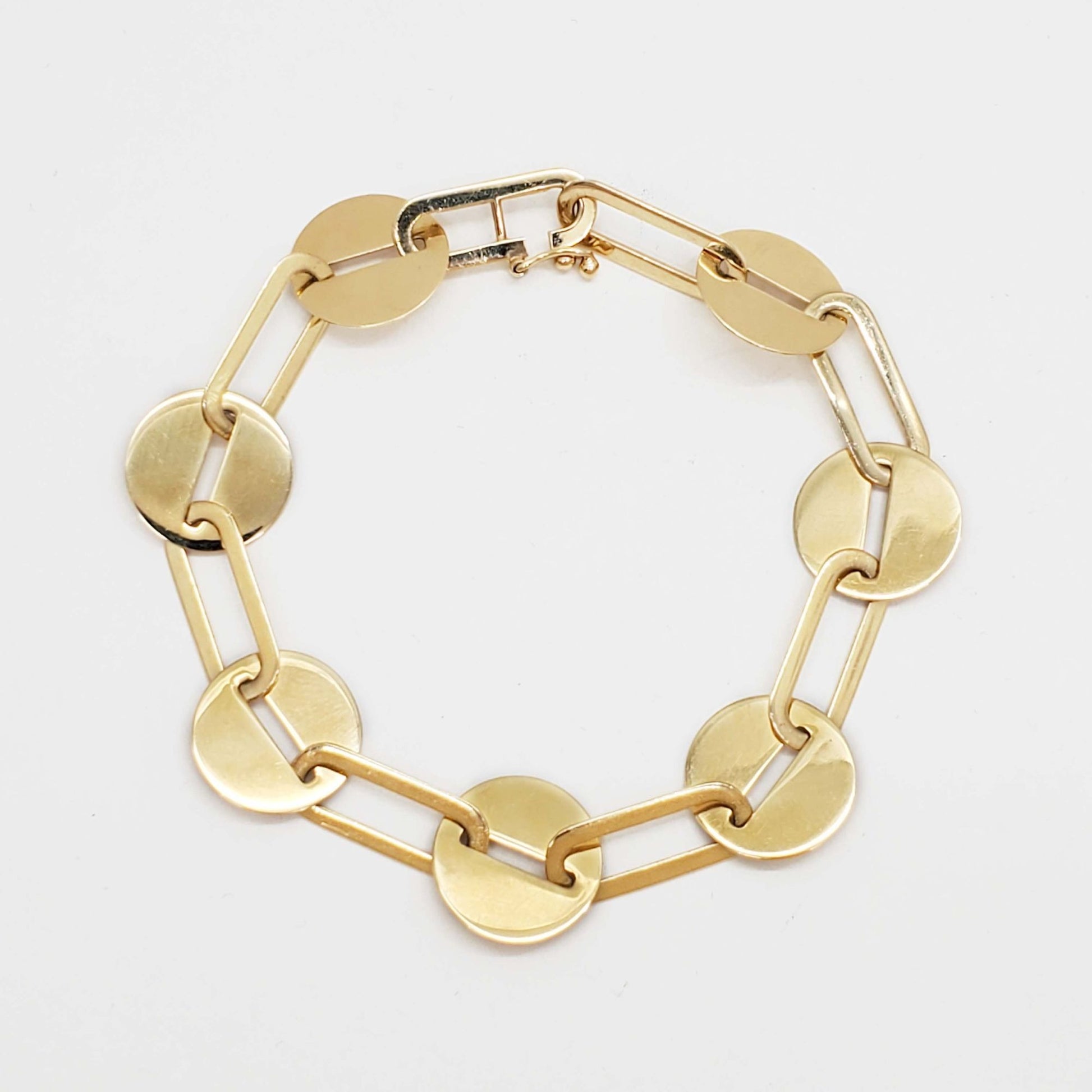 Chevo designer paperclip and disc link tennis bracelet in 14k yellow gold.