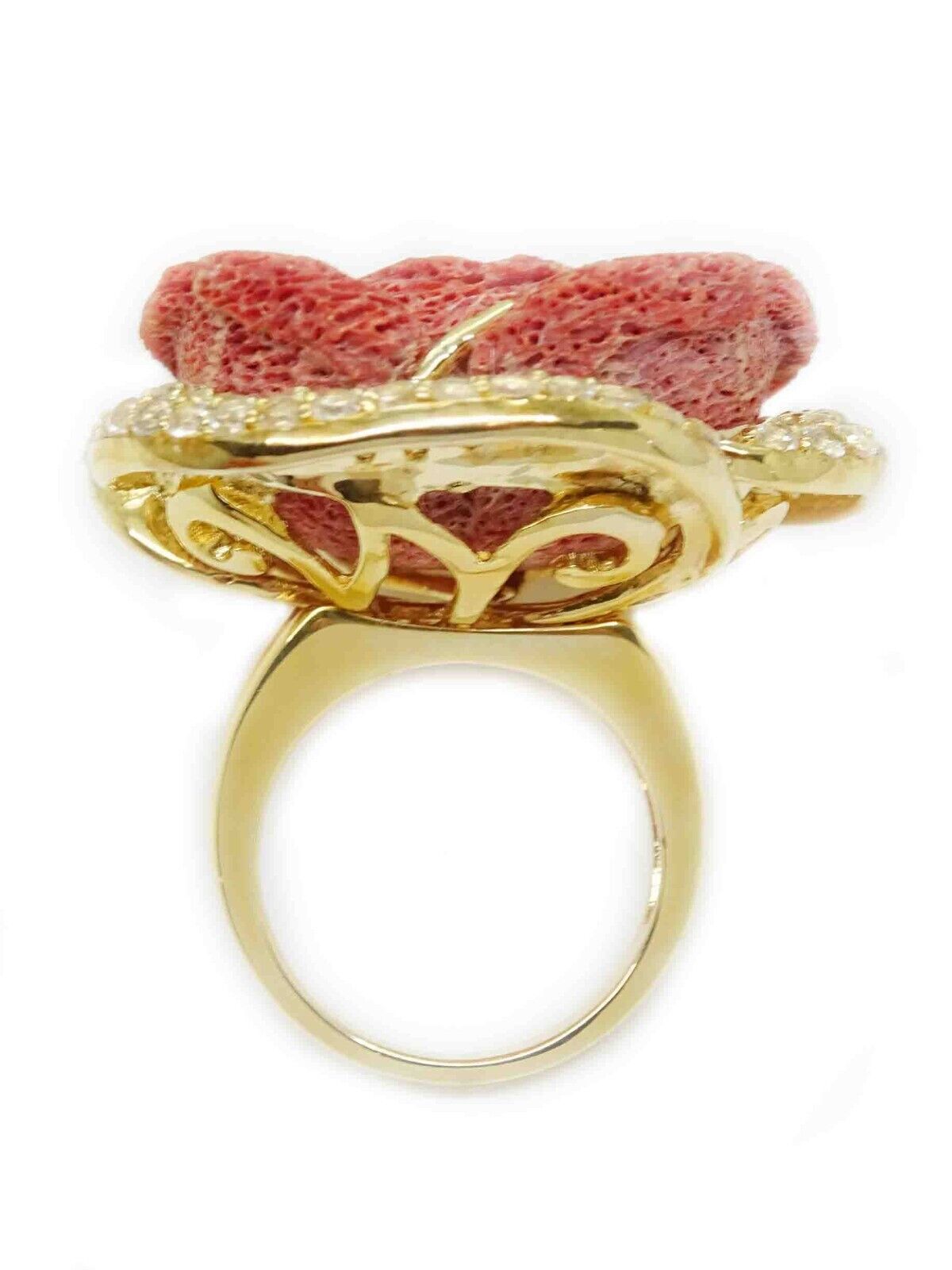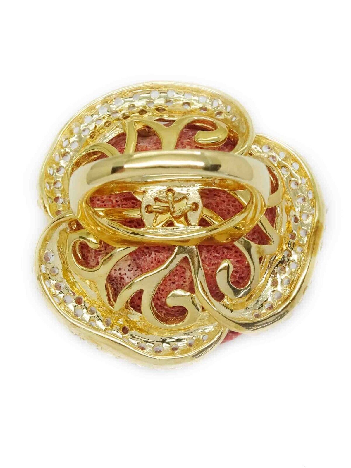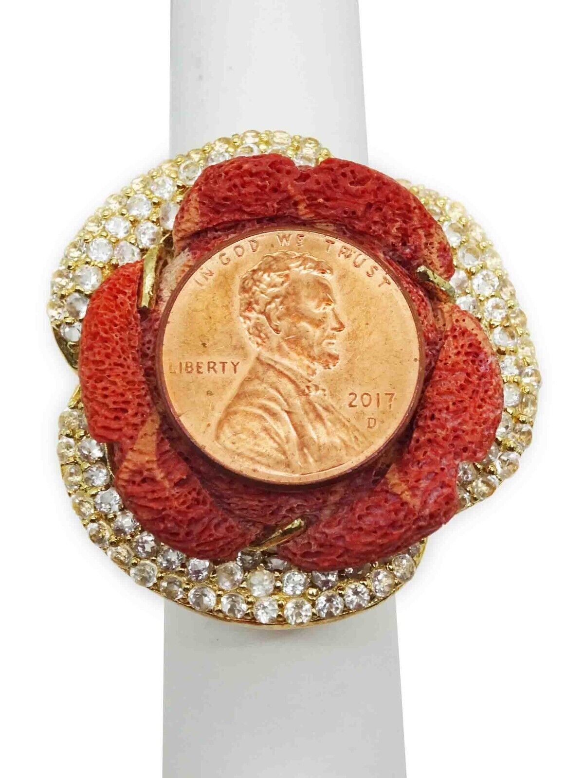 Genuine oxblood red coral hand carved estate piece, re-set into a large sterling vermeil ring setting and surrounded by white topaz gemstones.
