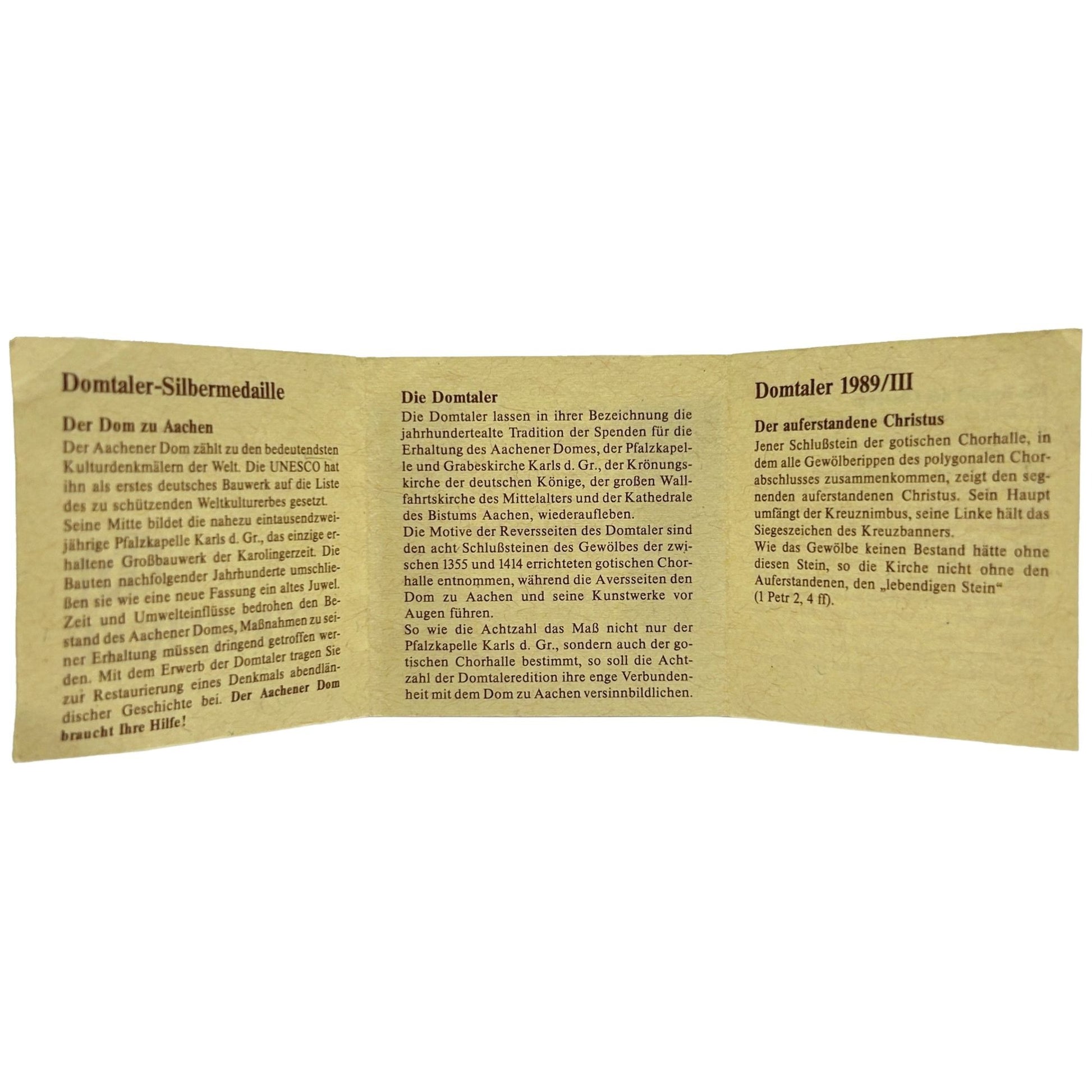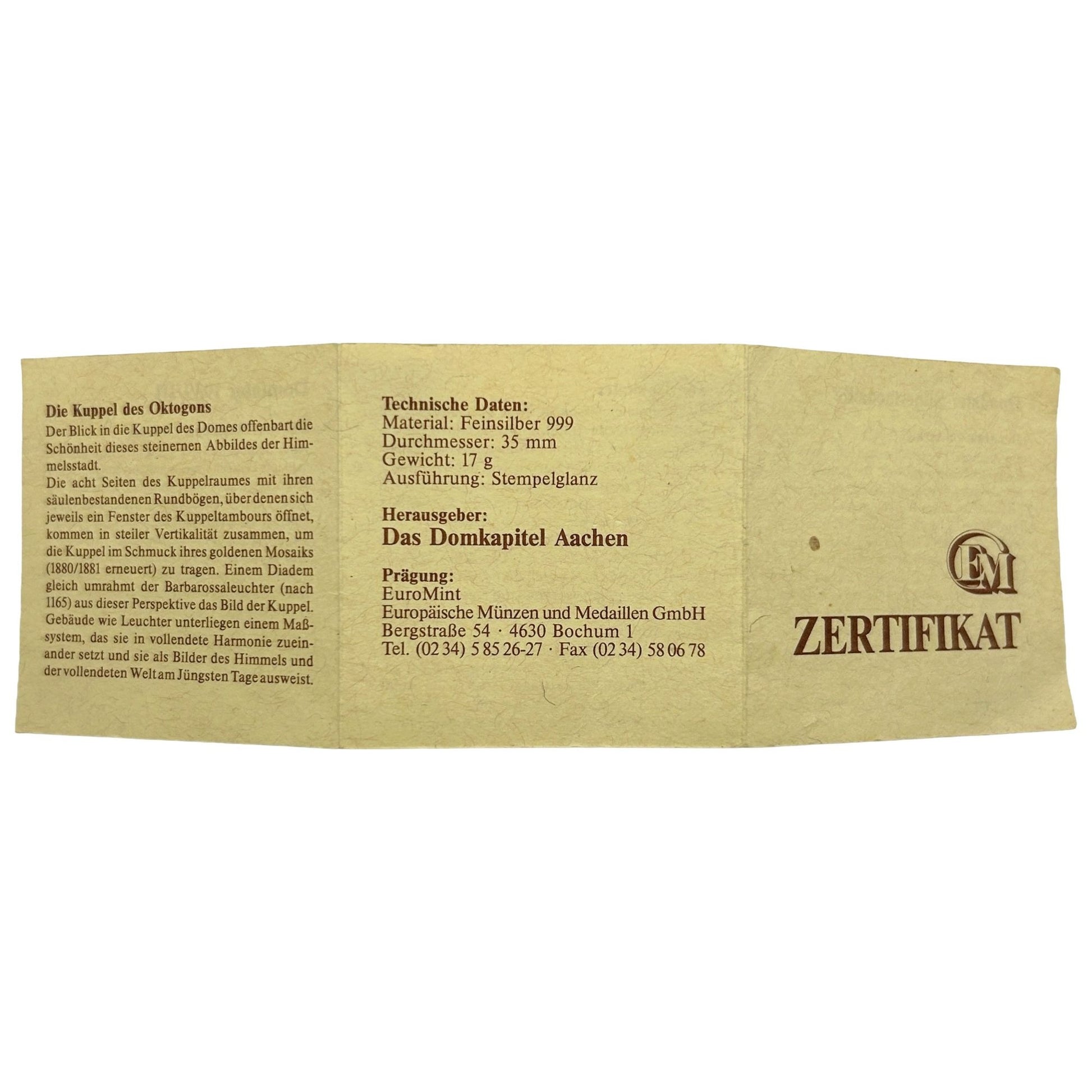 EUROMINT Germany BRD Coin 999 Fine Silver 1989 - The Cathedral Chapter of Aachen + OGP & COA