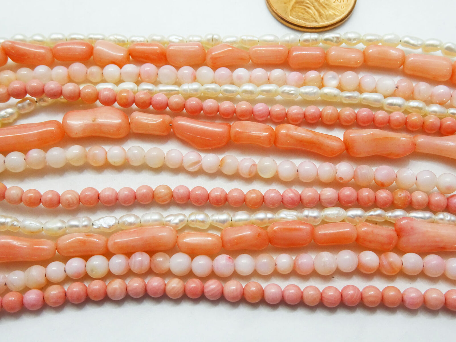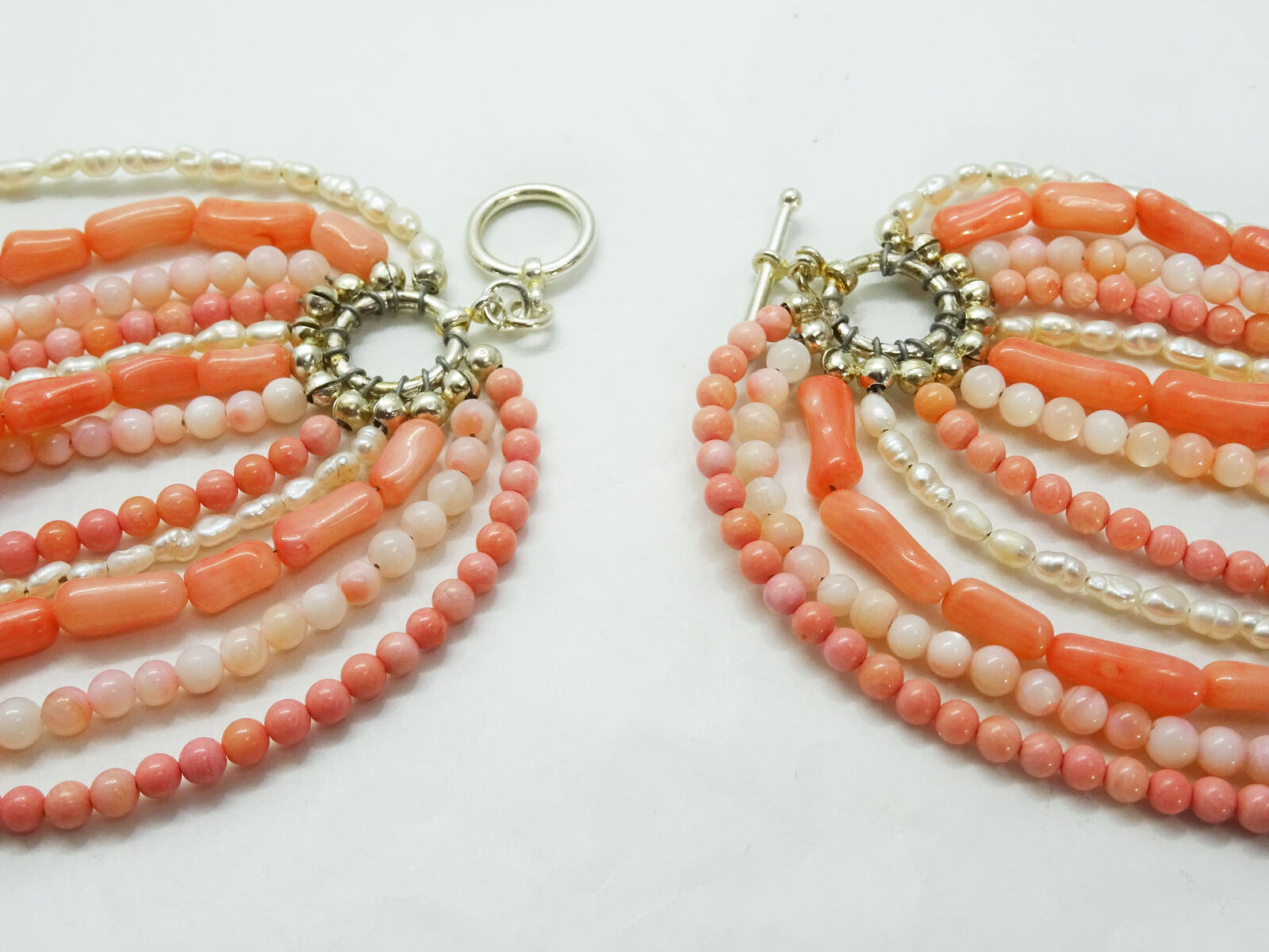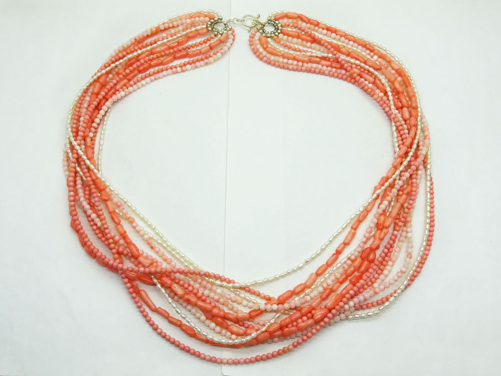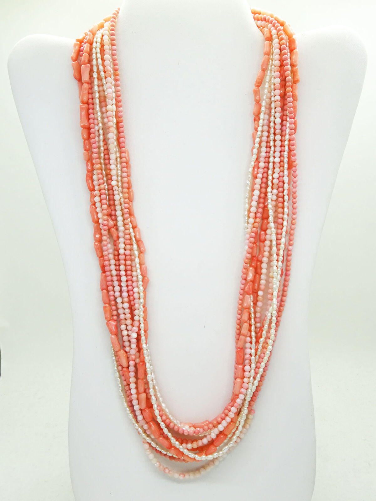 Natural angel skin coral, rosa pink coral, and seed pearl beads strung onto 11 strands in one necklace.