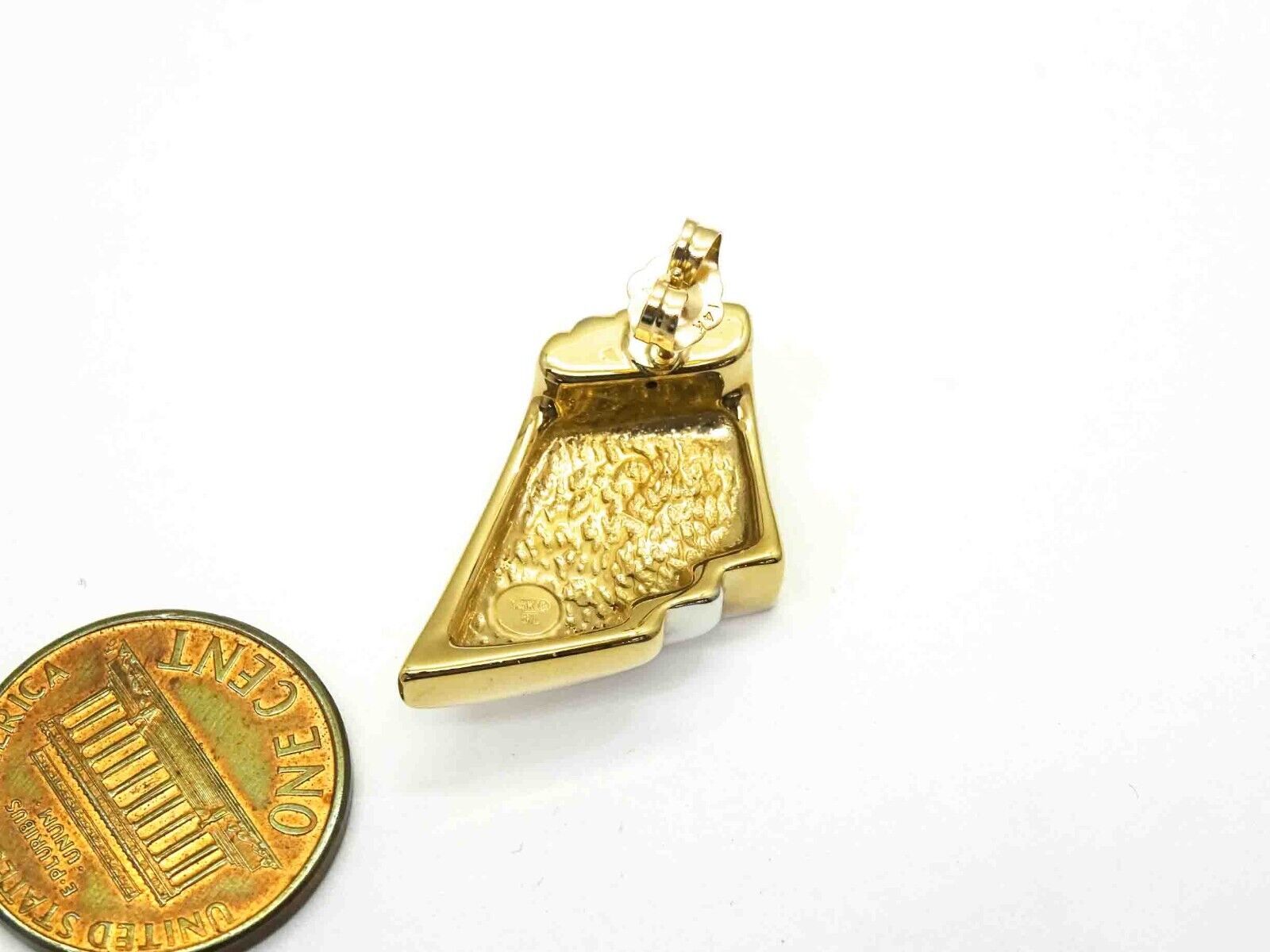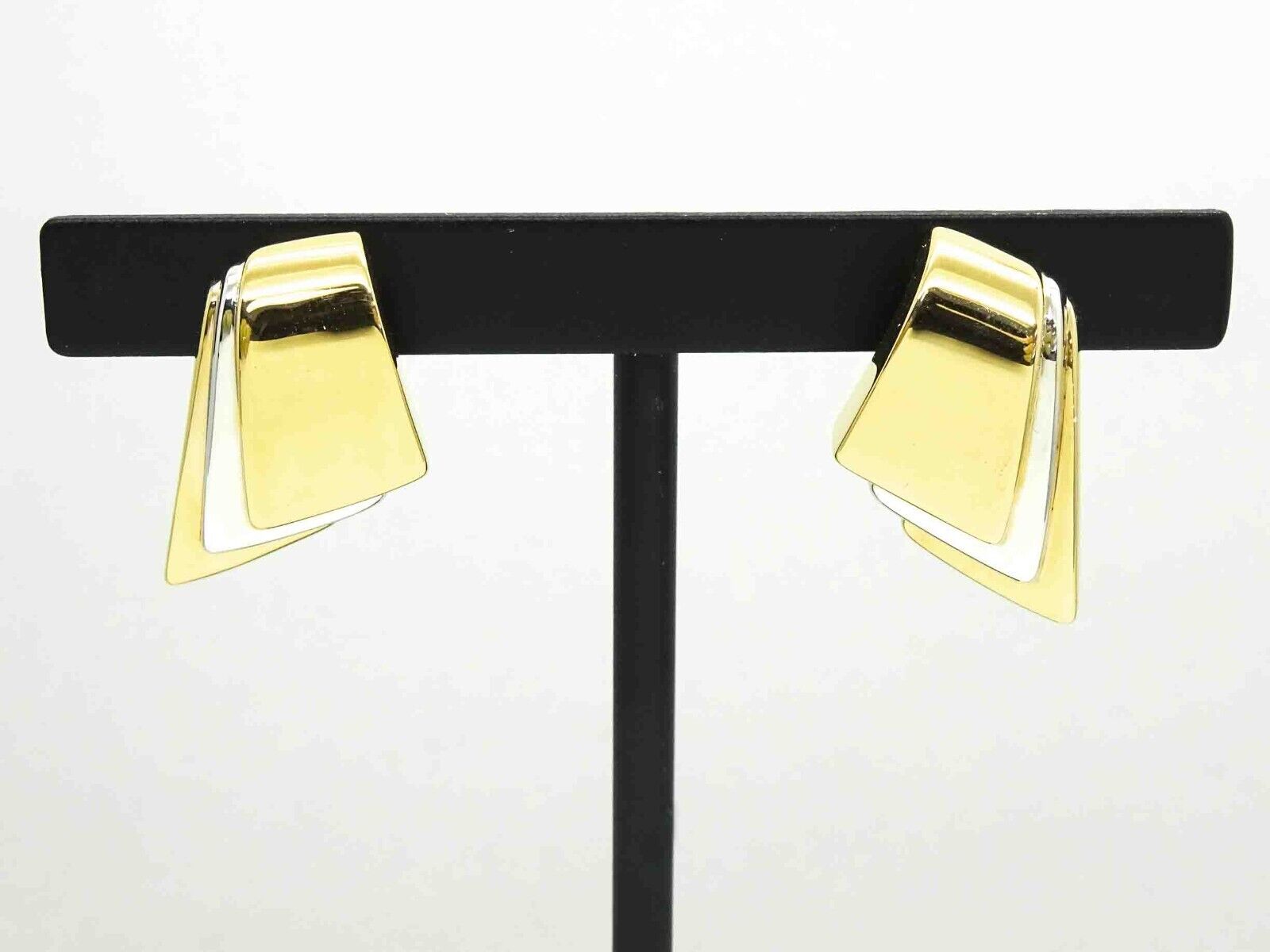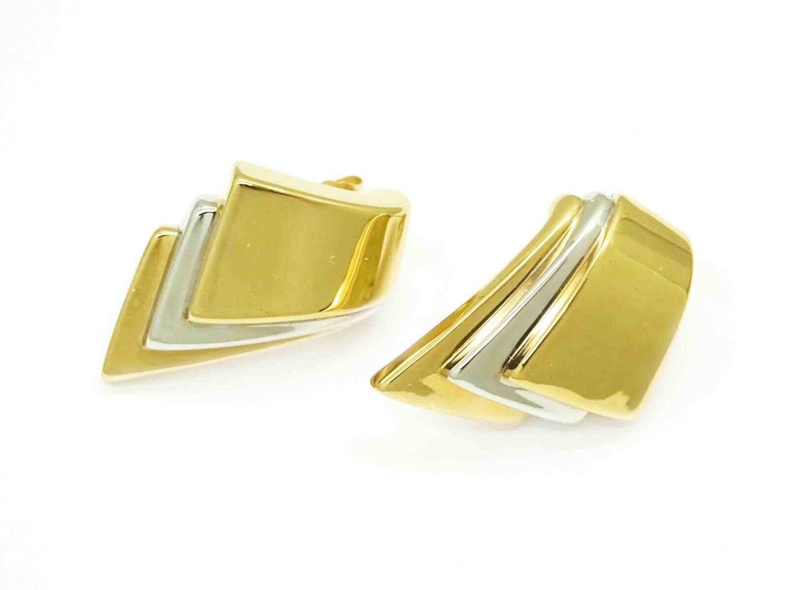 Pair of geometric step design two-tone drop earrings in 14k yellow and white gold.