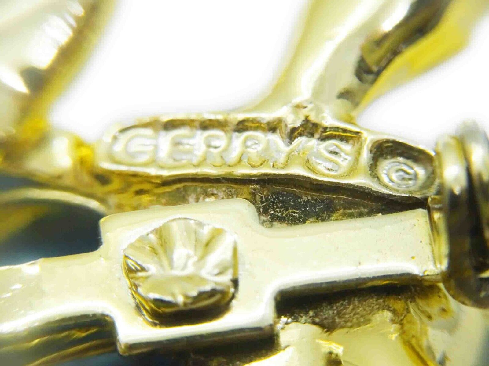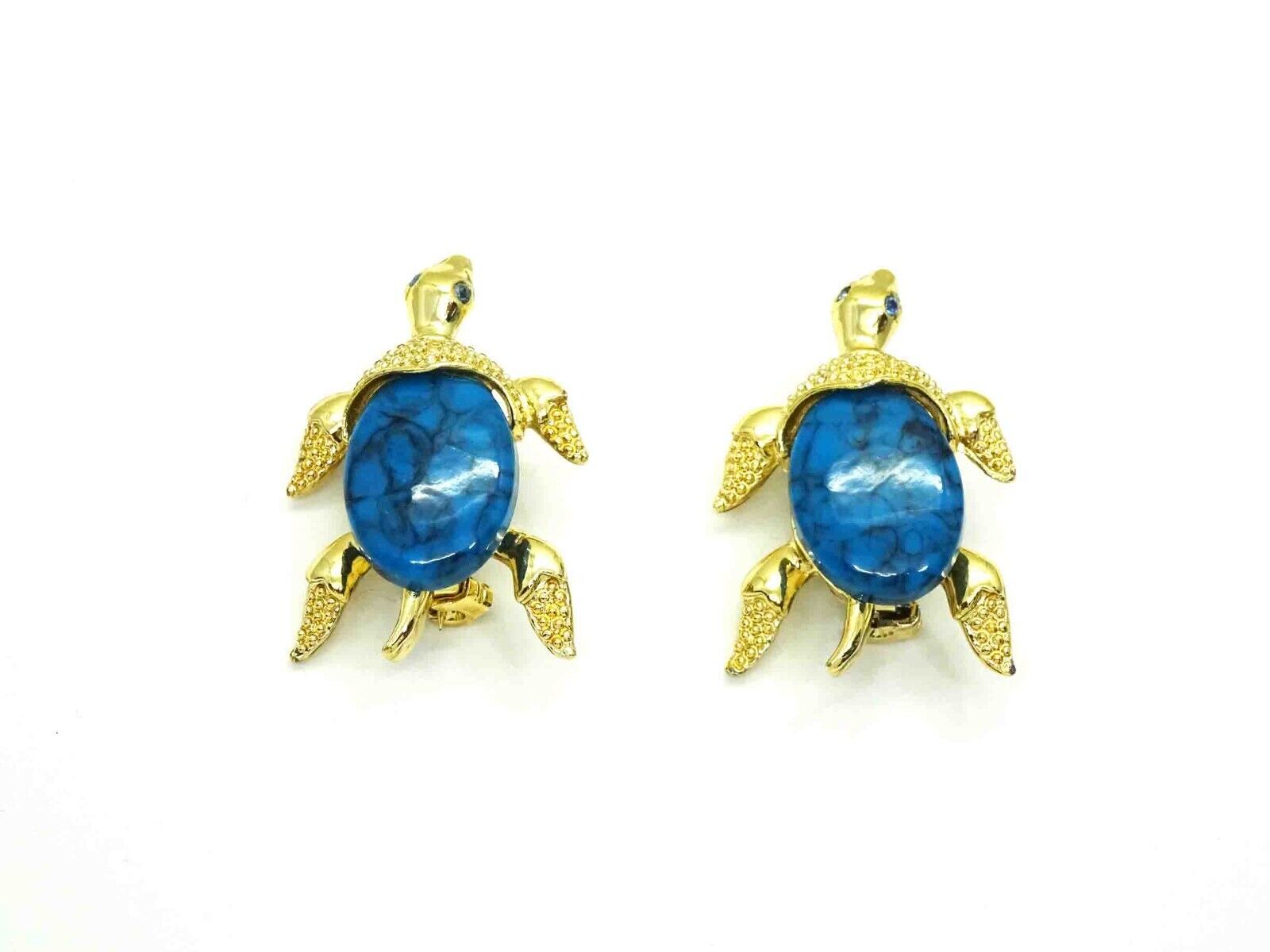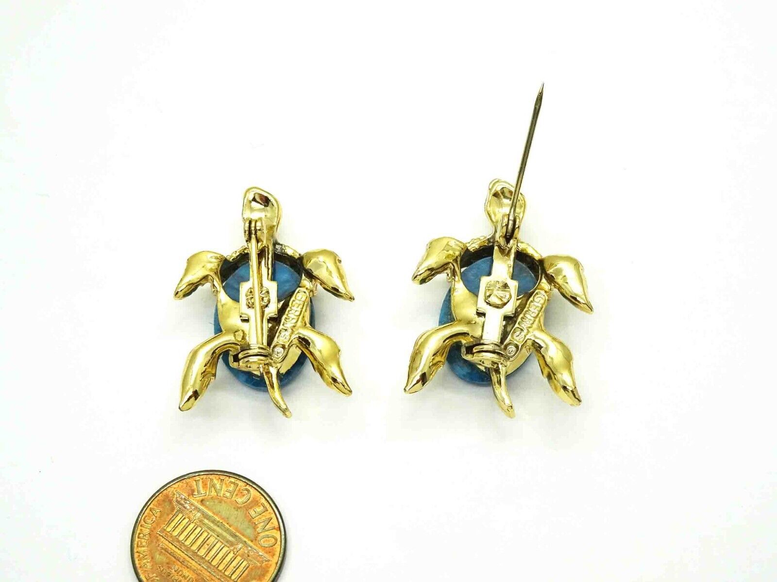 Pair of Gerry's designer costume turtle pins in gold tone metal, set with faux turquoise for shells and blue crystals for eyes.