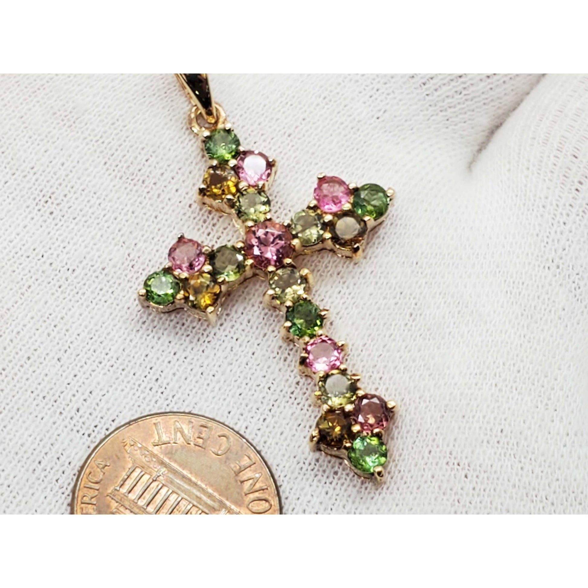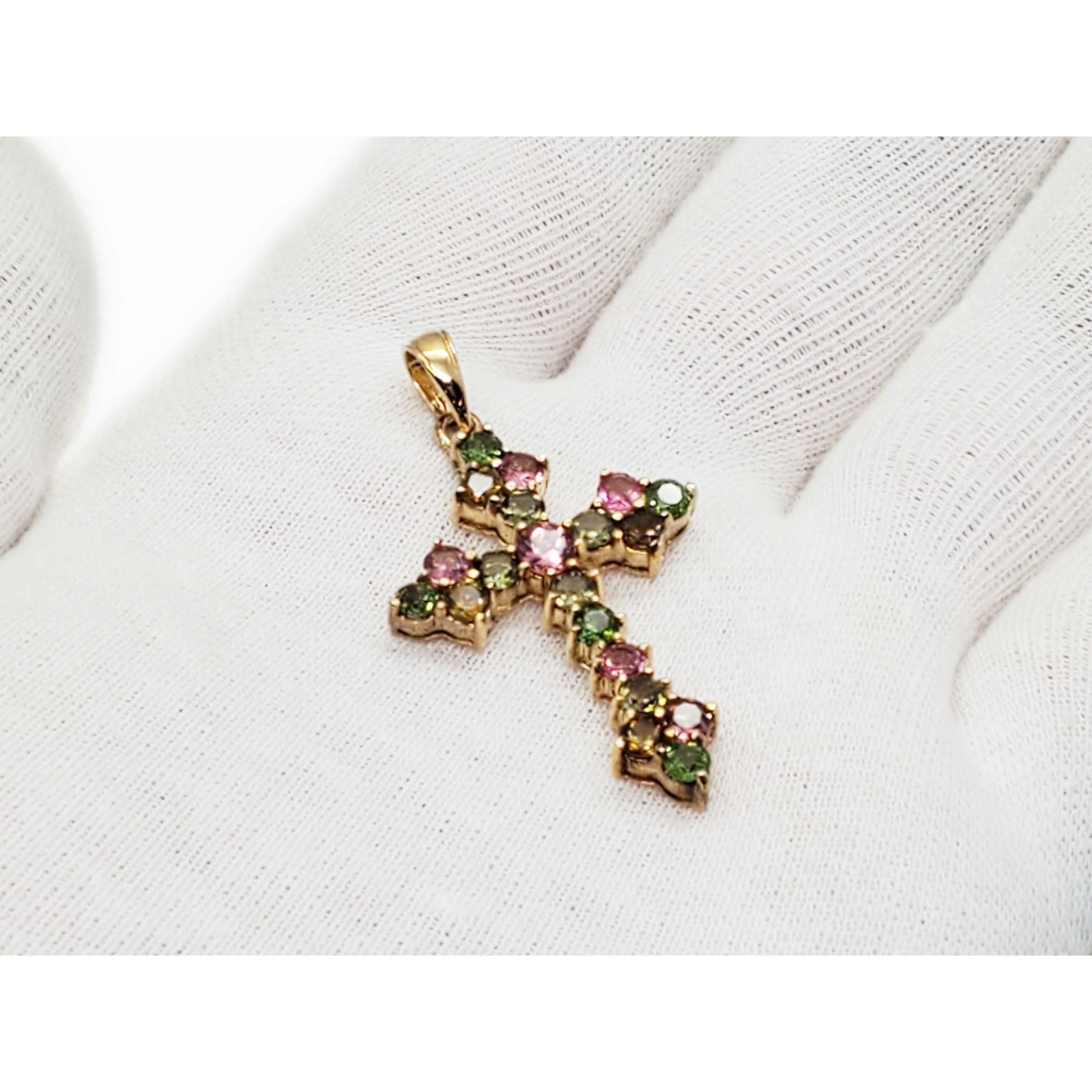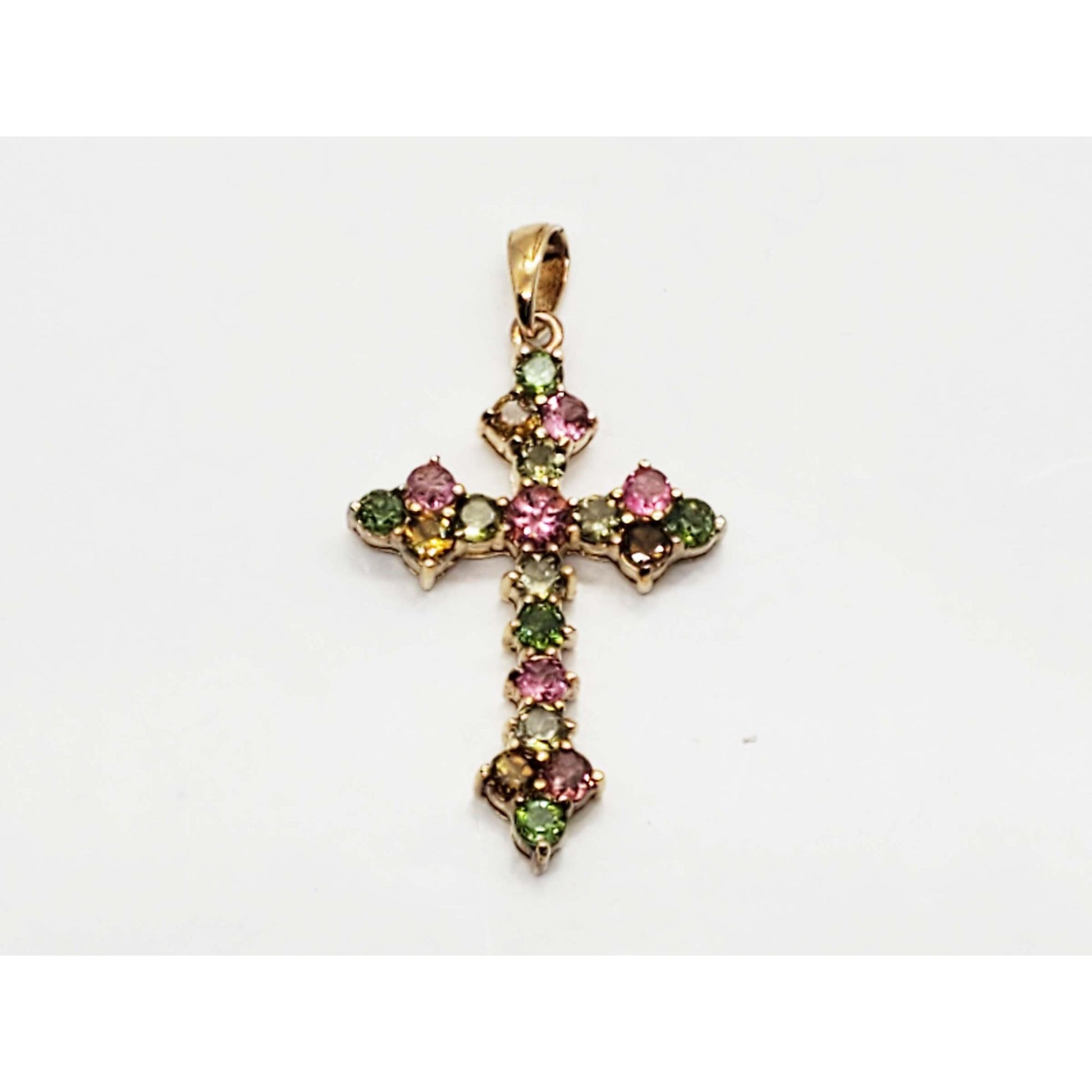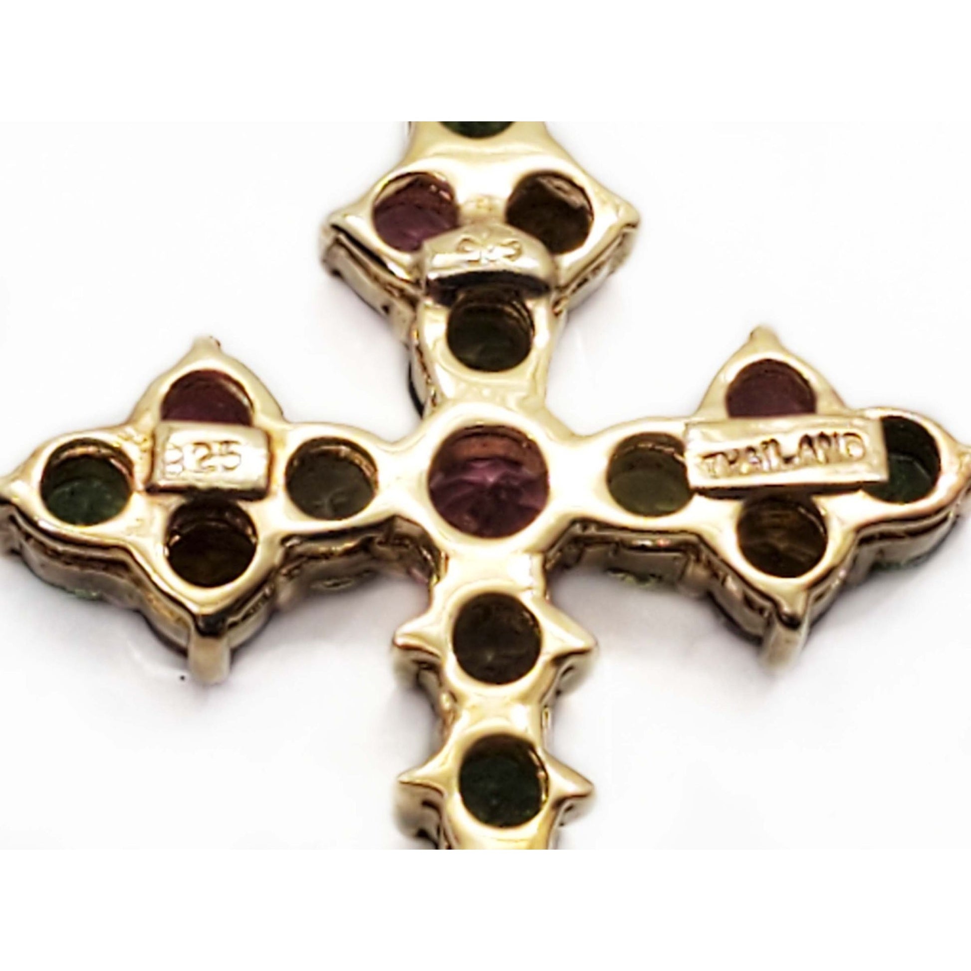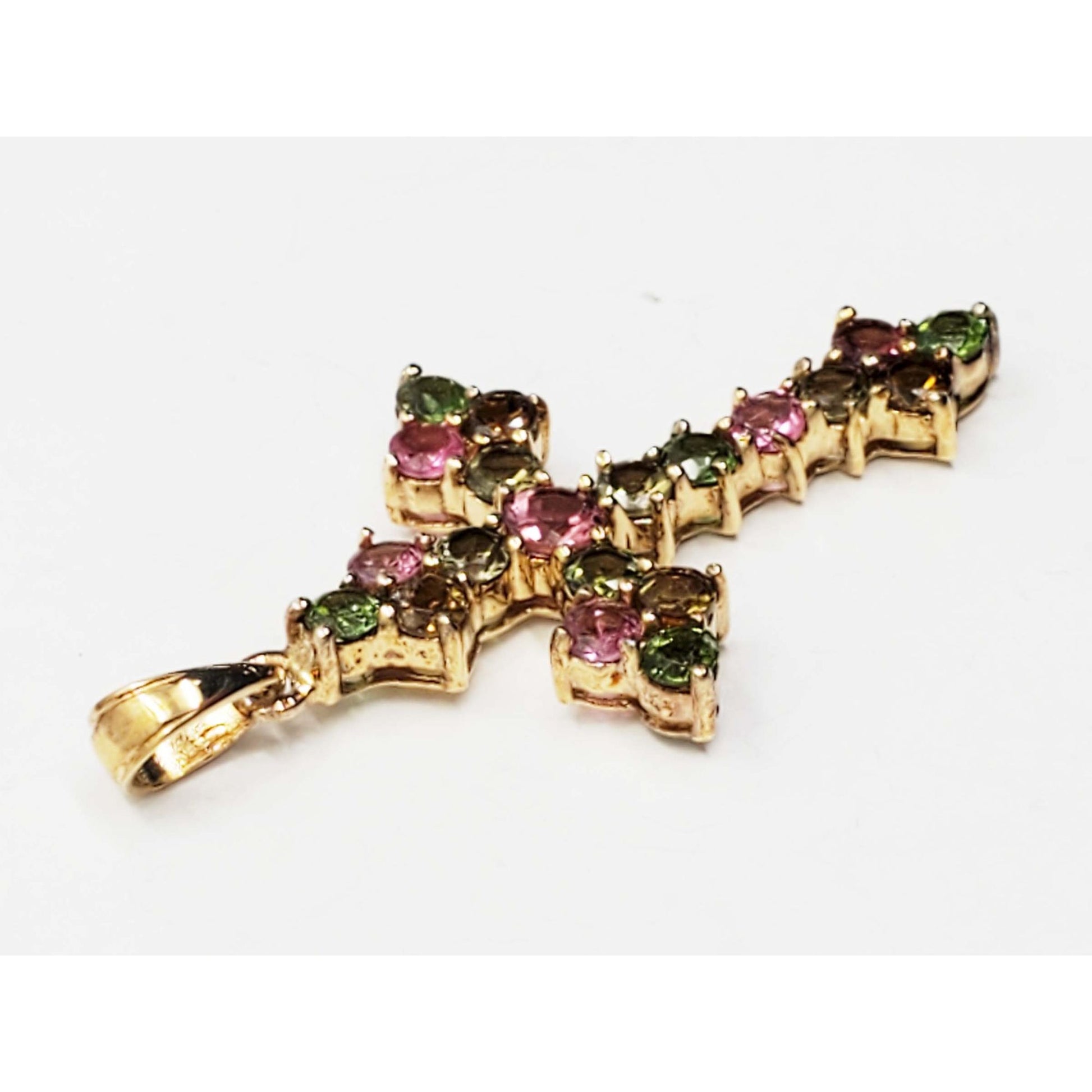 Vermeil sterling silver cross pendant pave set with green tourmalines, pink citrines, and smoky topazes.