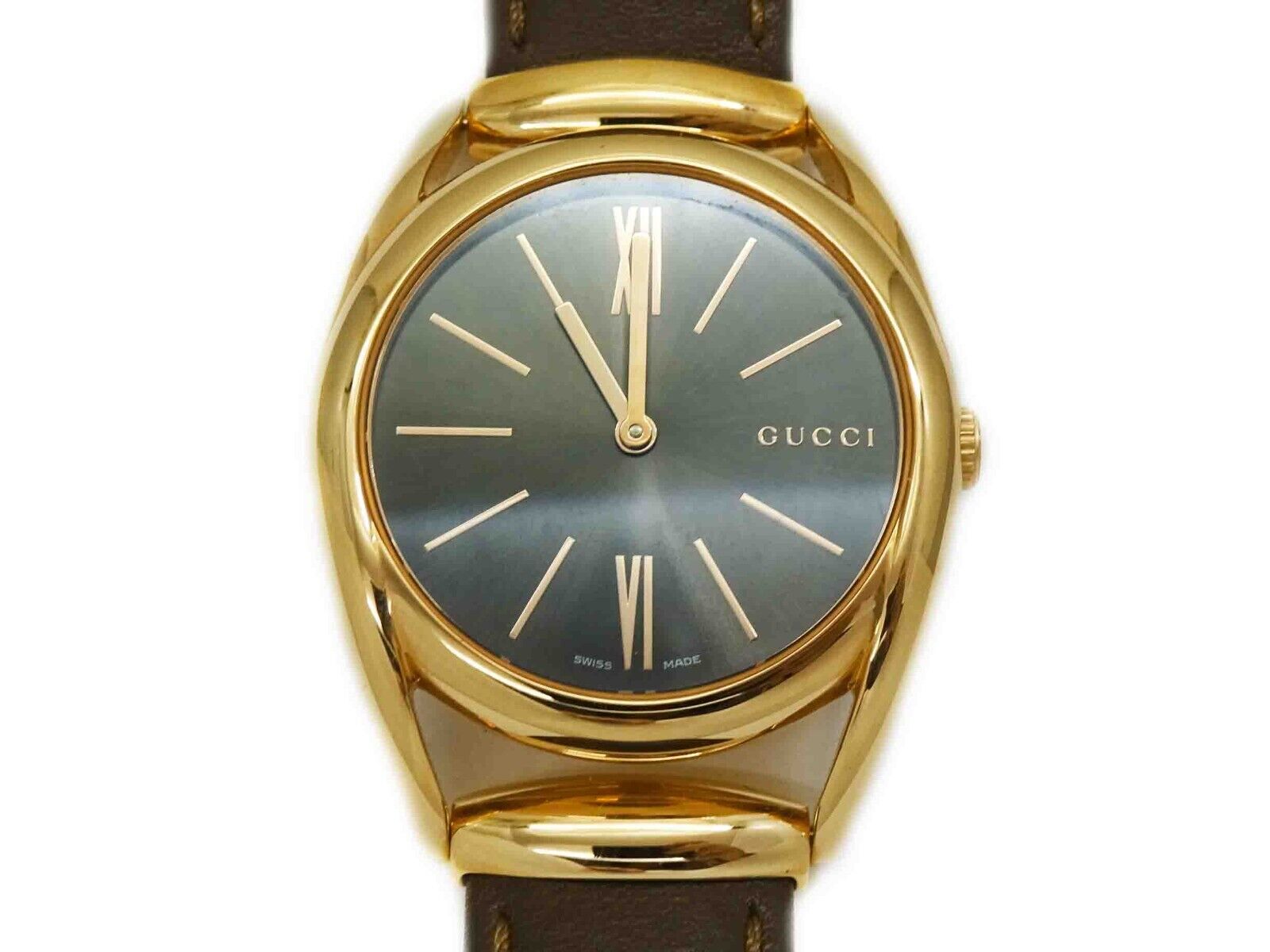 Gucci brand ladies Horsebit style watch in gold-tone stainless steel with genuine dark brown leather straps.