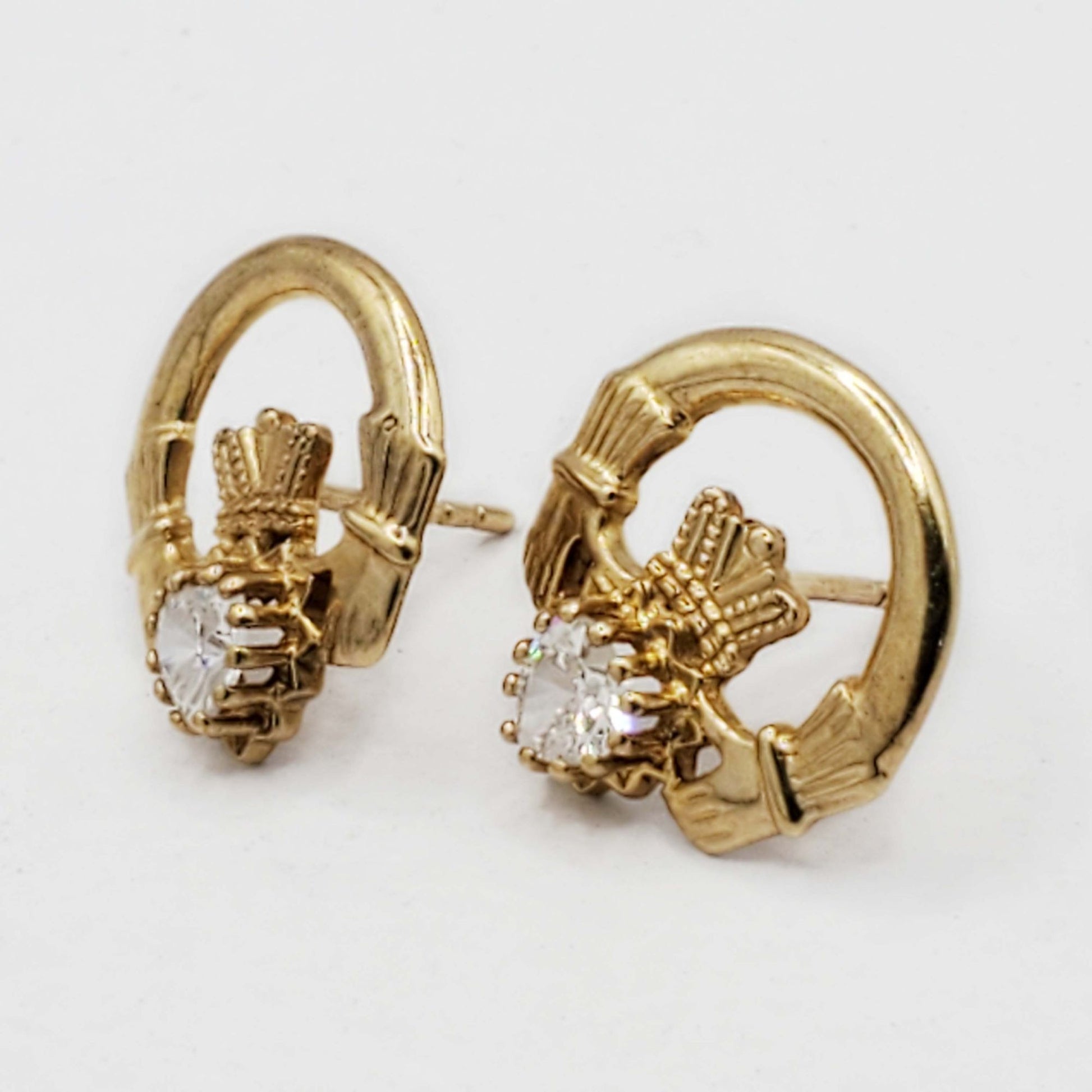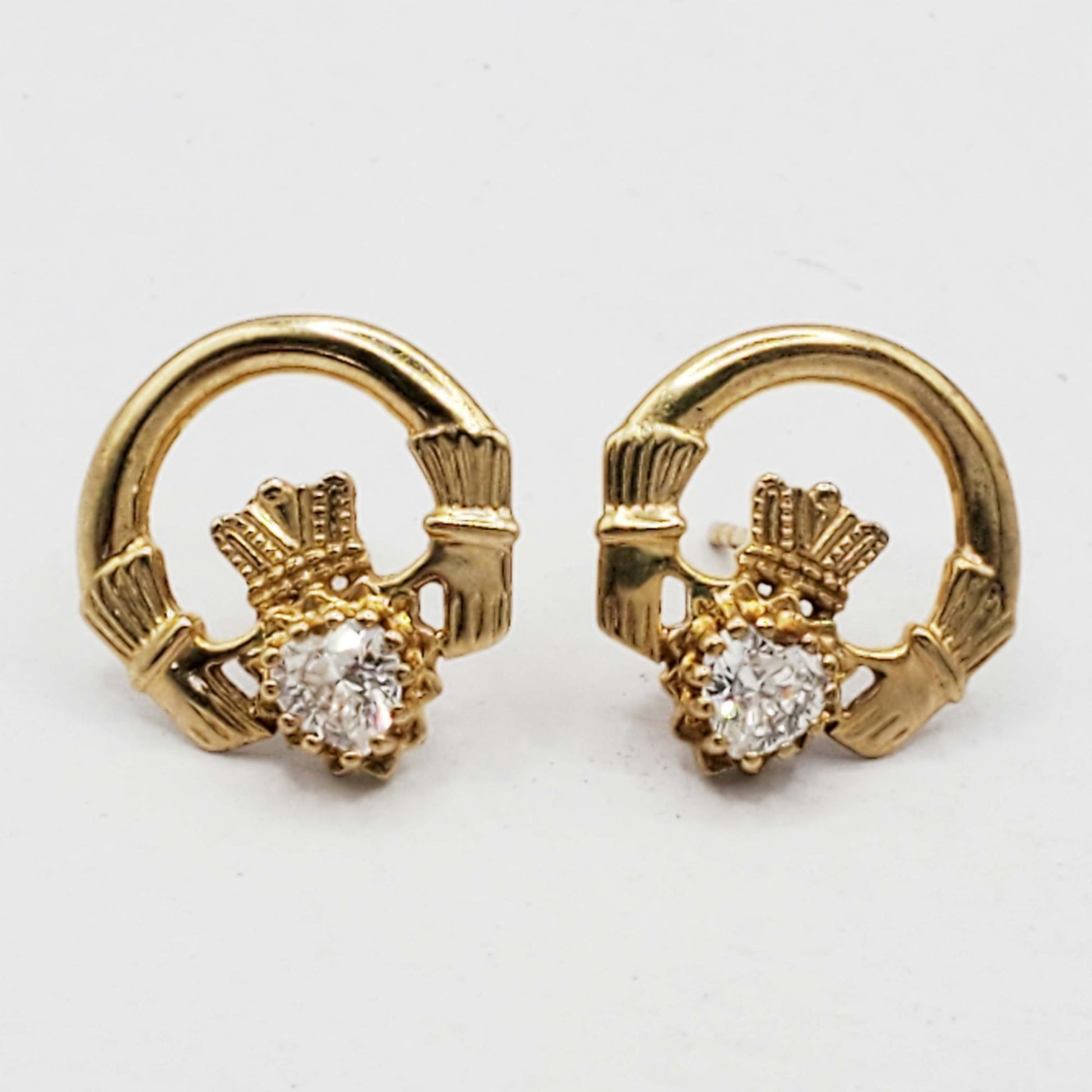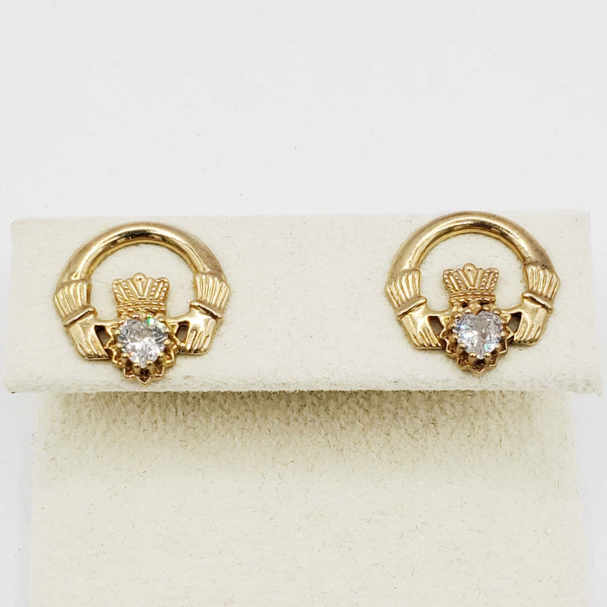 Charming claddagh earrings in 9k gold, each with a pear-cut CZ.