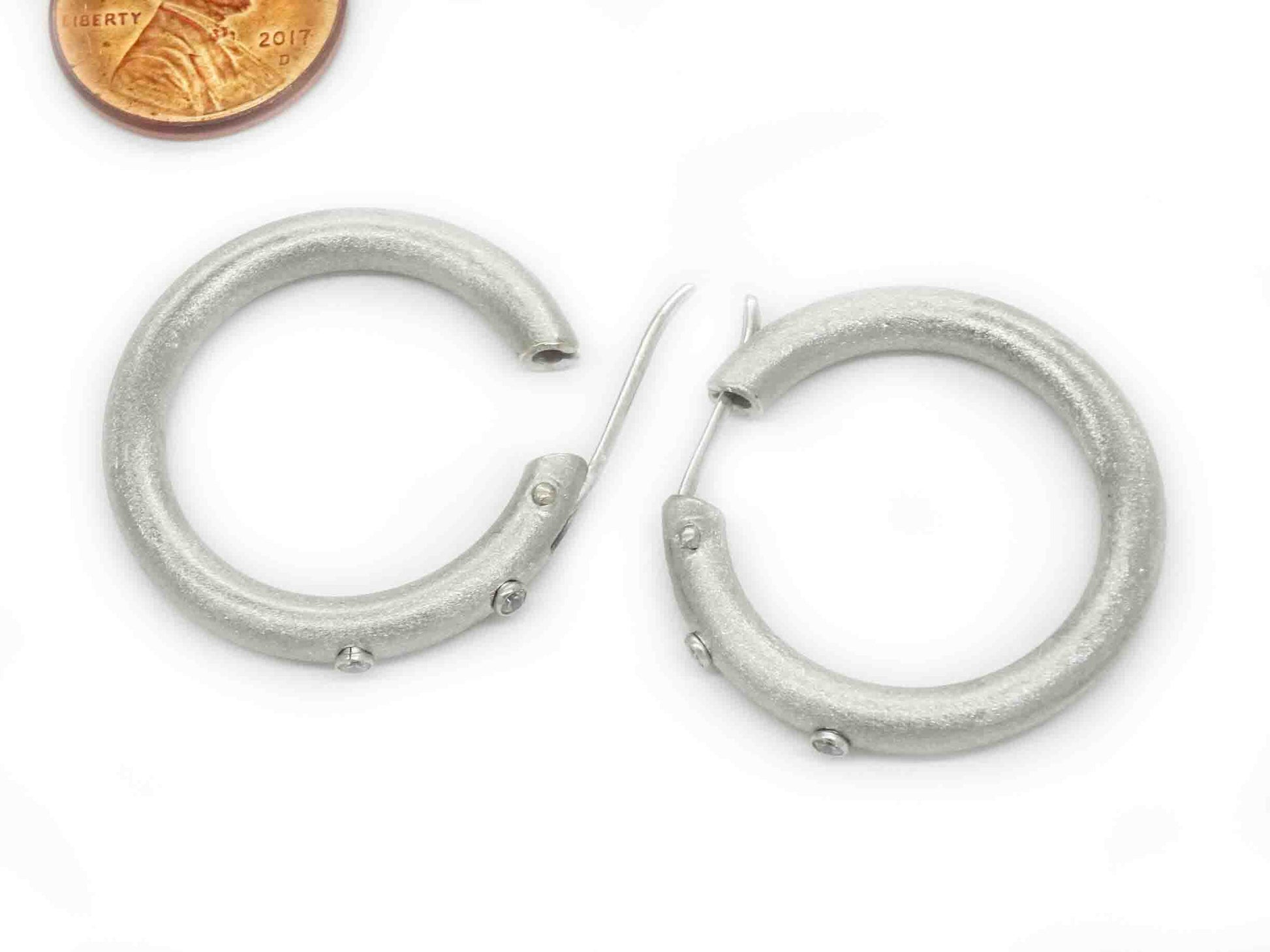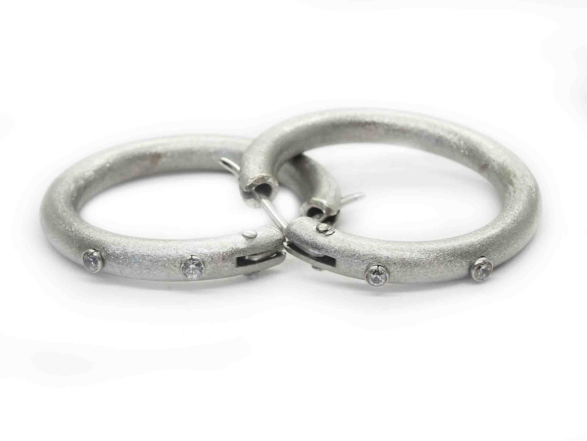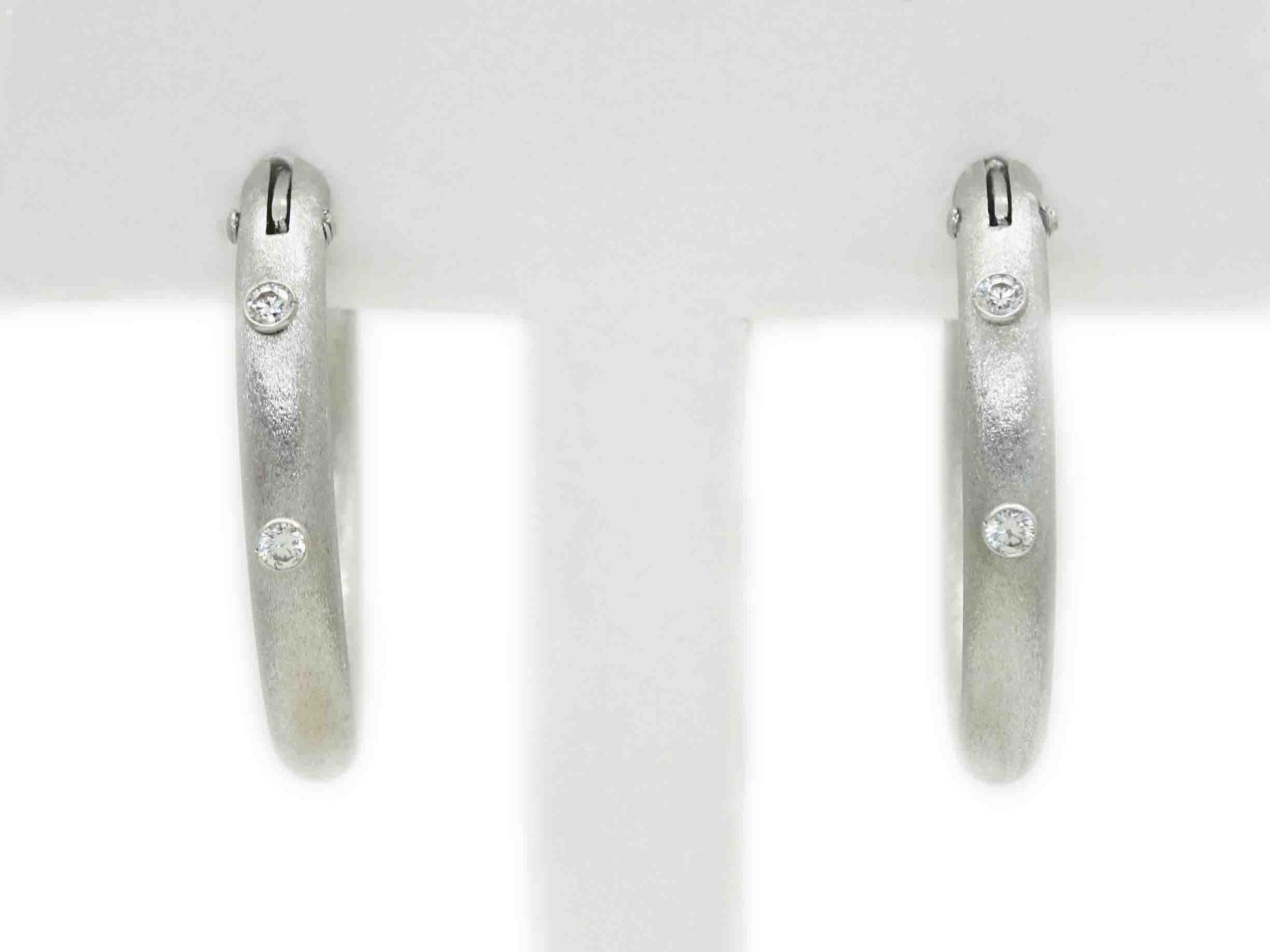 Pair of diamond hoop earrings in 14k white gold, with nice satin finish.