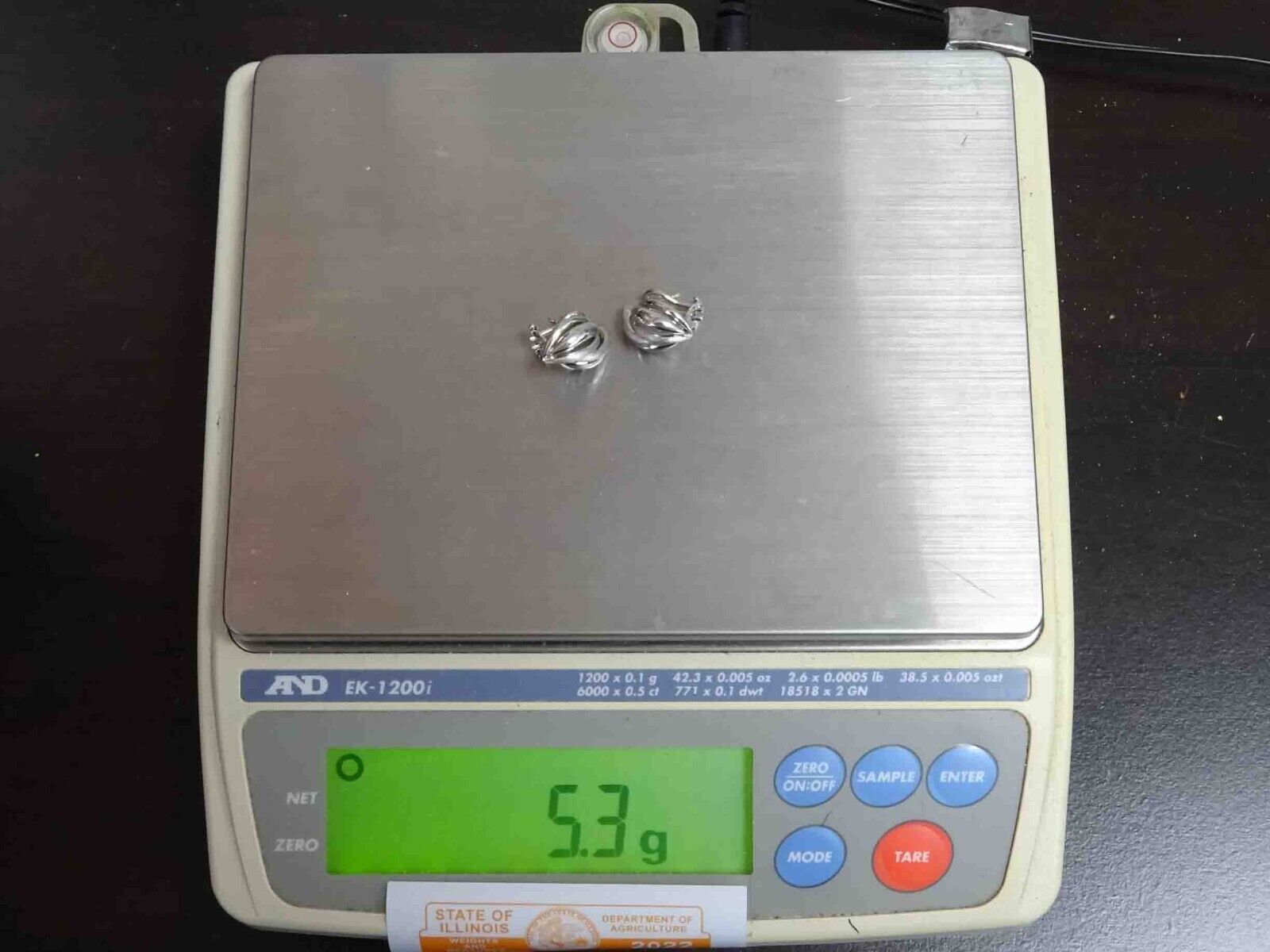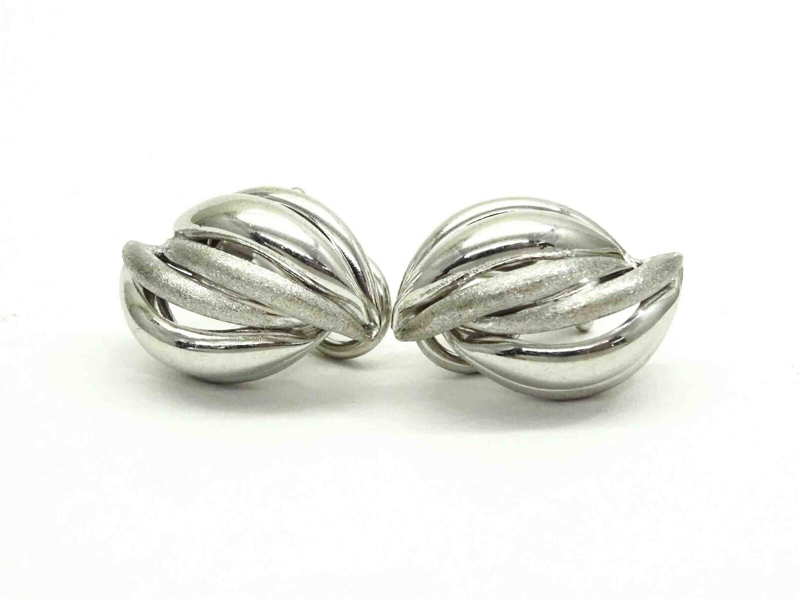 Pair of openwork swirl design omega earrings in 14k white gold.