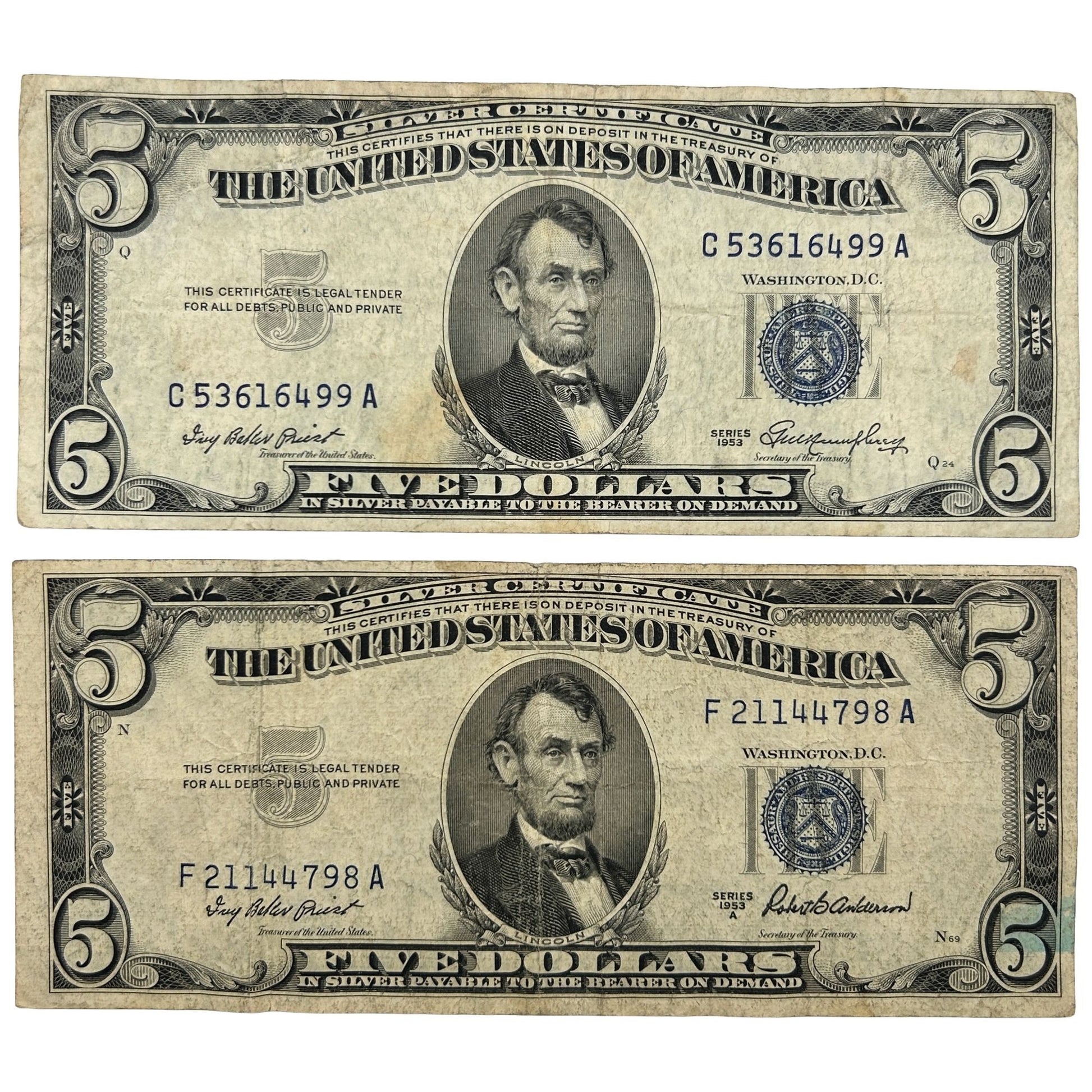 LOT OF 2 1953-A & 1953 Blue Seal FRN Banknotes Silver Certificates - Circulated