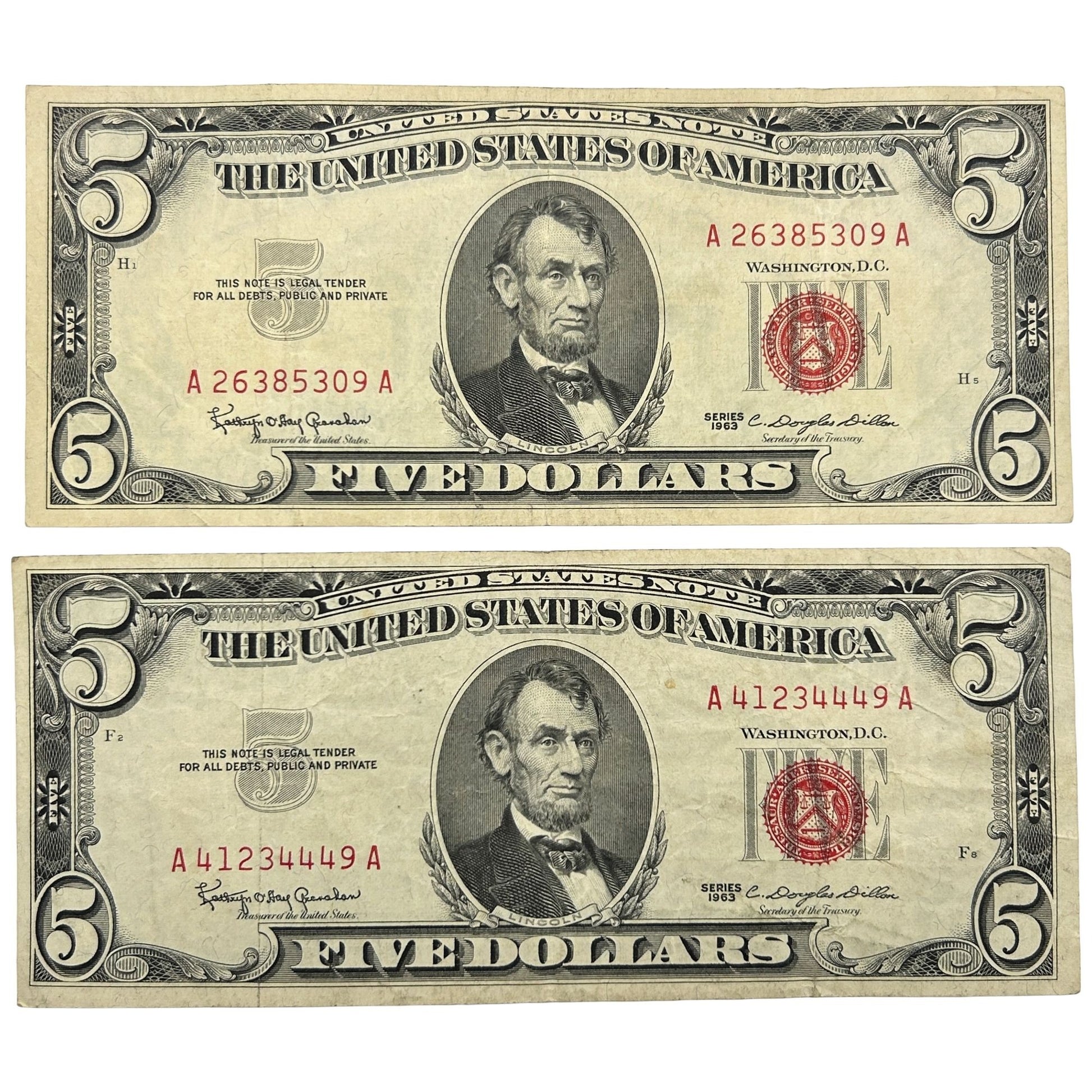 LOT OF 2 1963 $5 Five Dollar Red Seal US Note Granaham Dillon