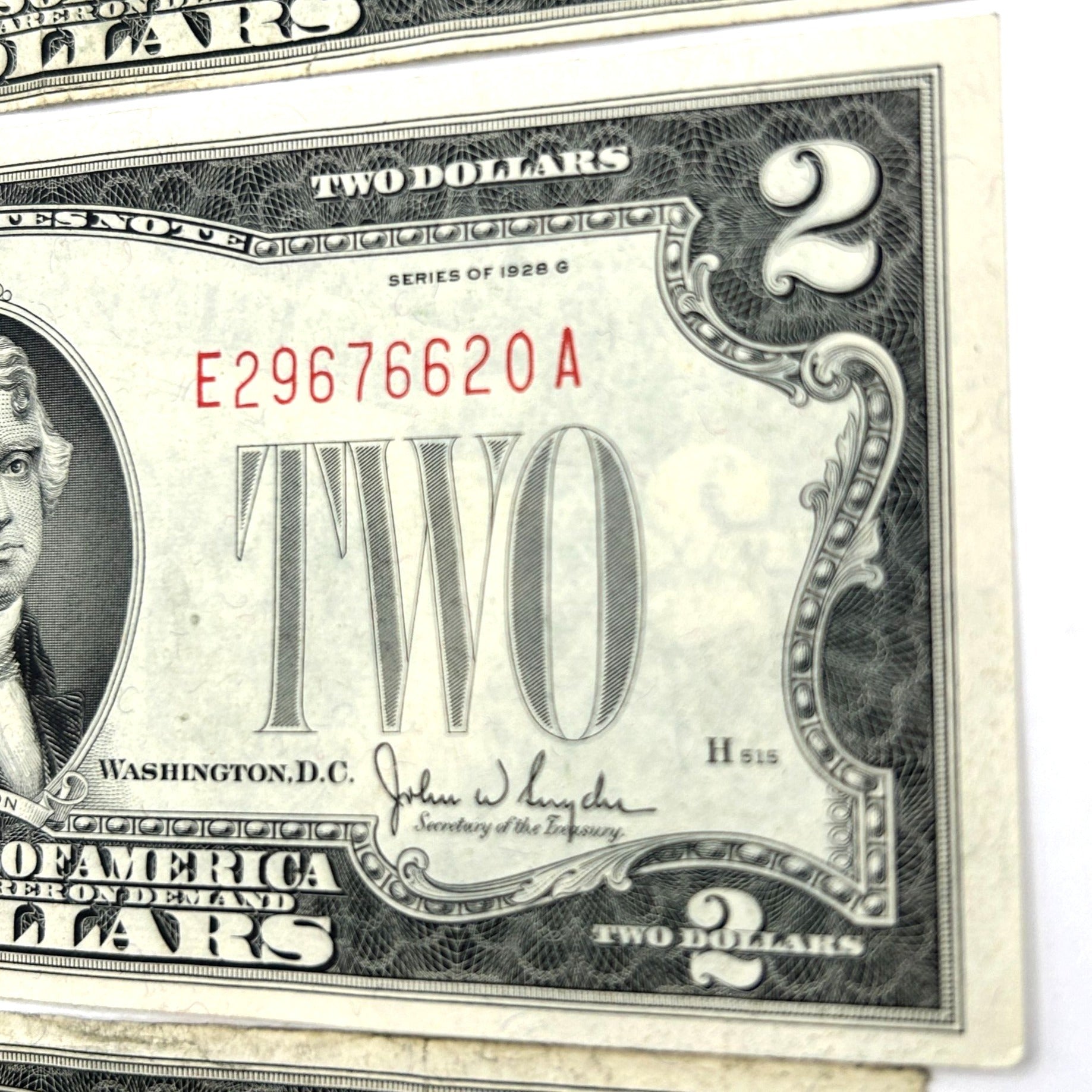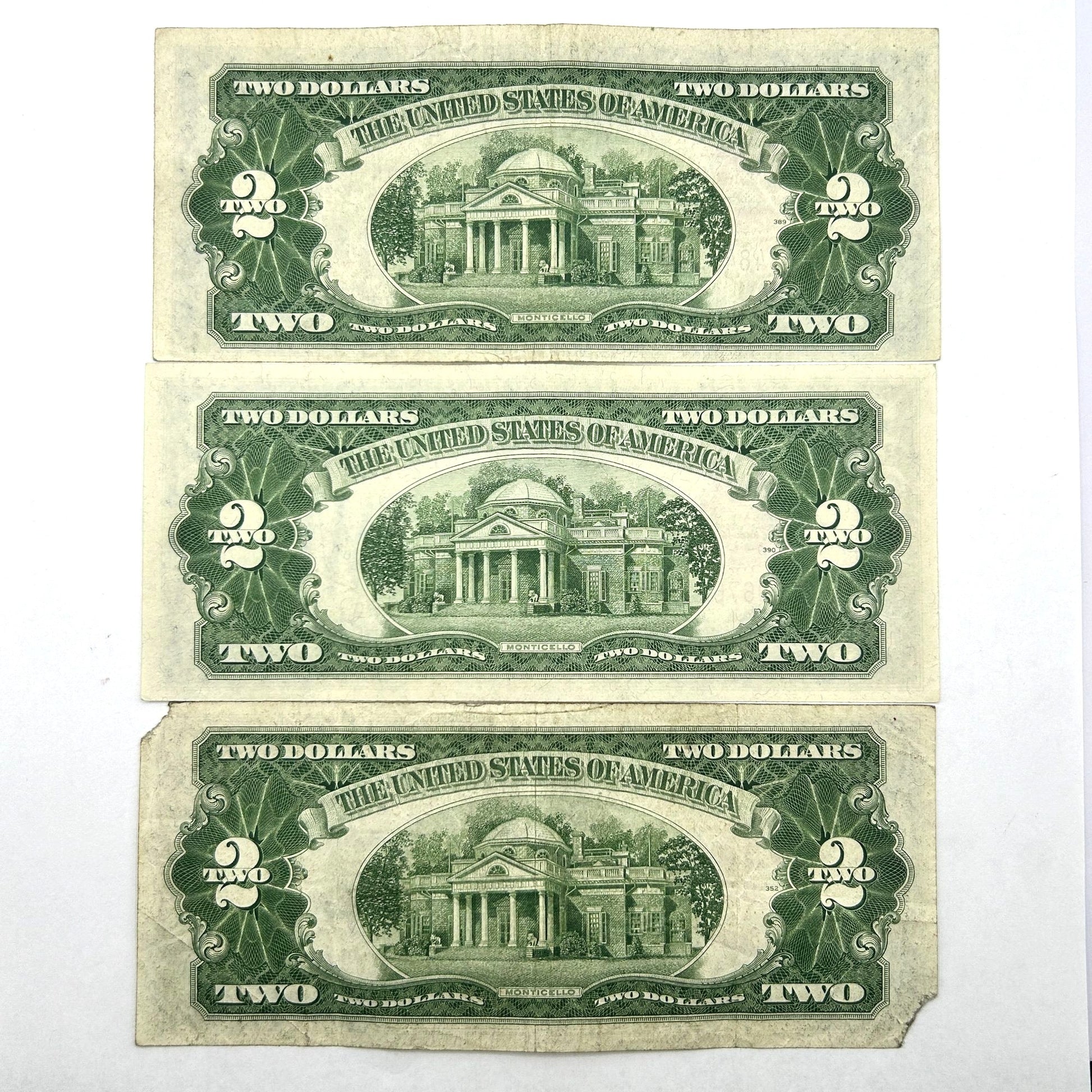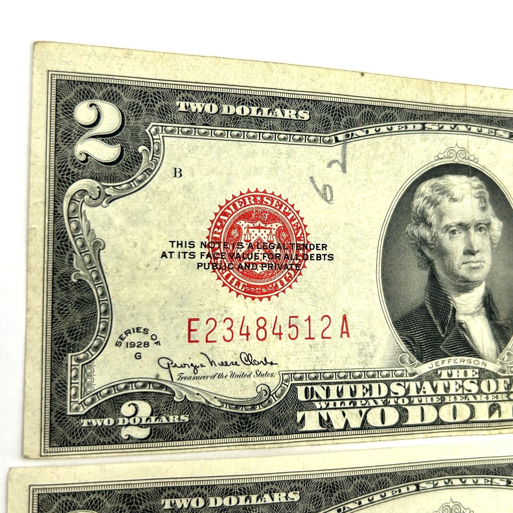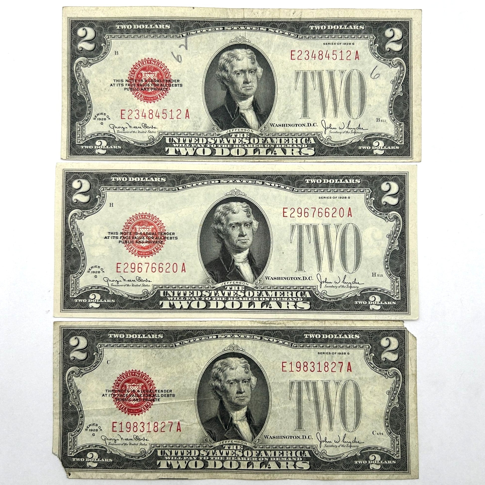 LOT OF 3 Series of 1928-G $2 Two Dollar Bill - Red Seal, Circulated, Slightly OC