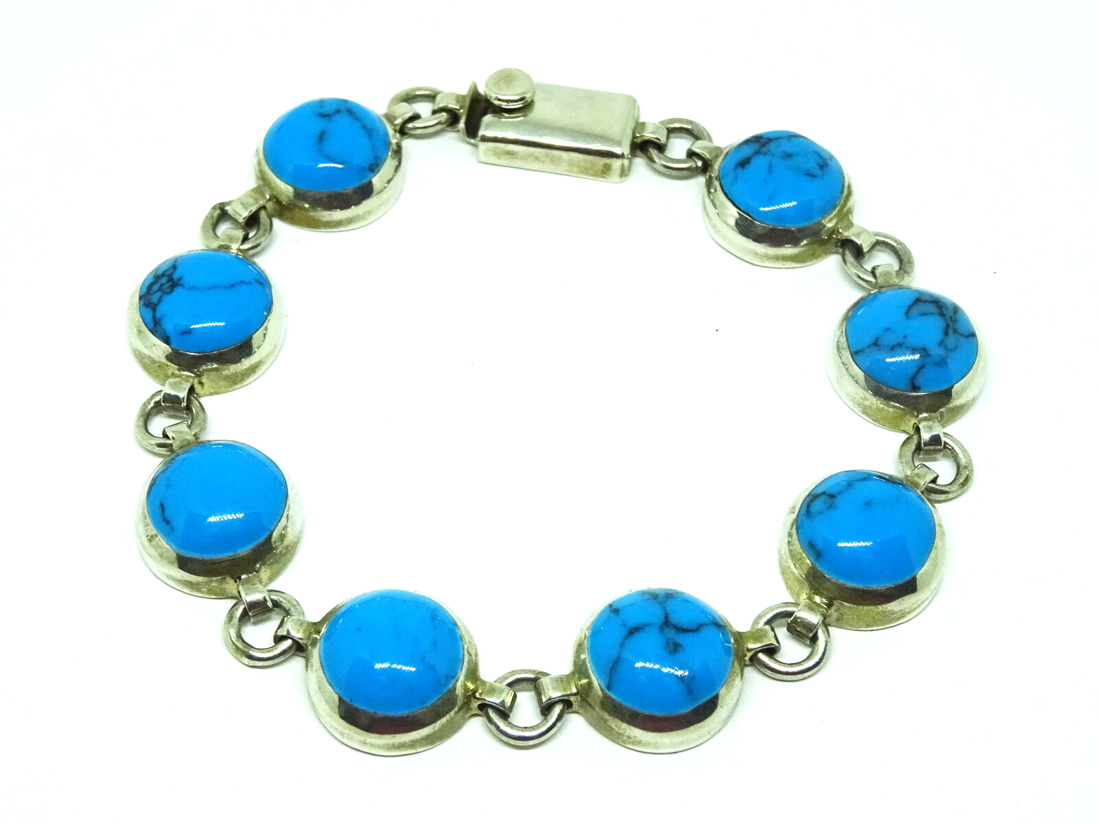 Mexico sterling silver link bracelet, set with 8 round turquoise cabochons about 12mm wide.