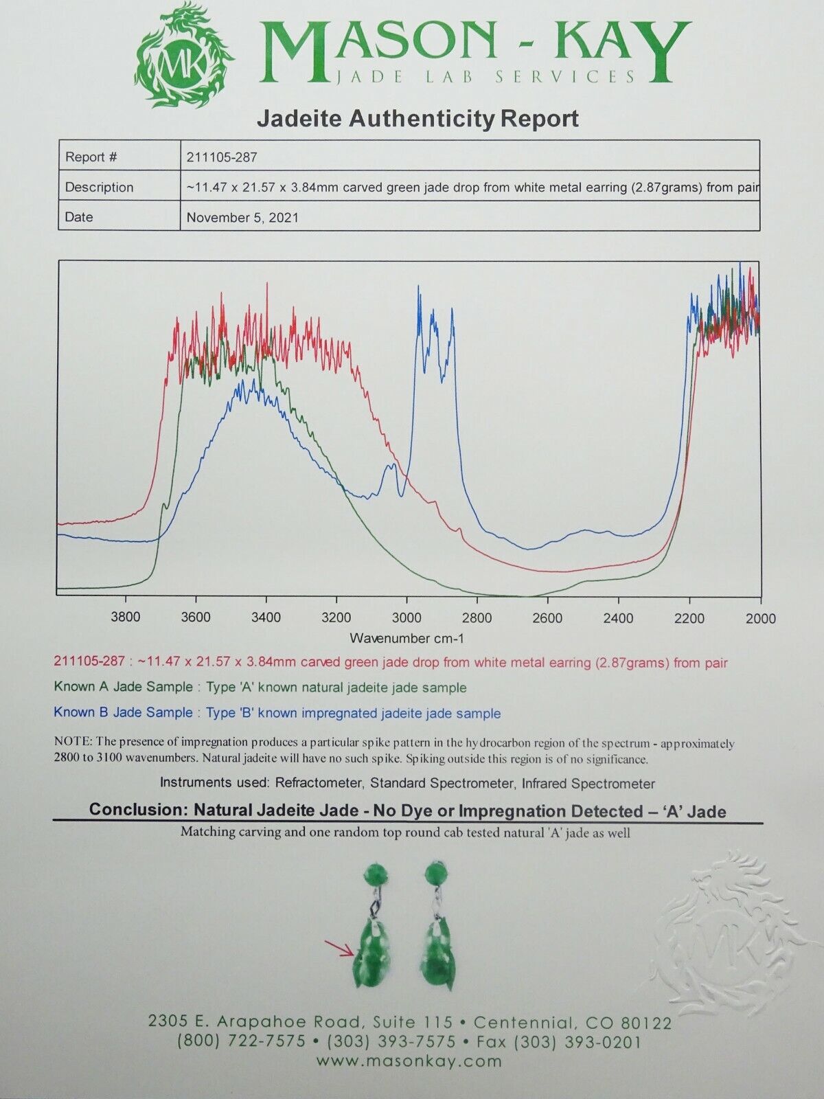 Mid Century Natural Jadeite Dangle Earrings Rhodium plated over sterling silver w/ Mason-May Report Reports