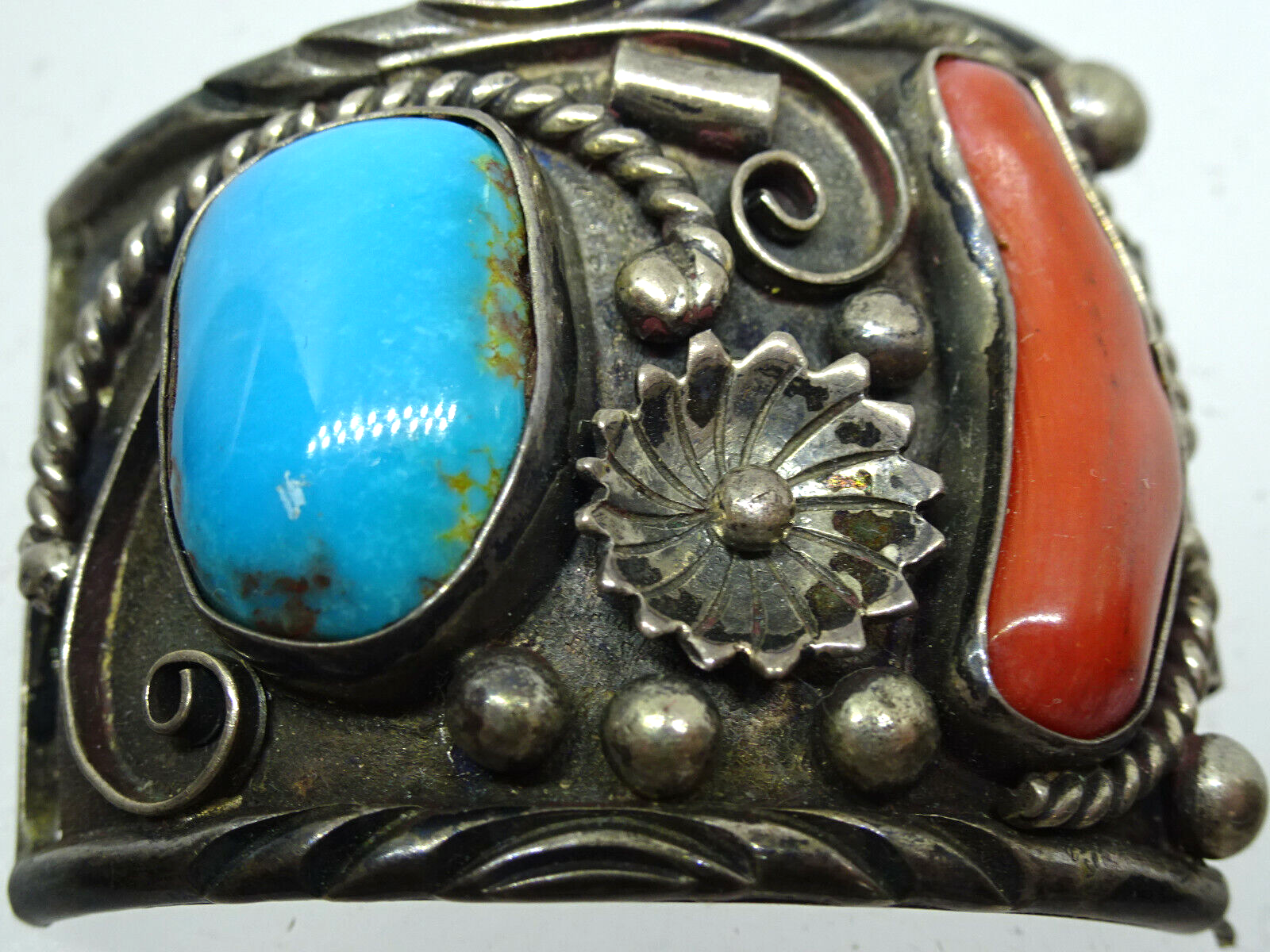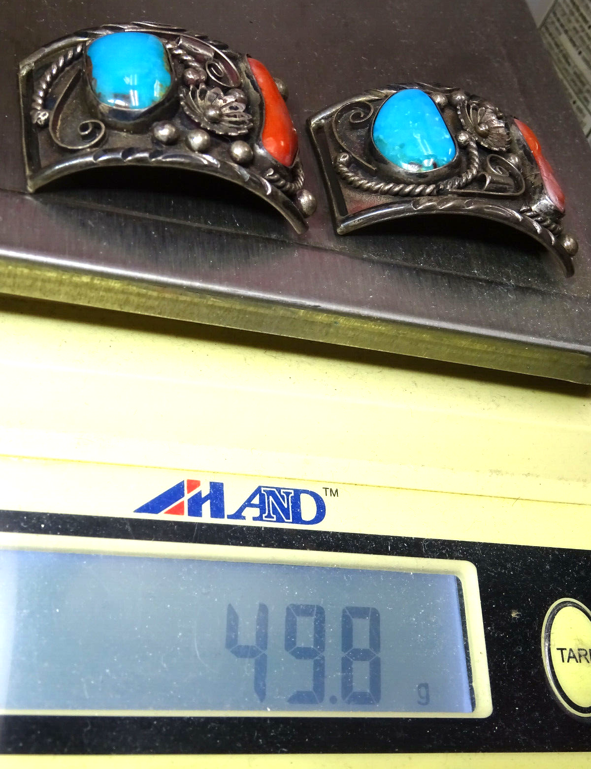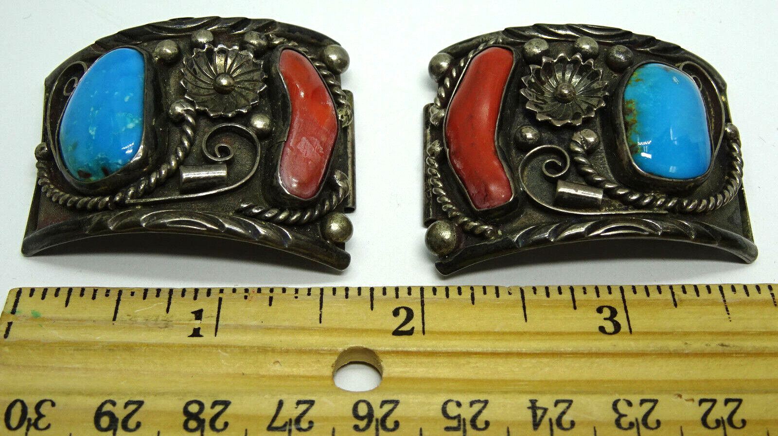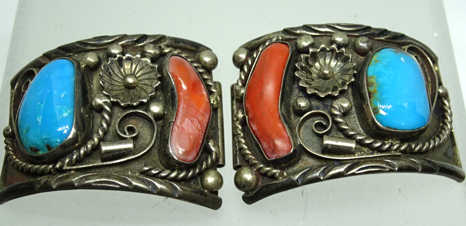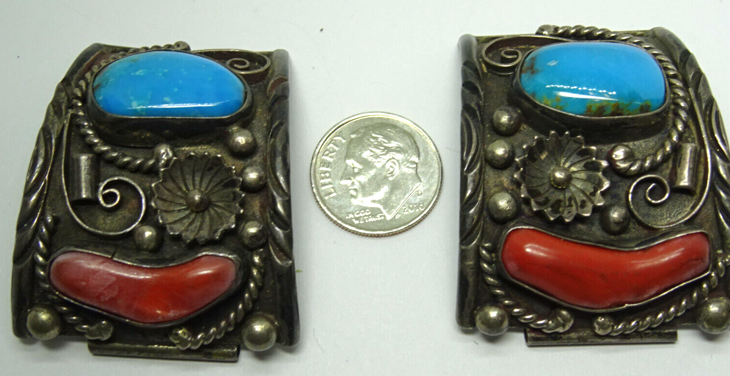 Native American Old Pawn Navajo Big Turquoise & Coral Sterling Watch Tips, 49.8g