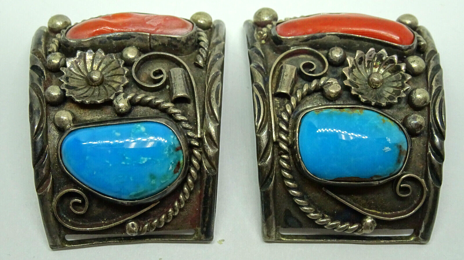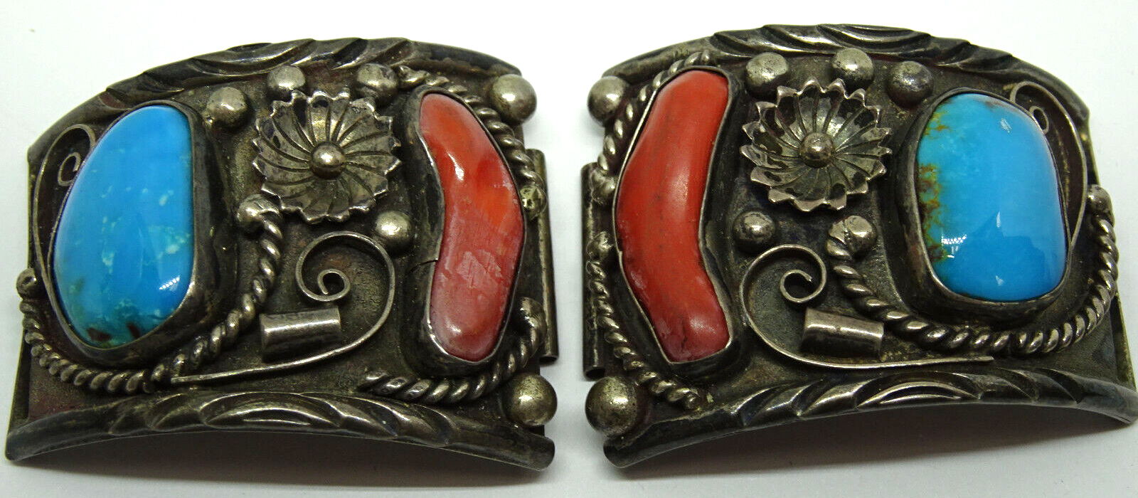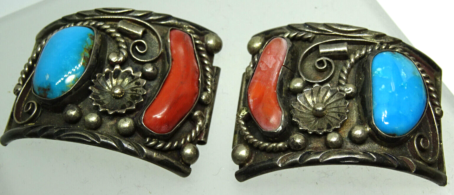 Old Pawn Vintage Genuine Navajo Turquoise & Coral Sterling Silver Watch Tips