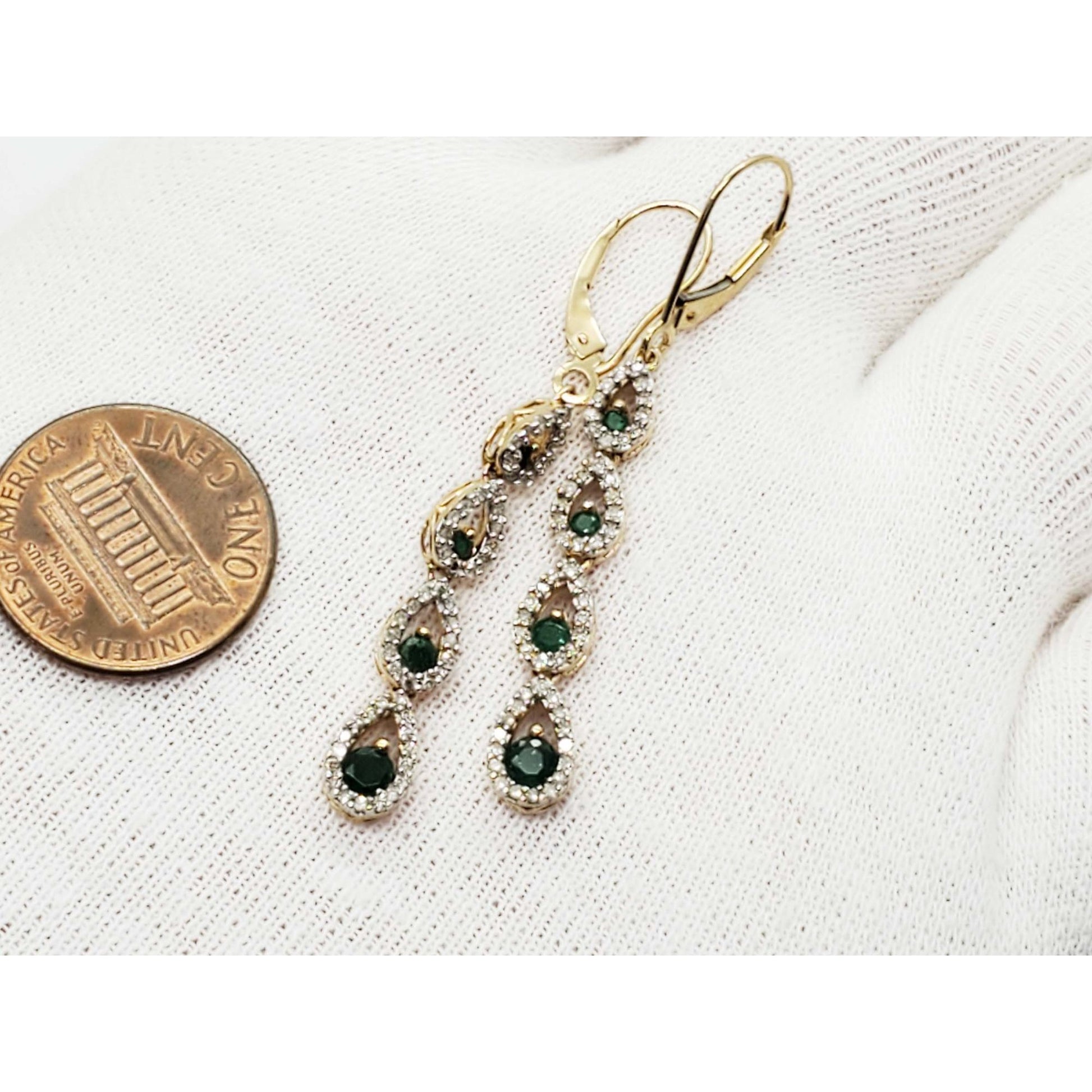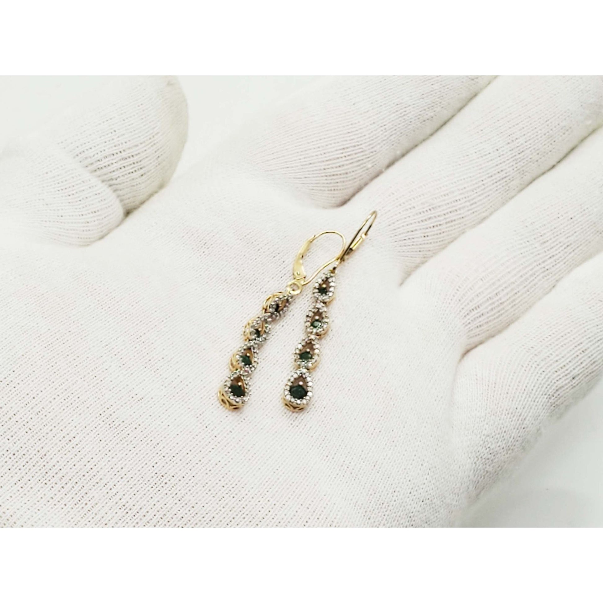 Pair of emerald and diamond dangle earrings in 14k yellow gold.