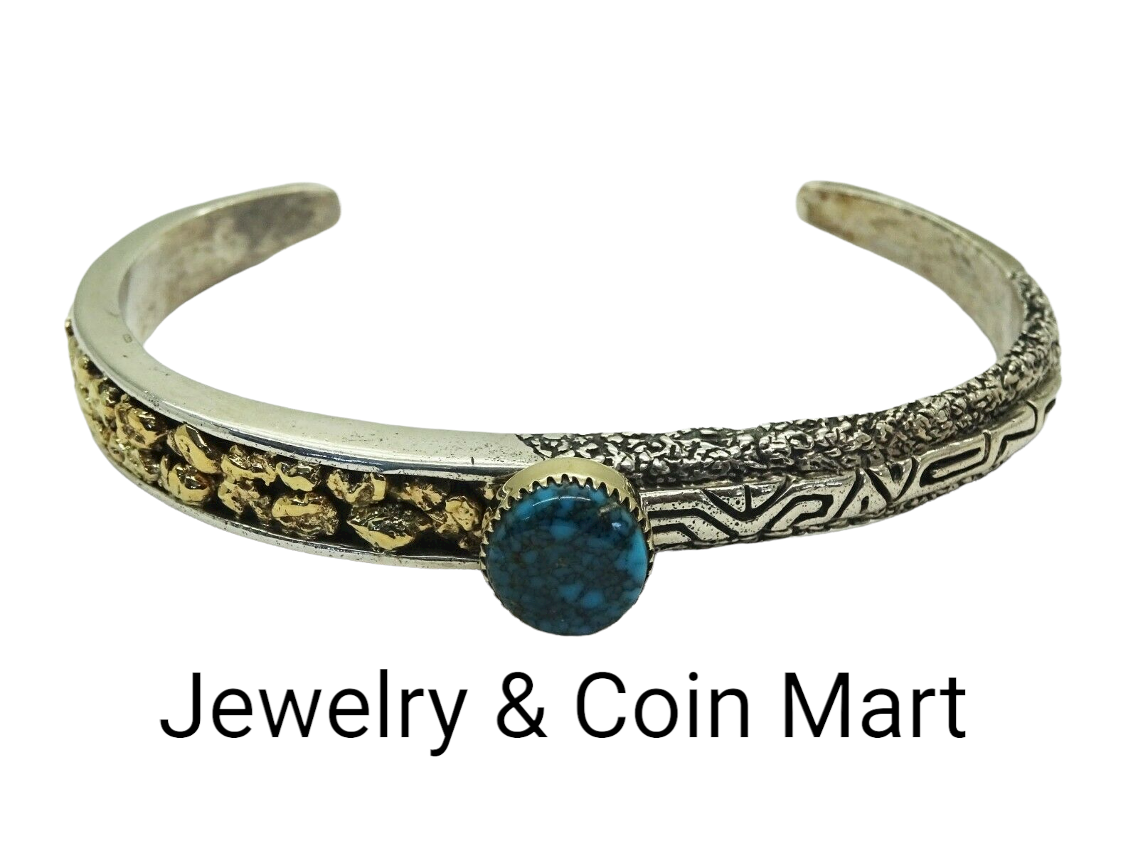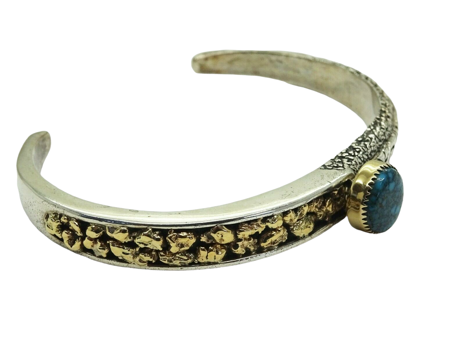 Natural spiderweb turquoise round cabochon 9mm wide, set in solid sterling silver cuff bracelet with 14k gold nugget accents on one side of cuff bracelet.