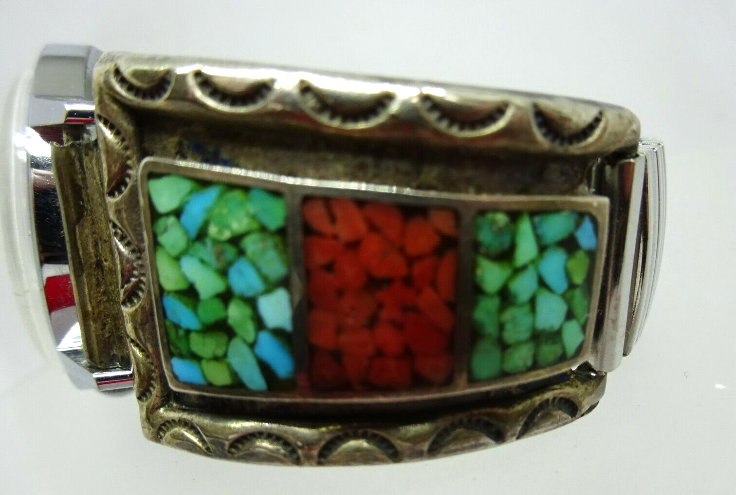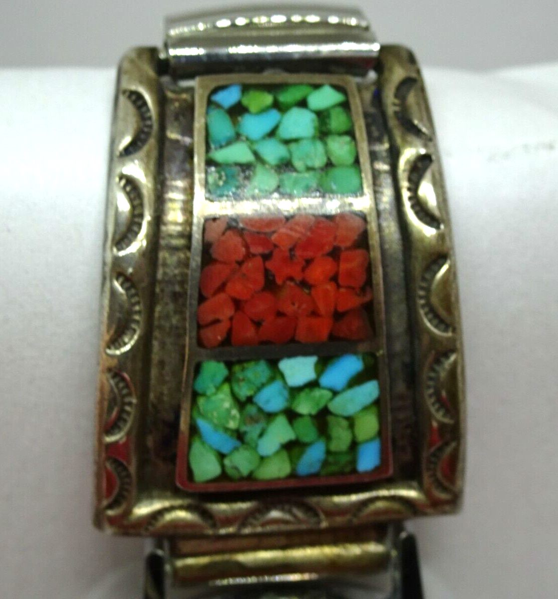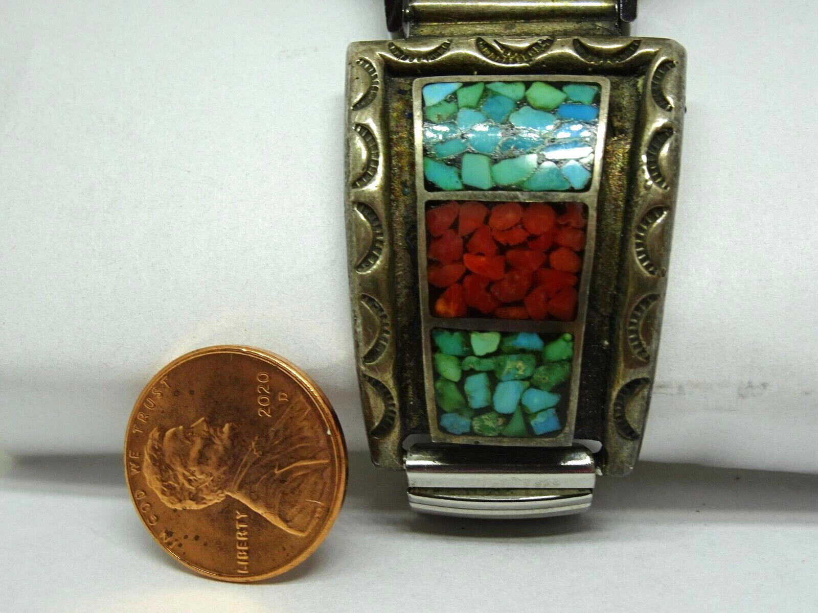 Old Pawn Navajo Big Turquoise & Coral Inlay Sterling Watch Tips Signed
