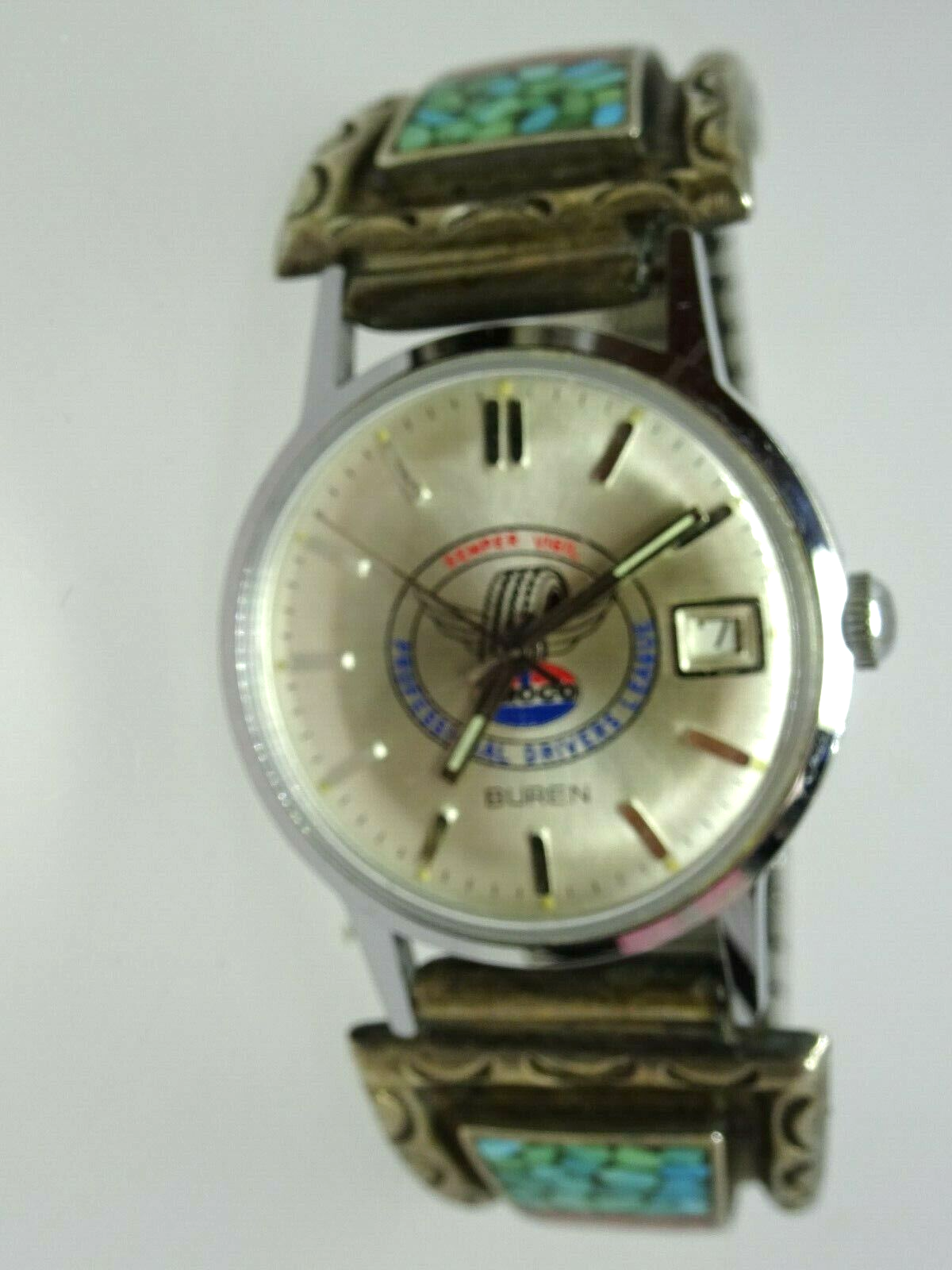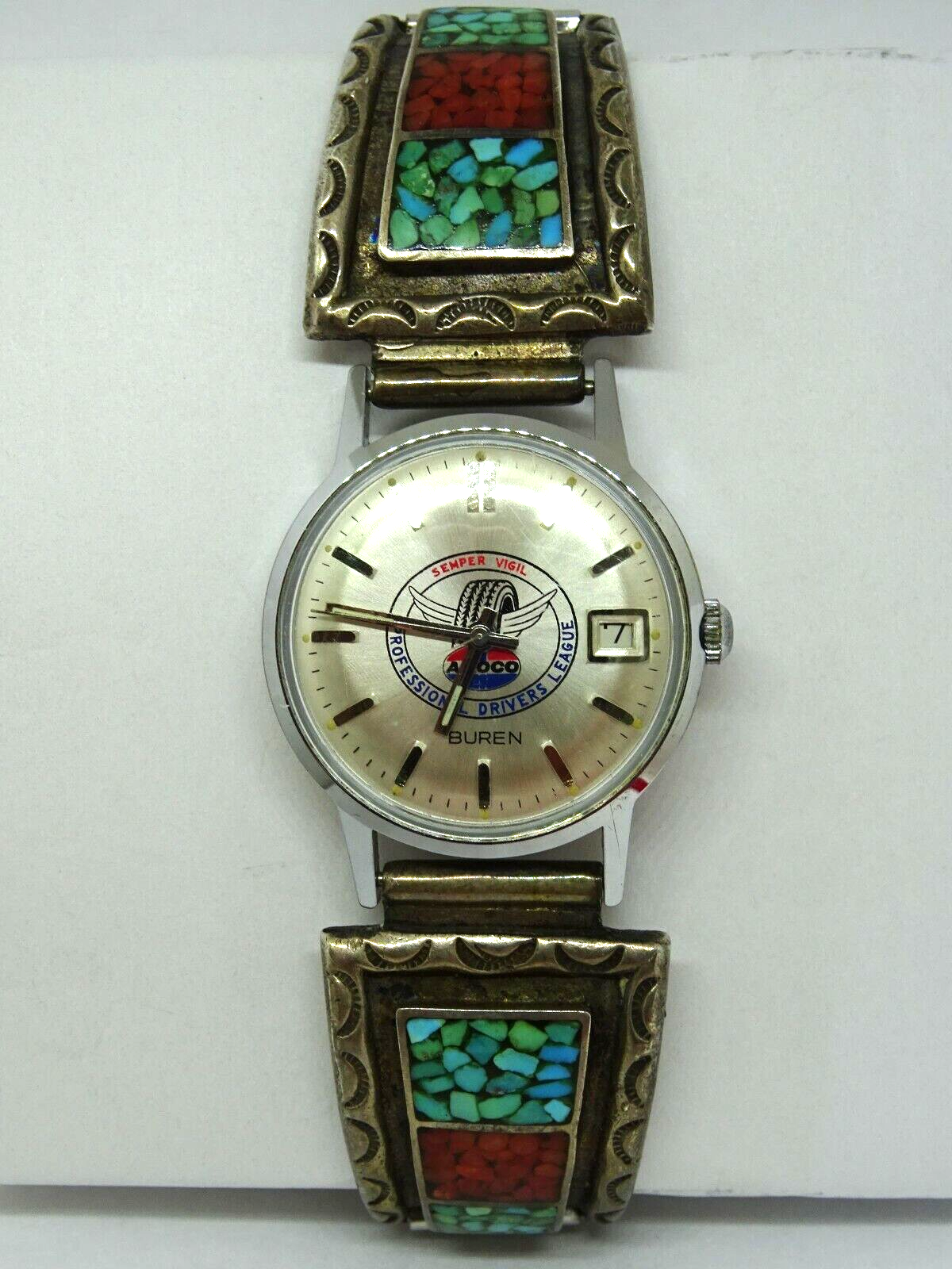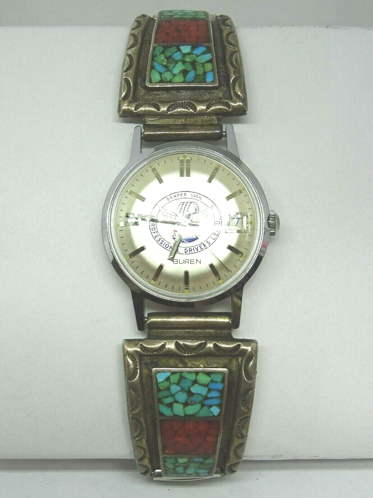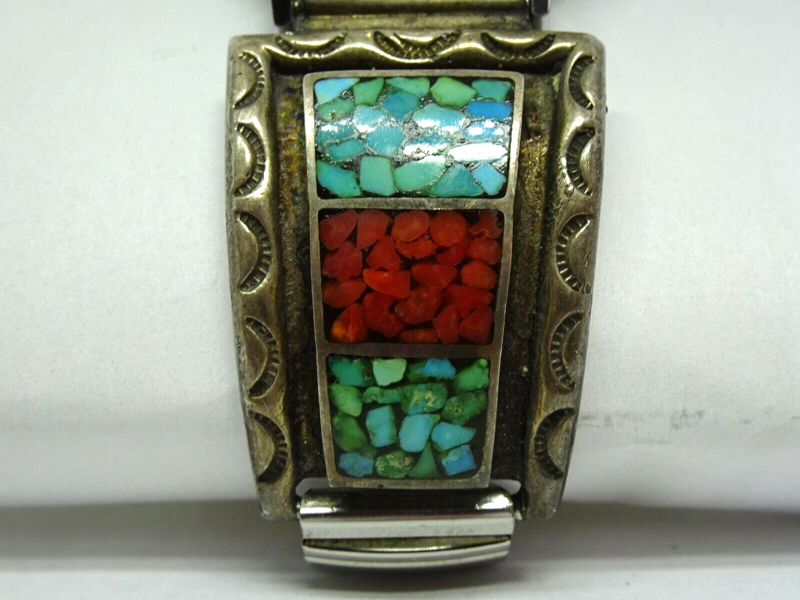 Old Pawn Navajo Big Turquoise & Coral Inlay Sterling Watch Tips Signed