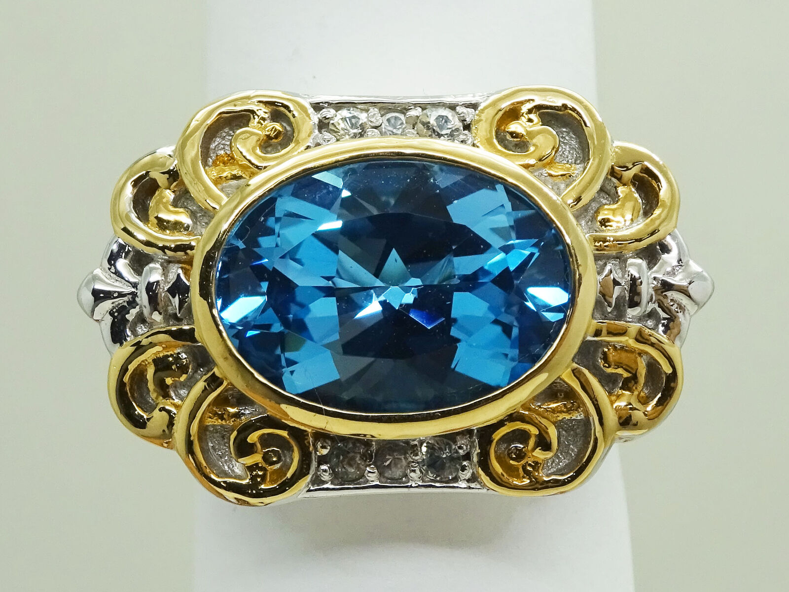 Oval Faceted Blue Topaz & CZ 2-Tone Sterling Silver Ring Size 10