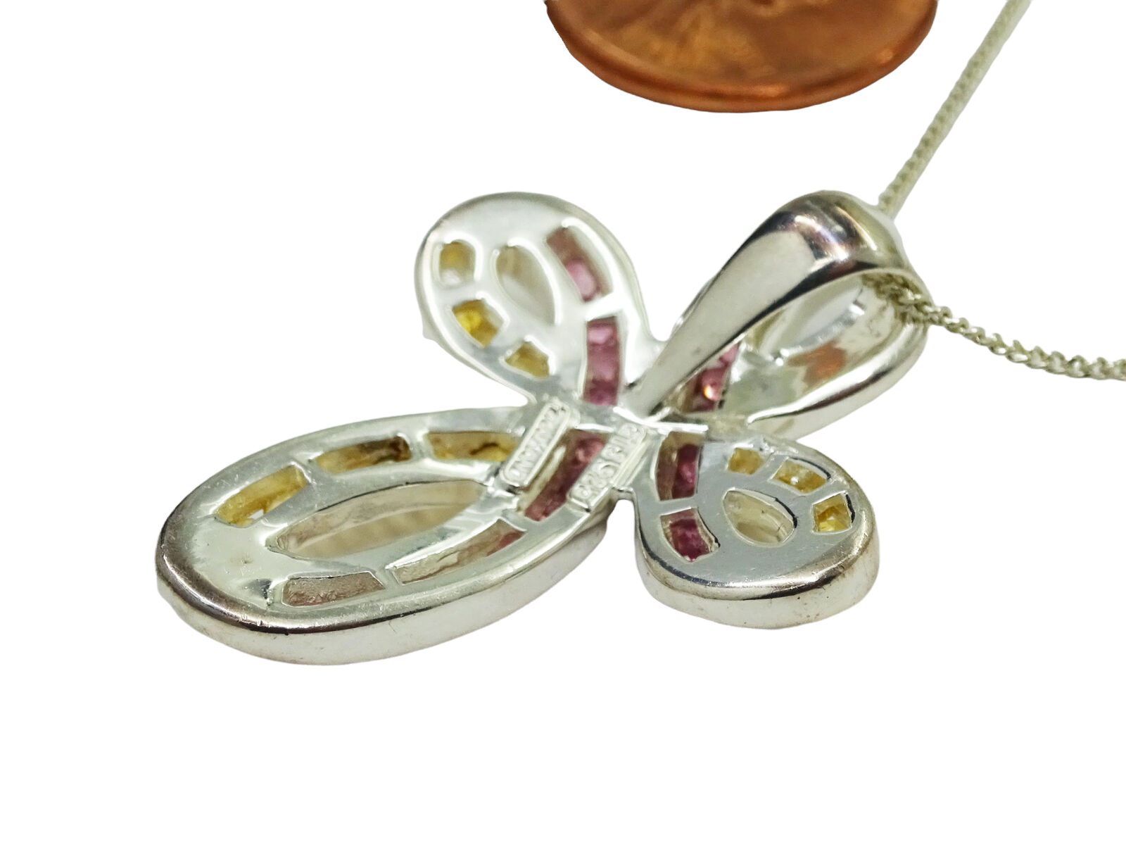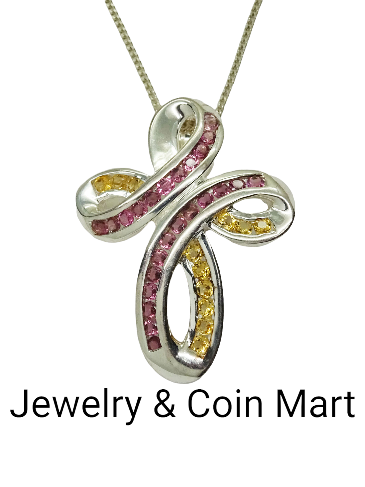 Sparkling pink tourmaline & citrine ribbon swirl cross pendant on chain necklace, in sterling silver.