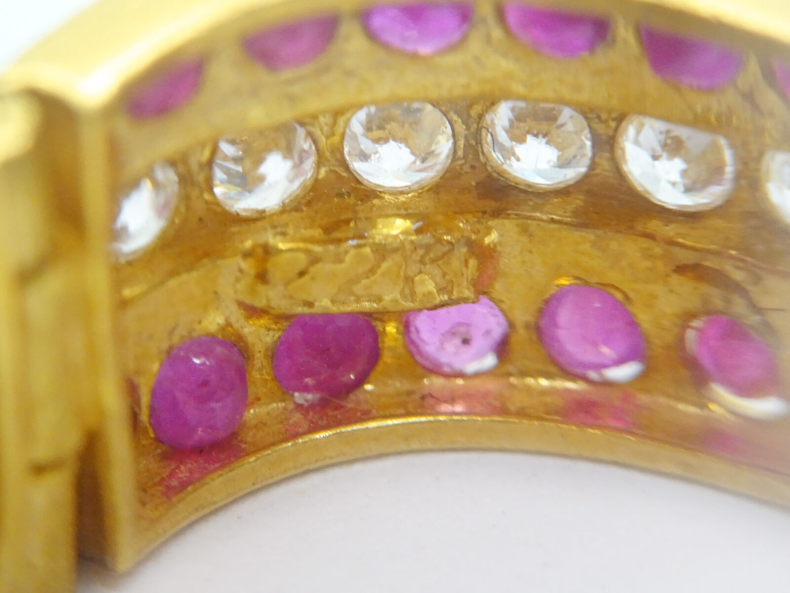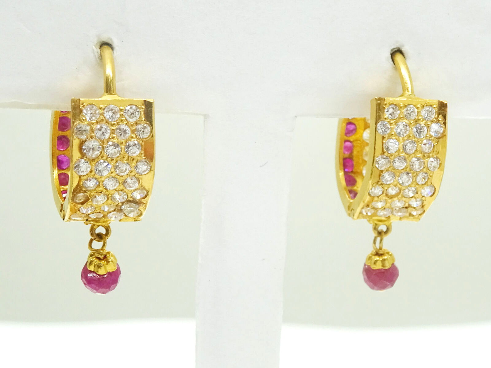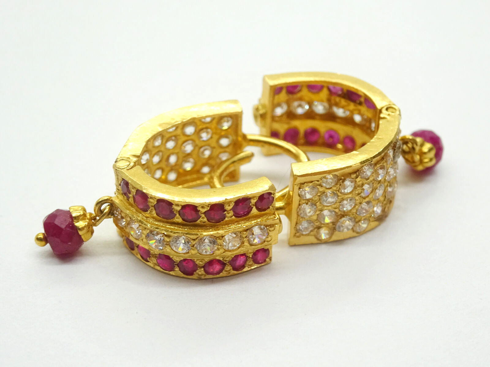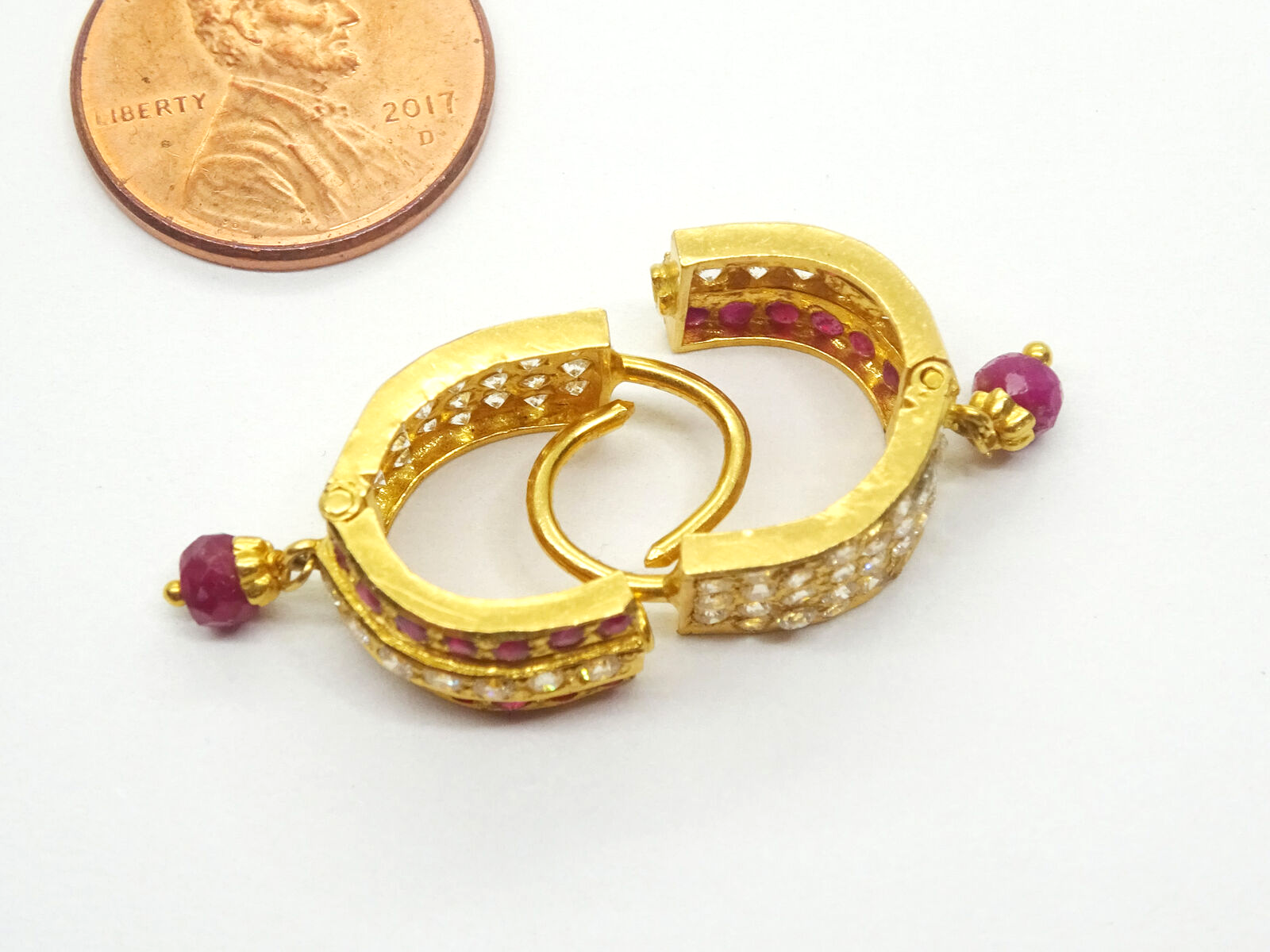 Pair of 22k yellow gold huggie dangle earrings, set with synthetic red & white gemstone paves.