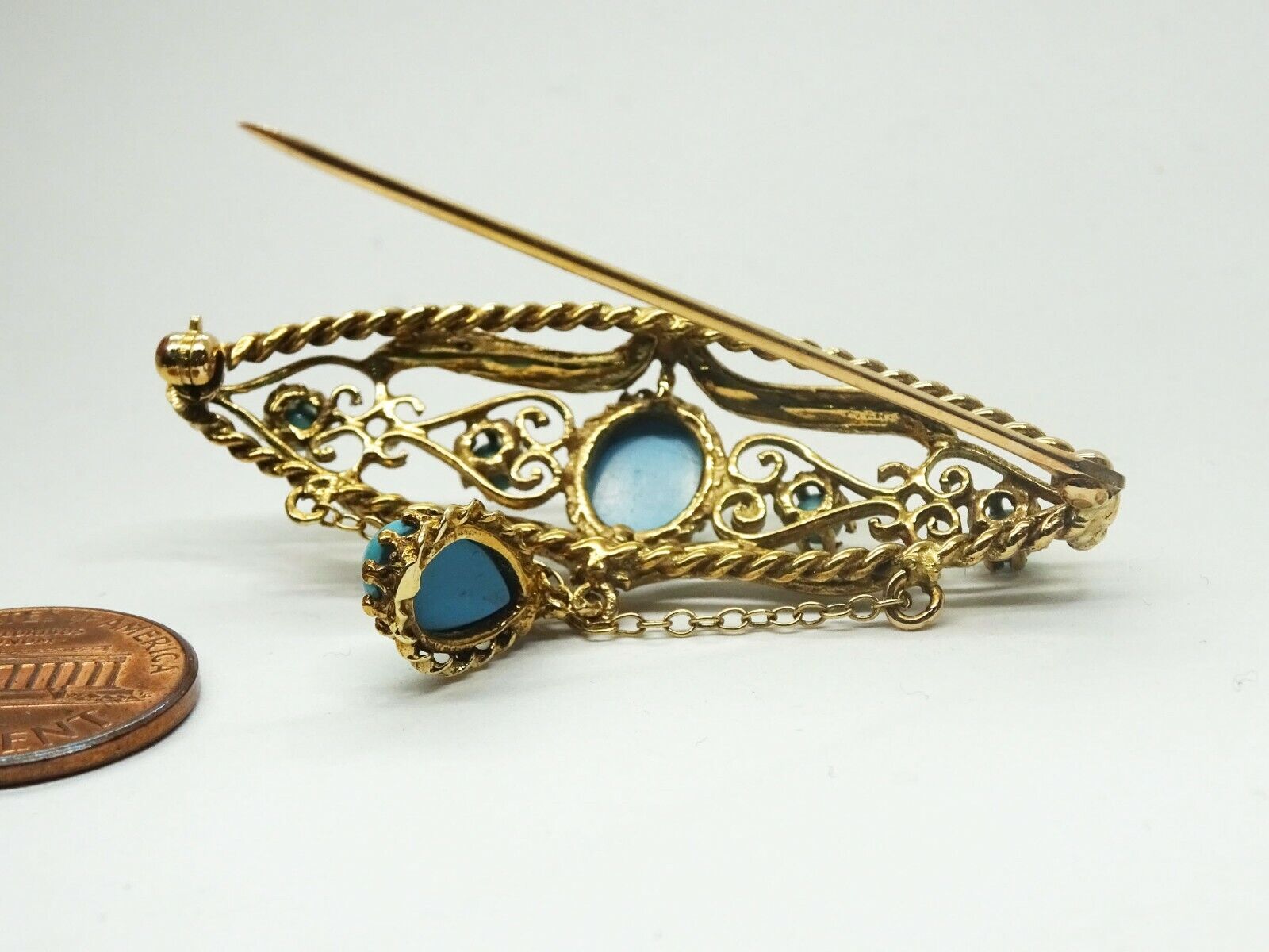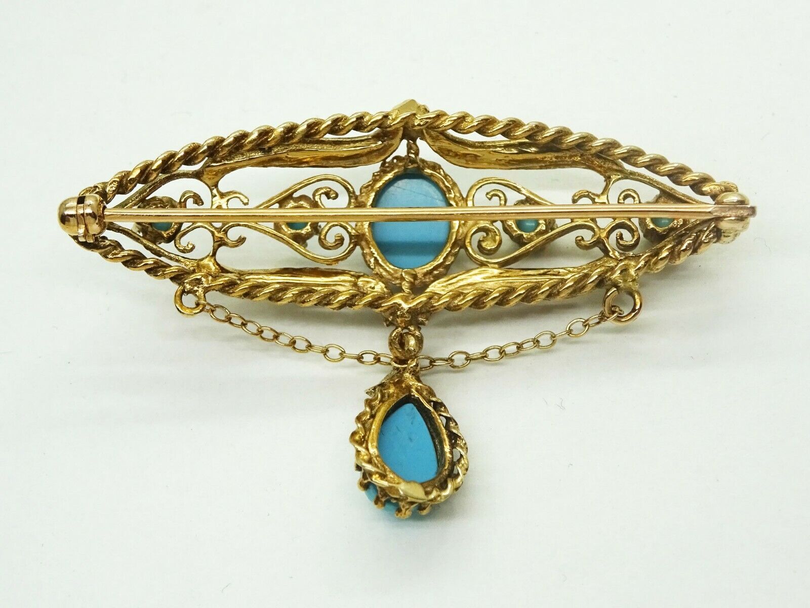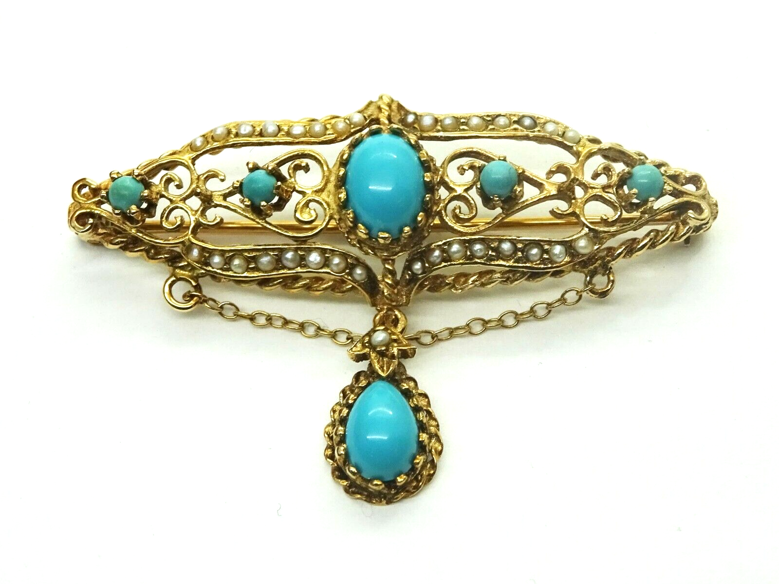 Estate filigree dangle brooch in 14k yellow gold, set with robin's egg blue Persian turquoise and seed pearls.