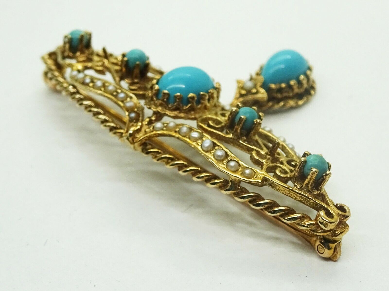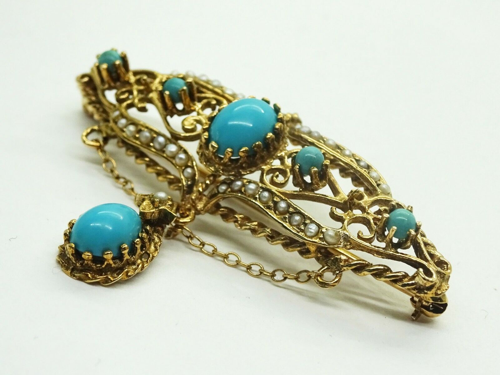 Robin's Egg Blue Persian Turquoise & Seed Pearl Dangle Filigree Brooch 14k Gold