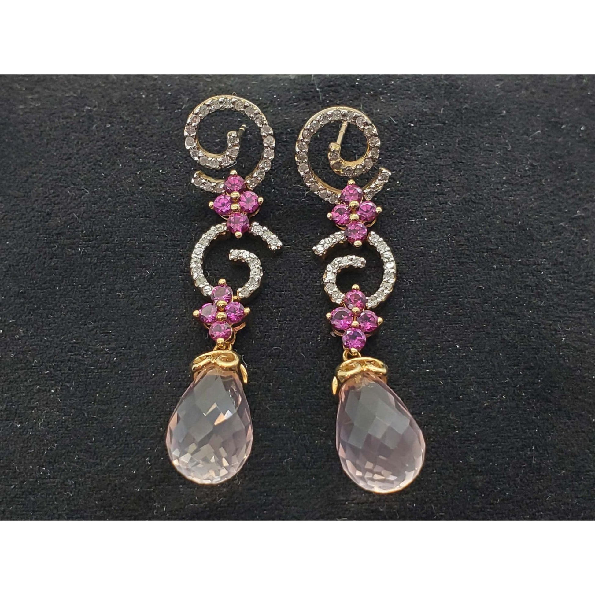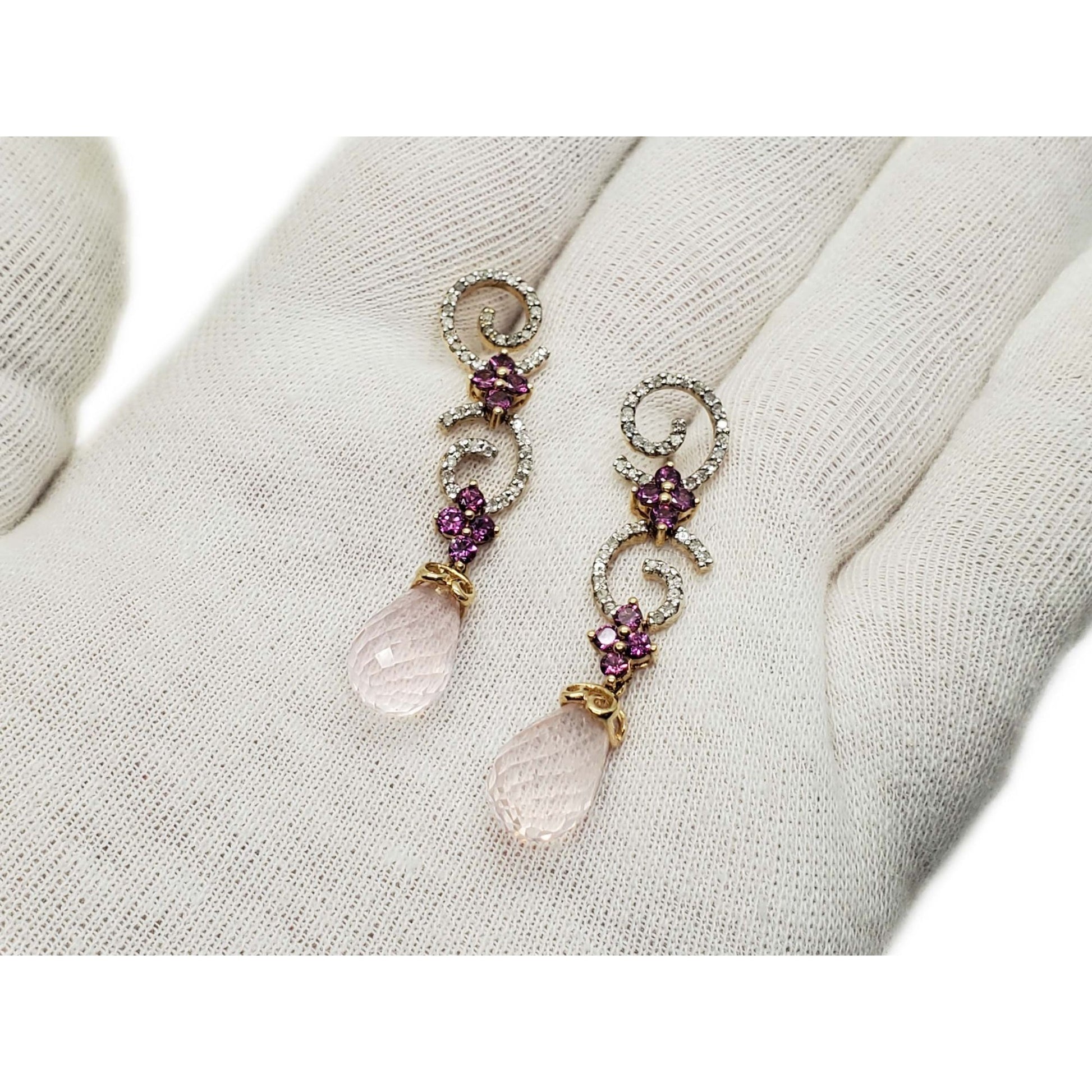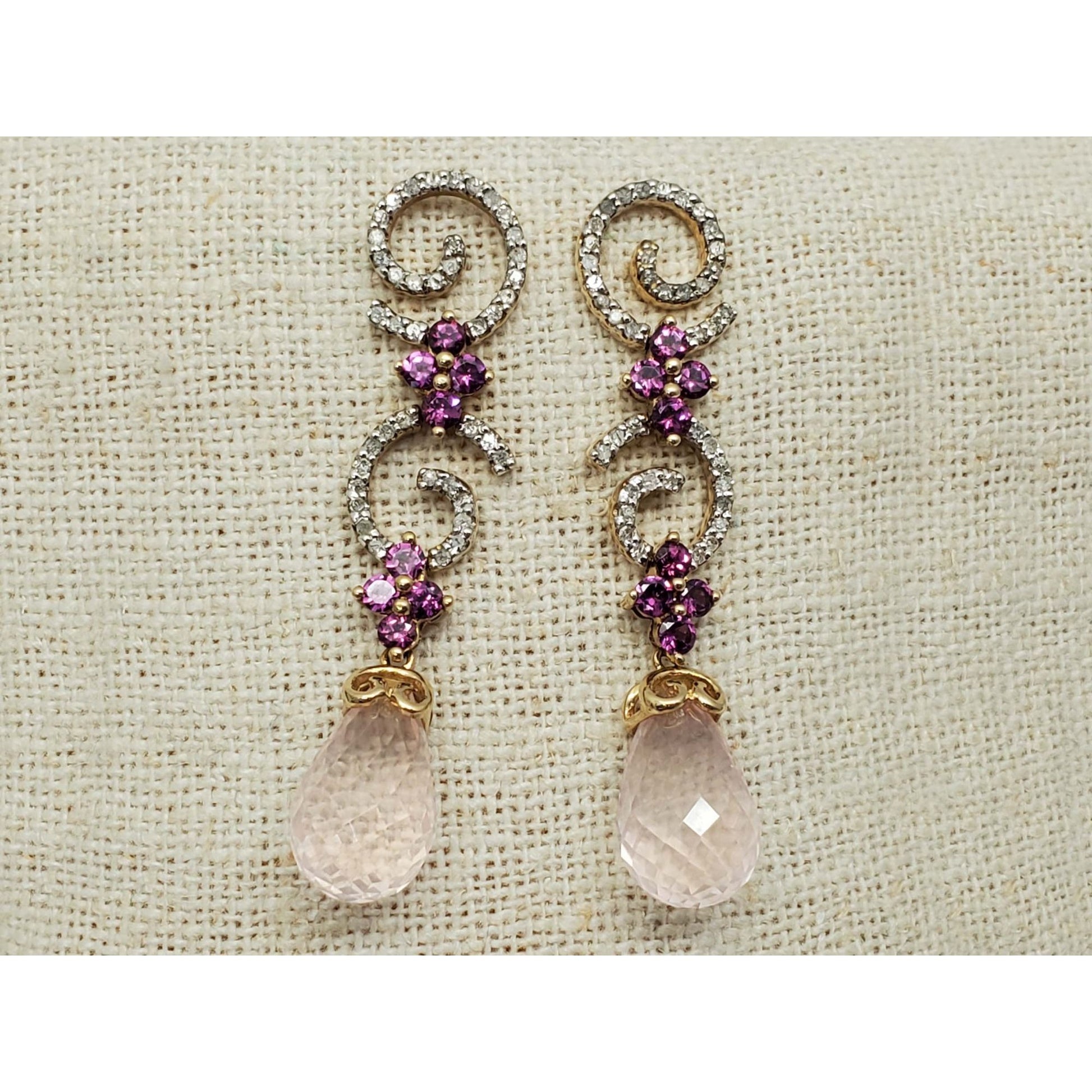 Swirl design dangle drop earrings set with natural gemstones such as fancy cut rose quartz, round pink tourmalines, and earth mined diamonds.