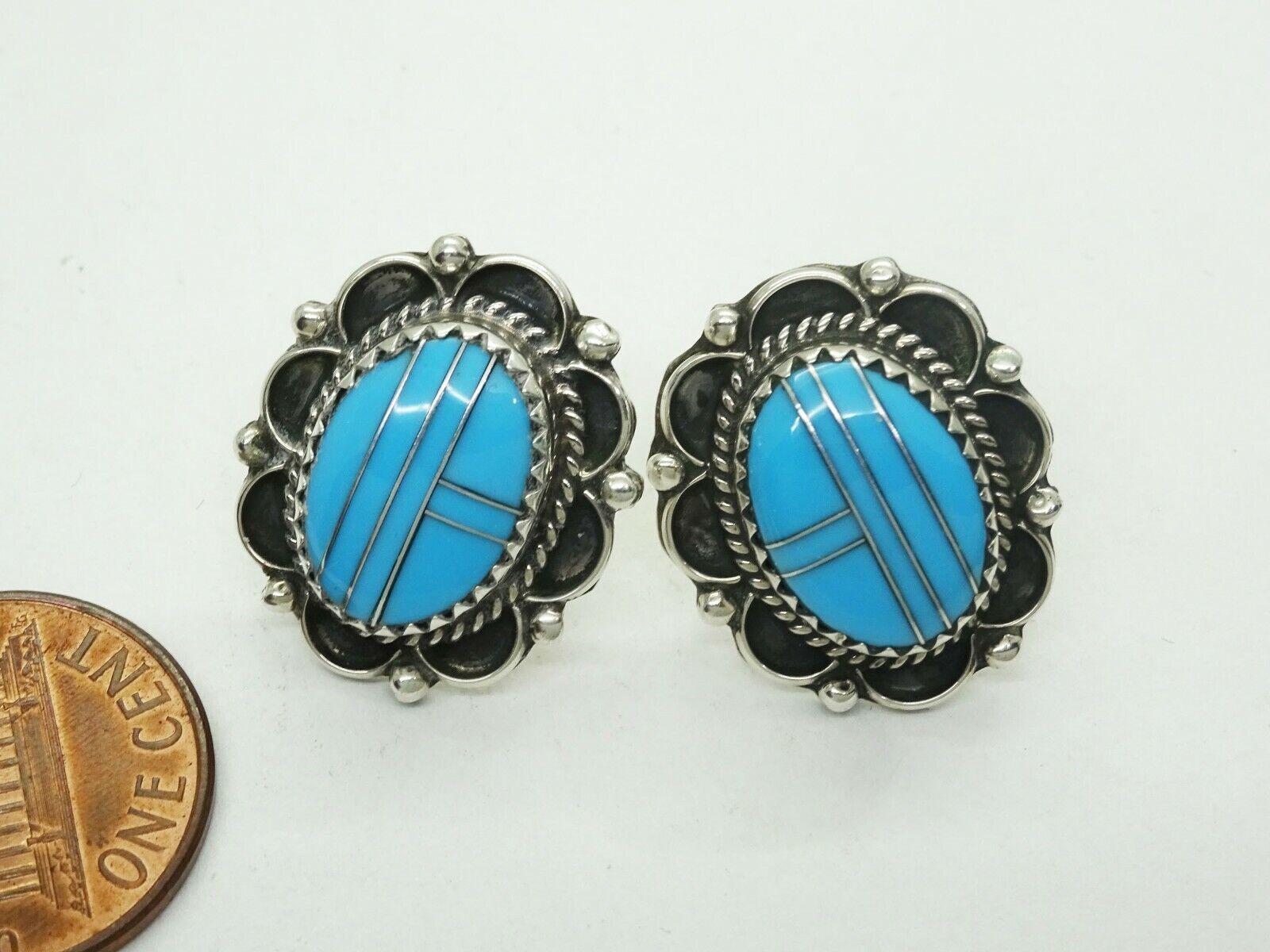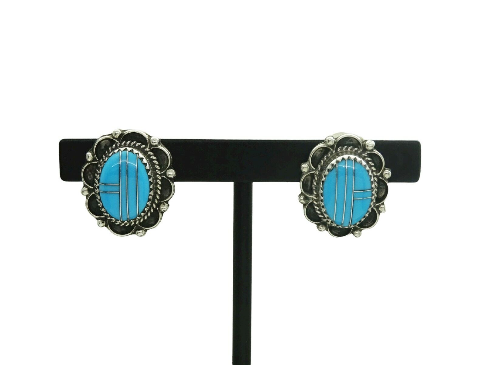 Pair of Sleeping Beauty turquoise inlay stud earrings in sterling silver, by Zuni artisan Sensa Eustace.