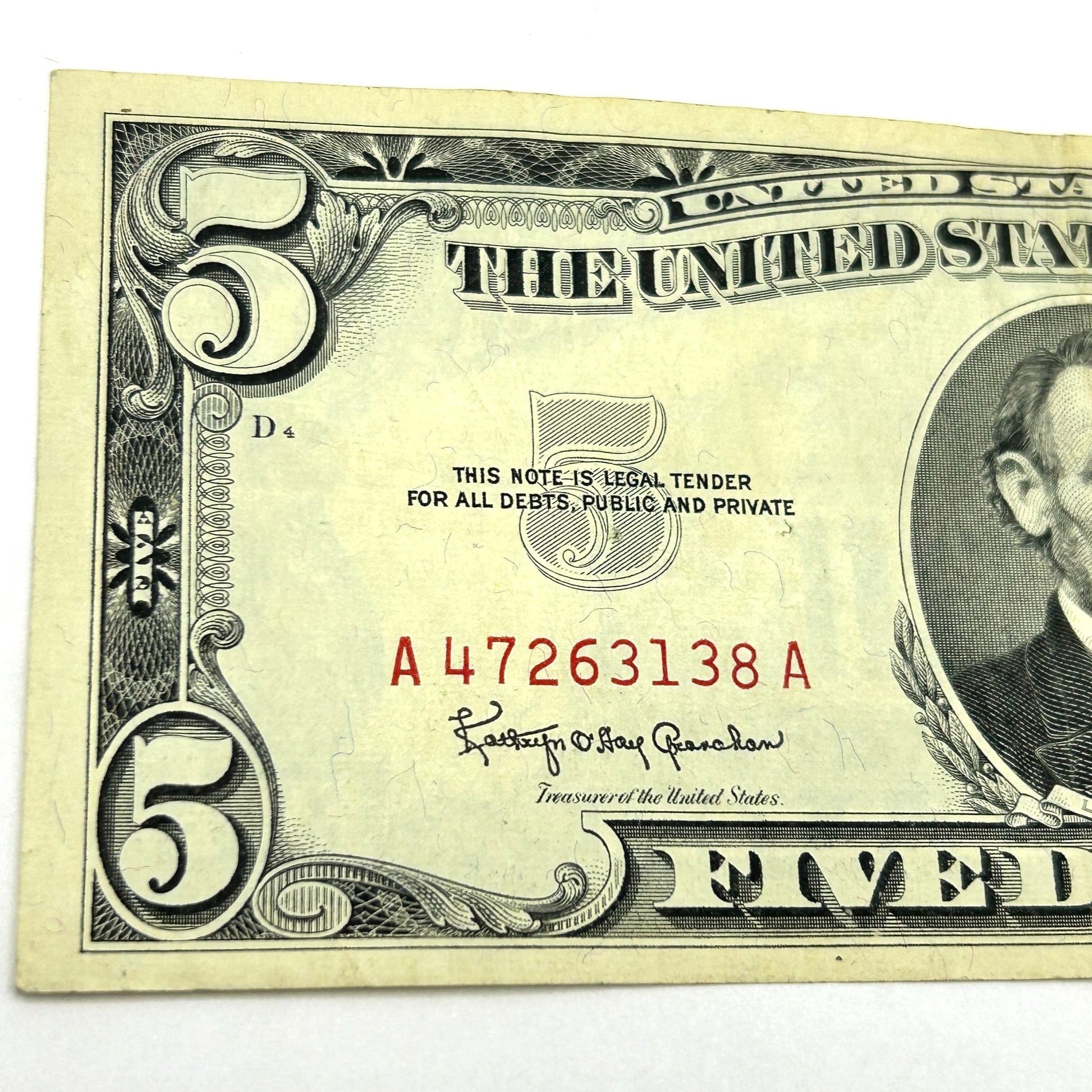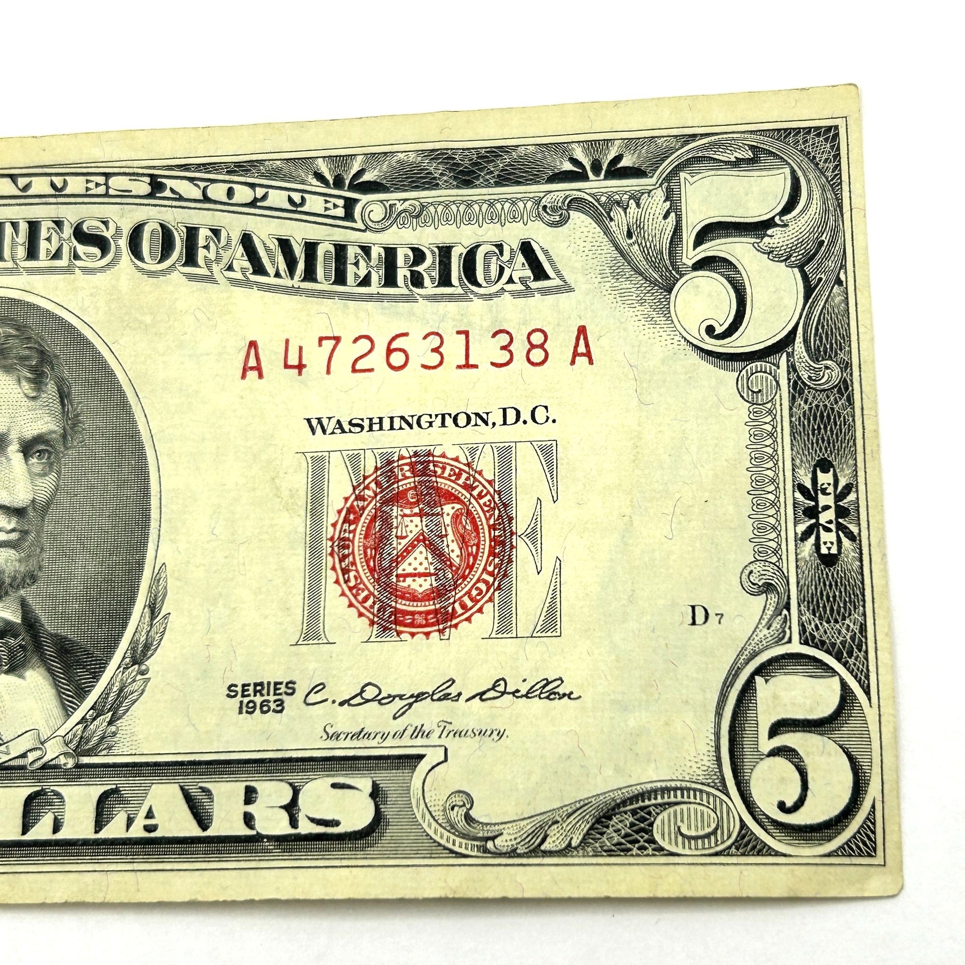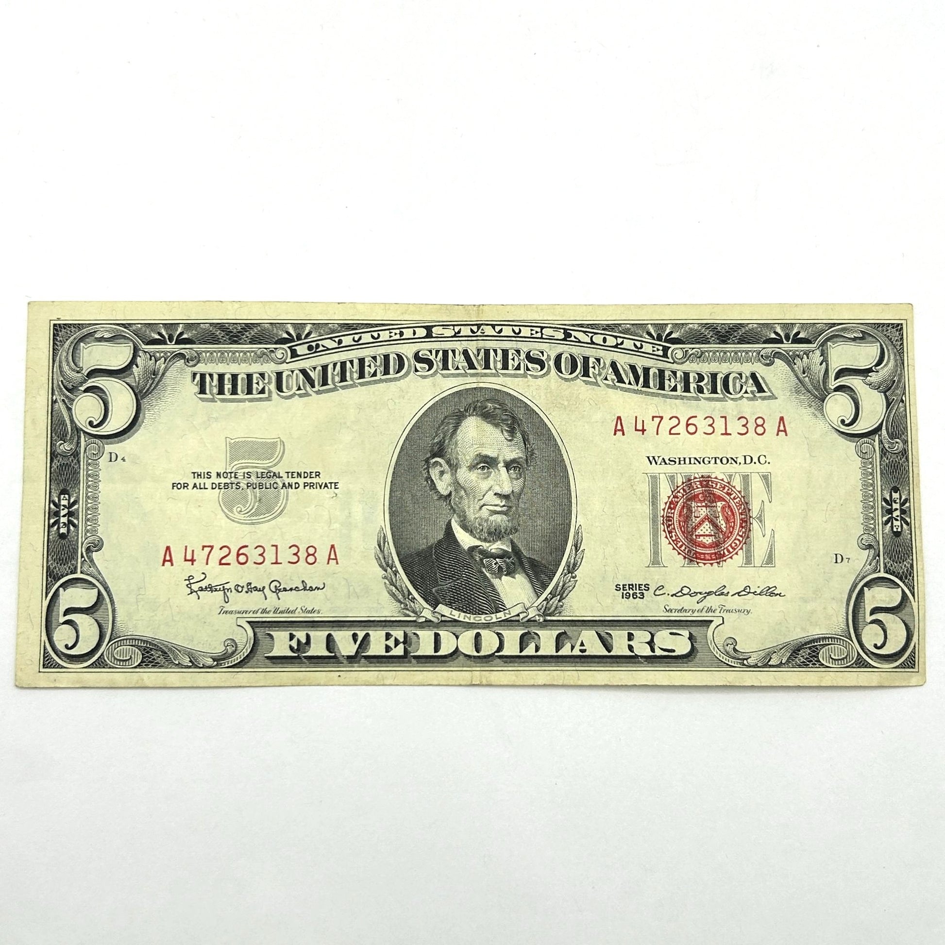 Series 1963 $5 Five Dollar United States Note Red Seal - A47263138A