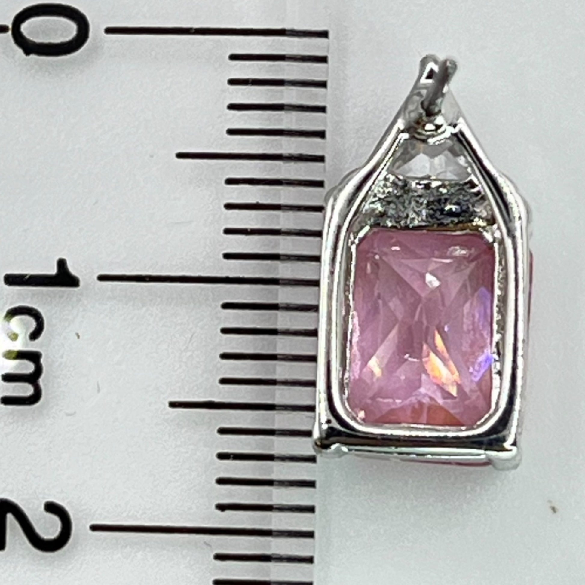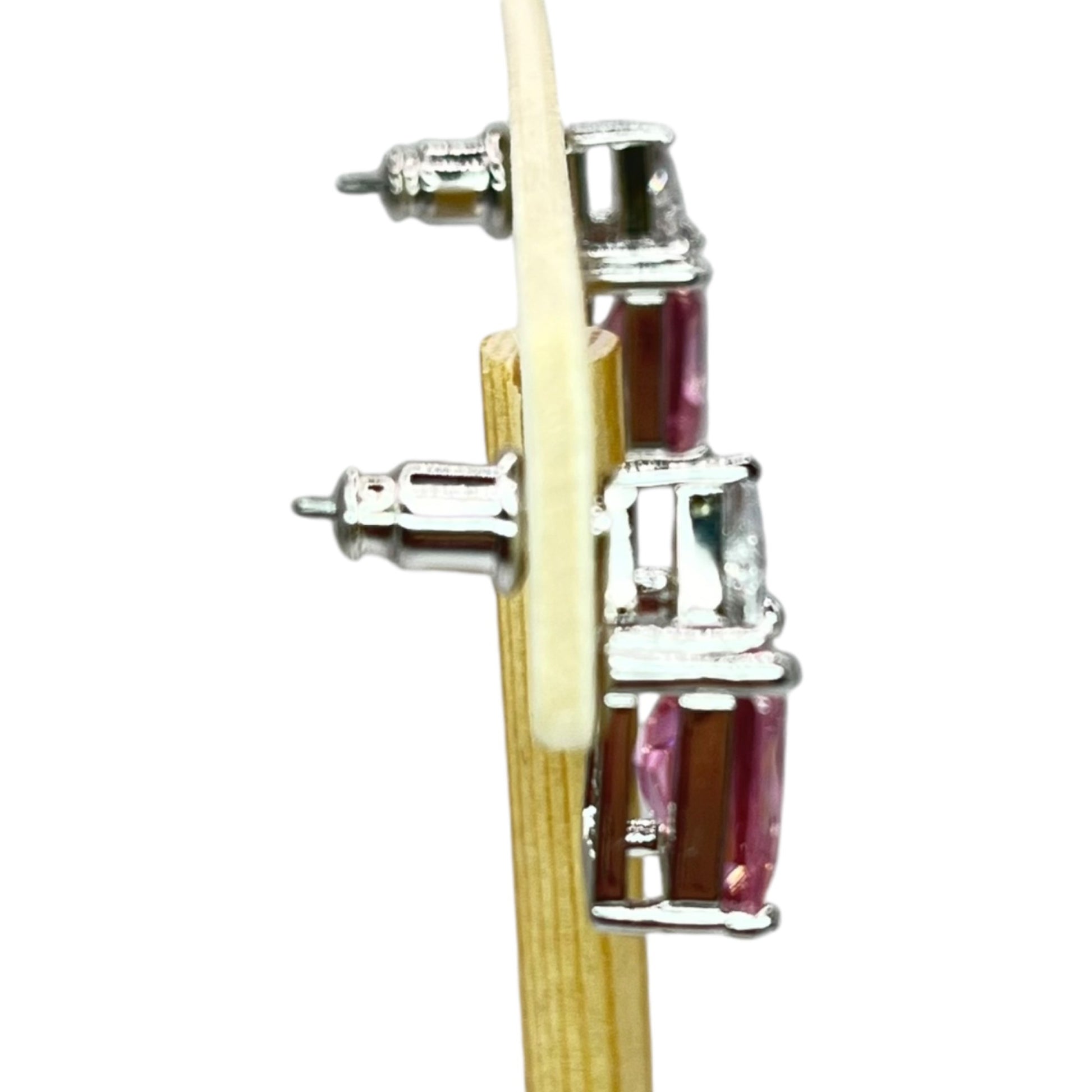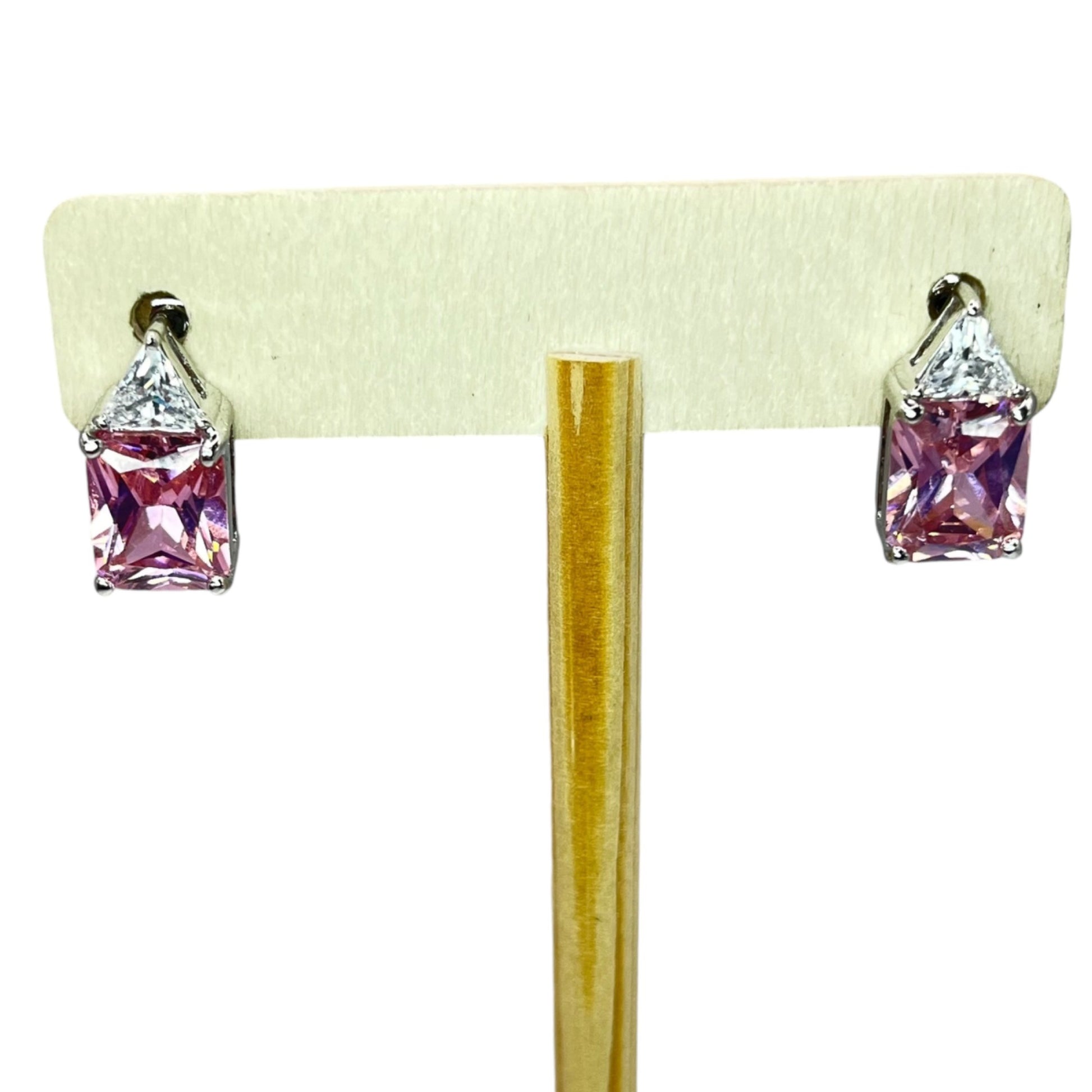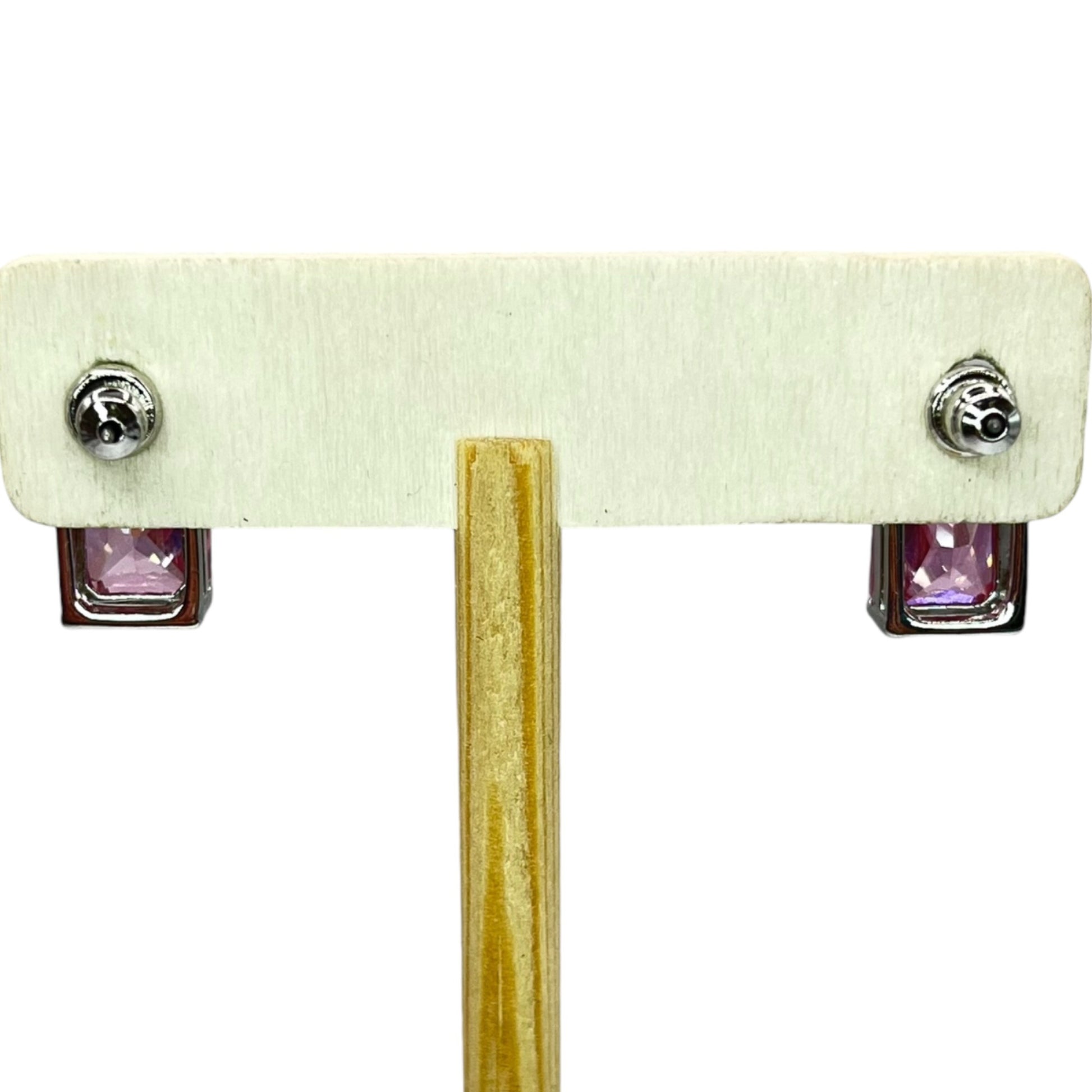 Silver Rose Pink Rectangular Cut Gemstone Stud CZ Earrings Geometric Formal