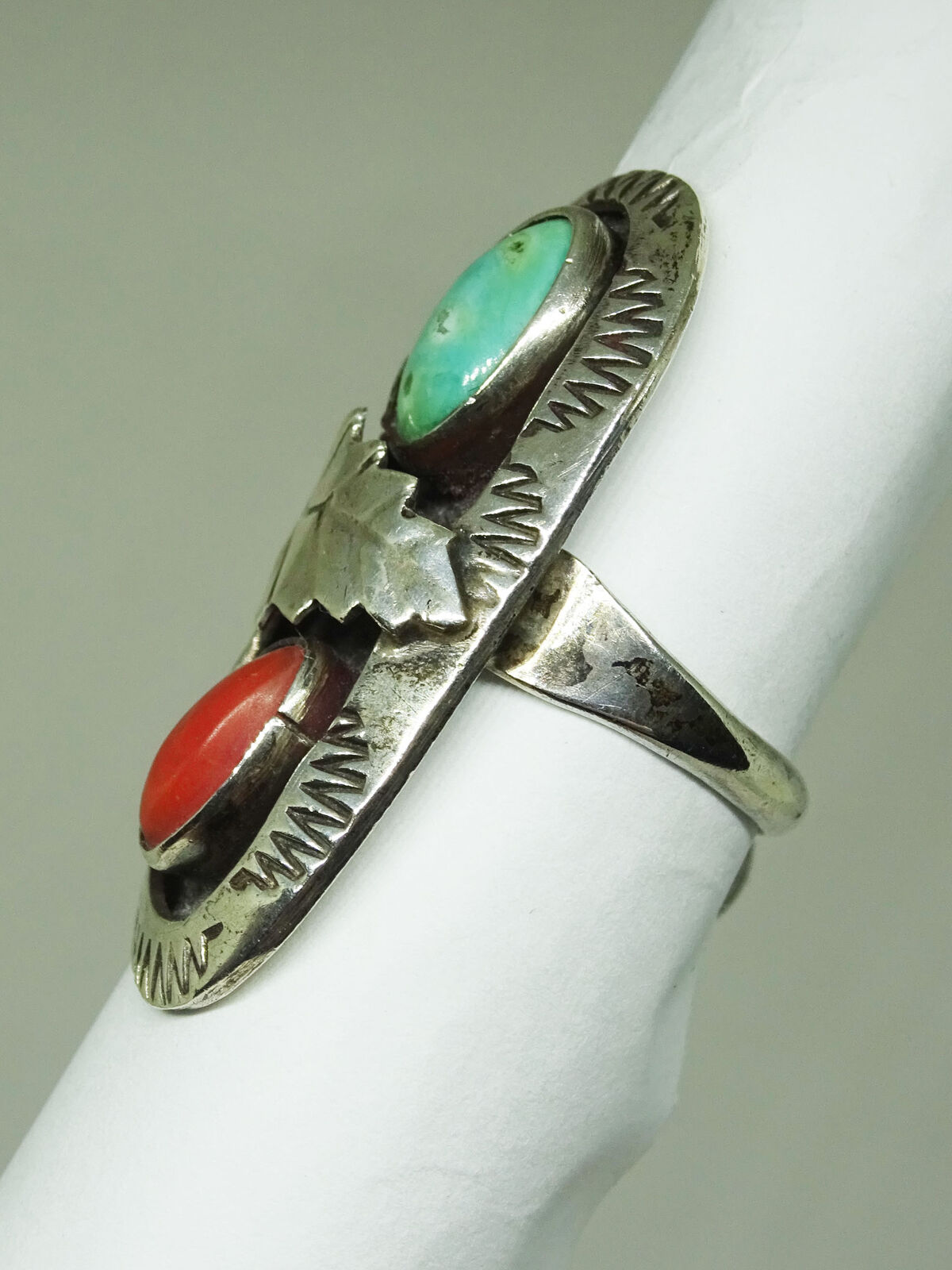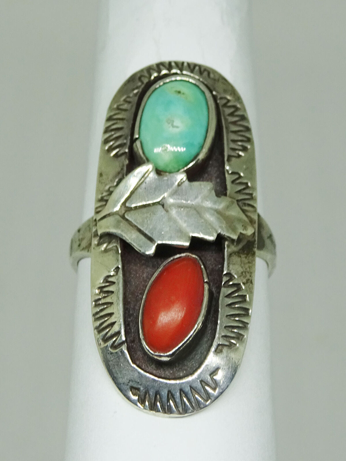Southwest Turquoise & Red Coral Figural Leaf Sterling Silver Ring Size 6.25