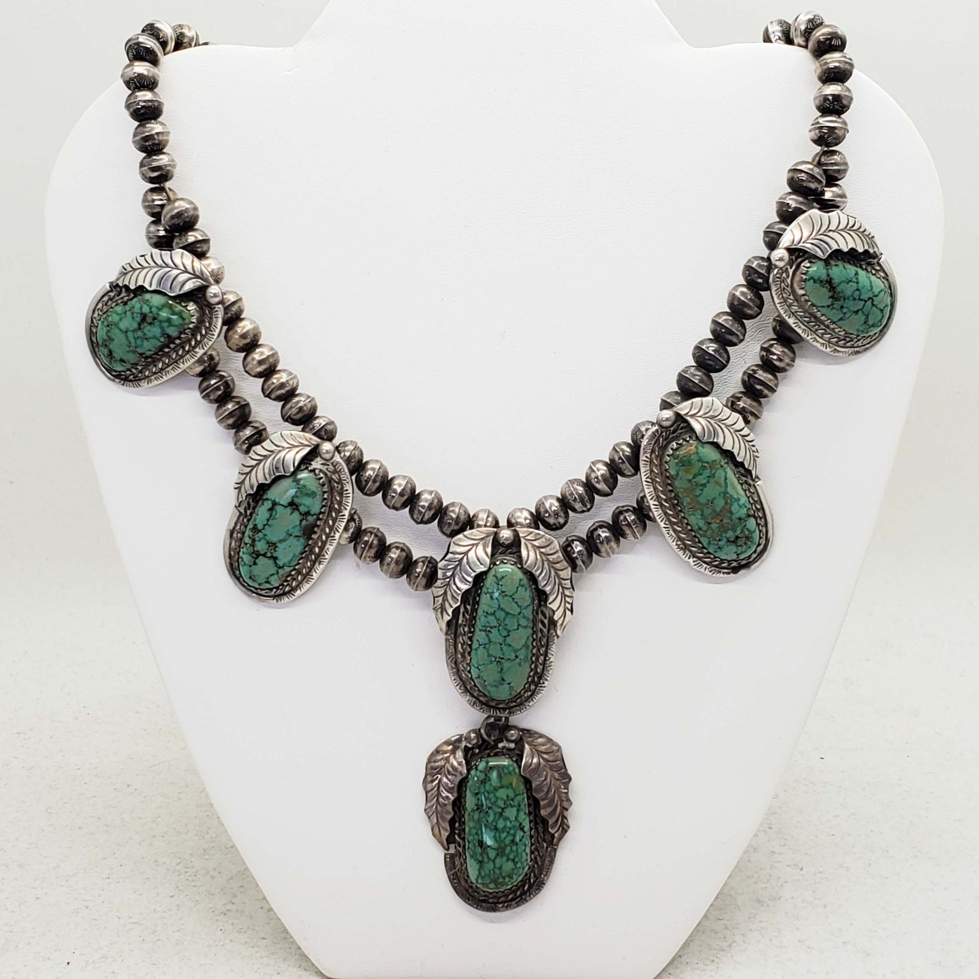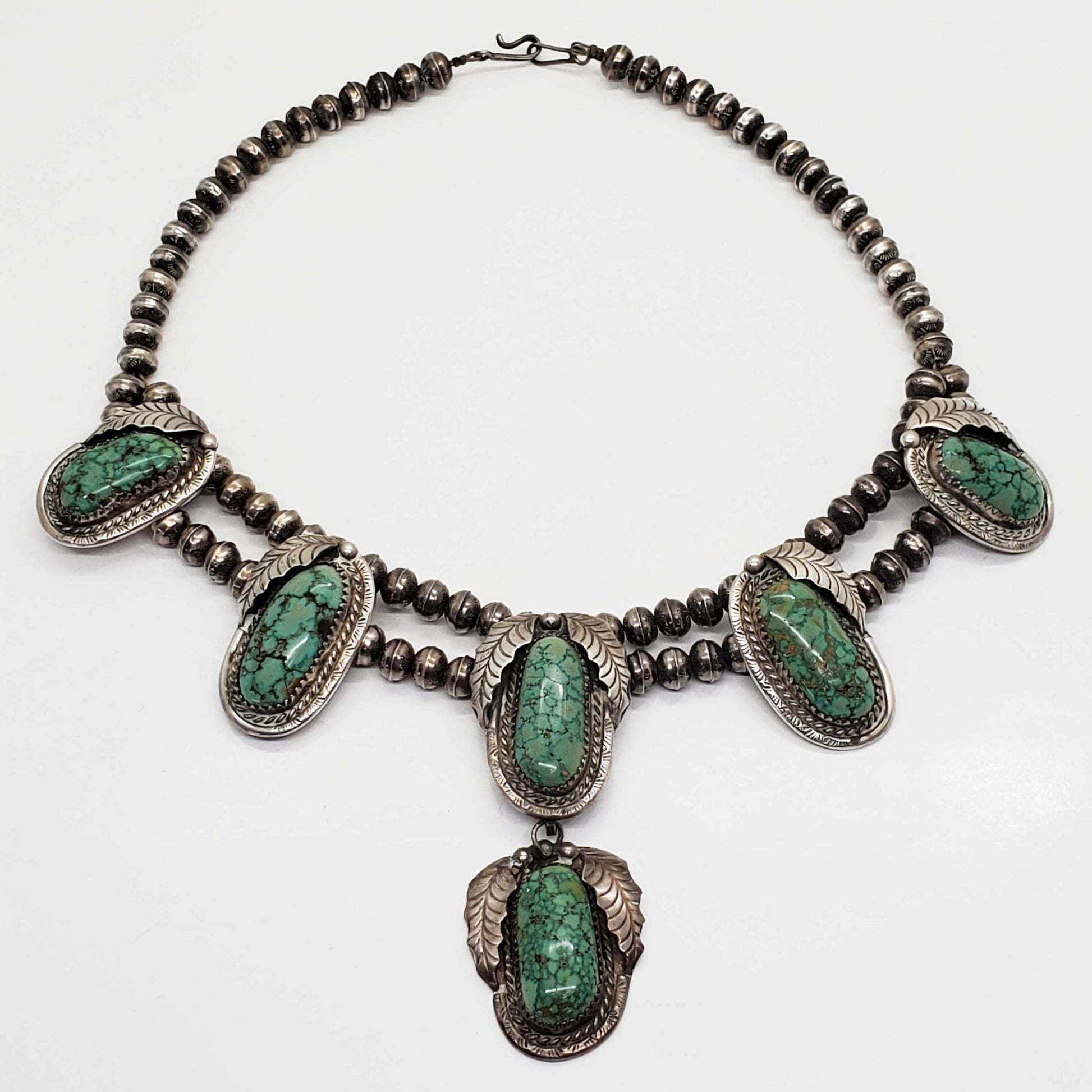 Southwestern turquoise station sterling silver bead collar necklace.