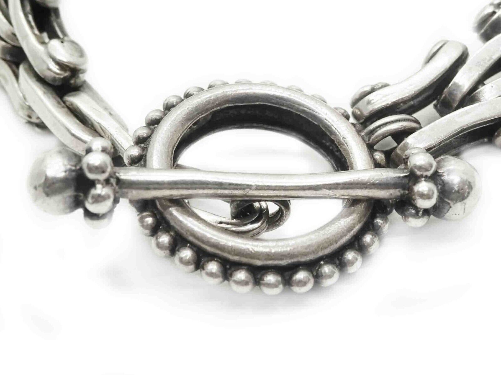 Stephen Dweck designer carved turquoise motorcycle chain toggle bracelet in sterling silver.