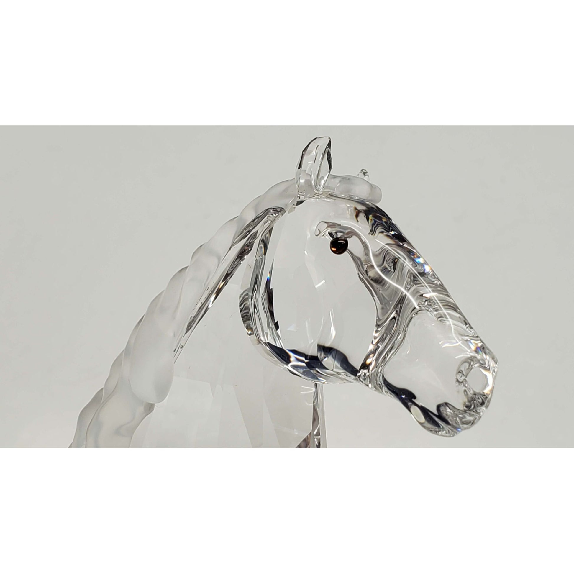 The horse is mainly clear Austrian crystal, with a frosted tail and red orange / amber eyes as the only splash of color.