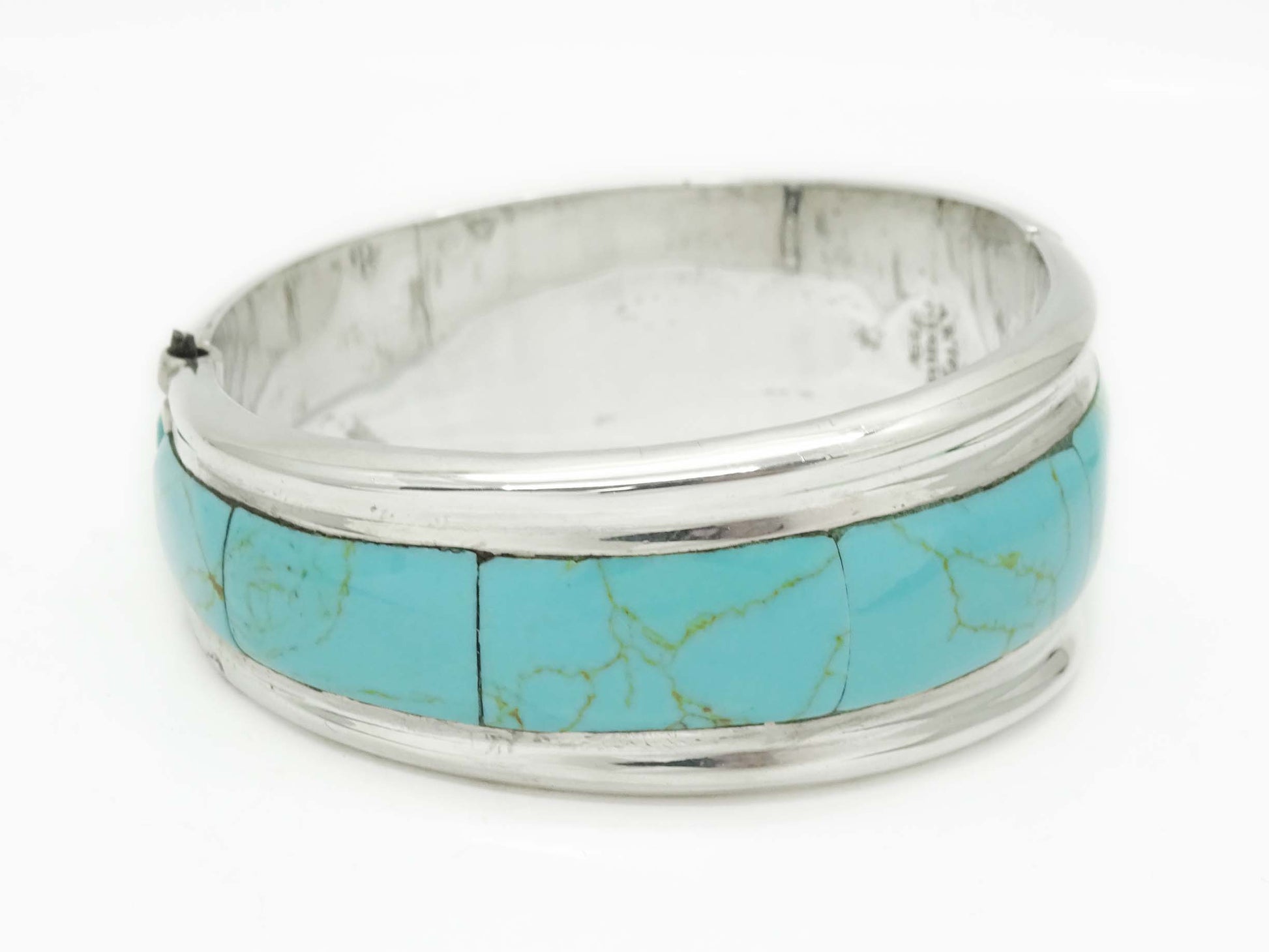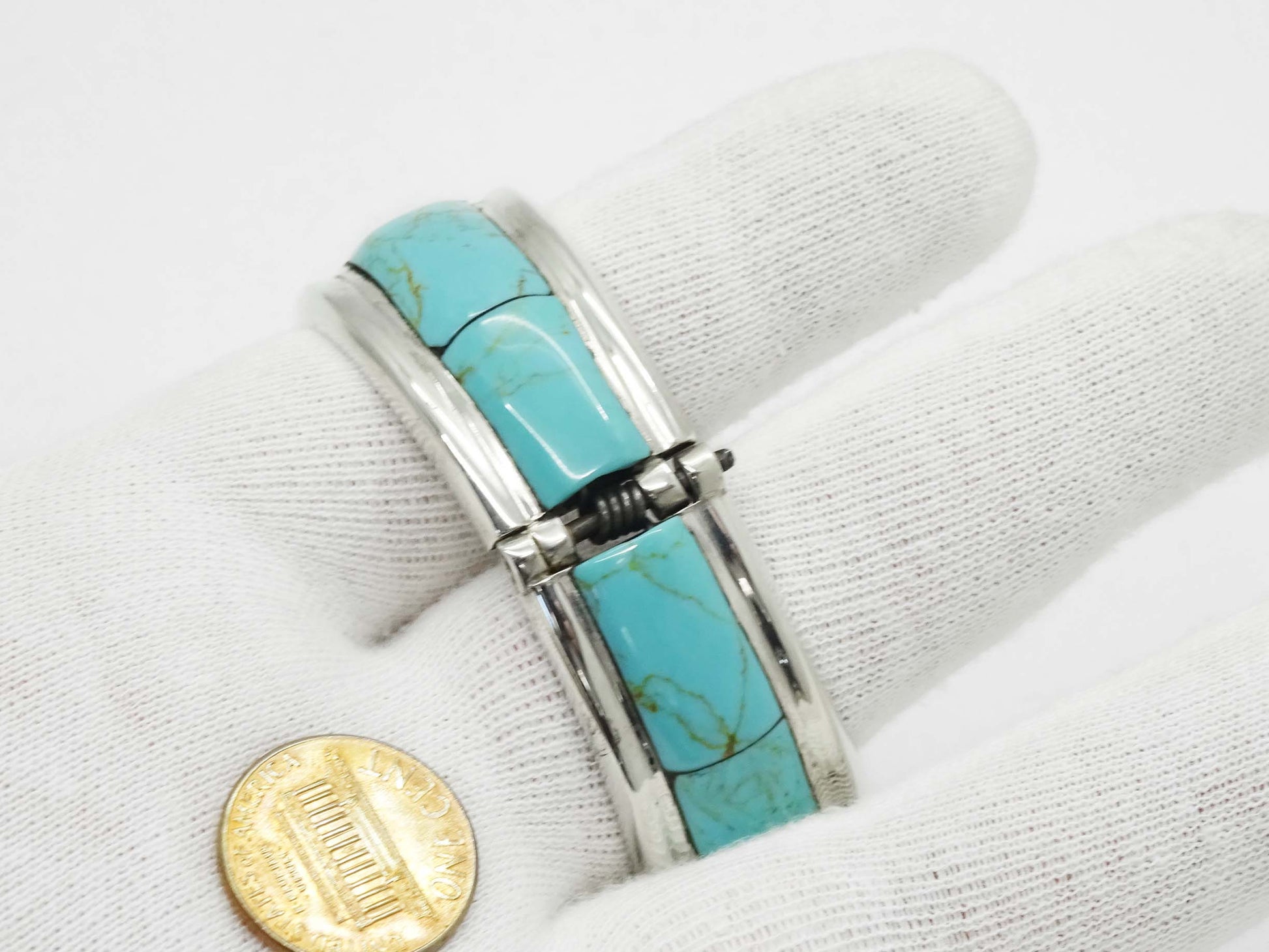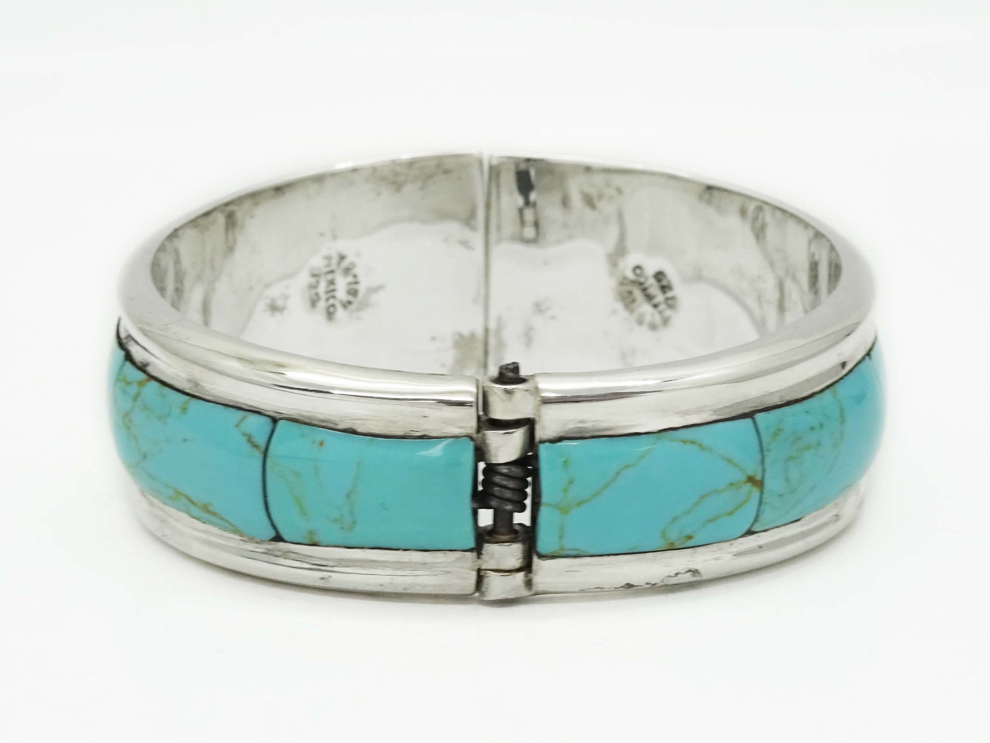 Taxco TR-164 Turquoise Inlay Hinged Bangle Cuff Bracelet Sterling Silver