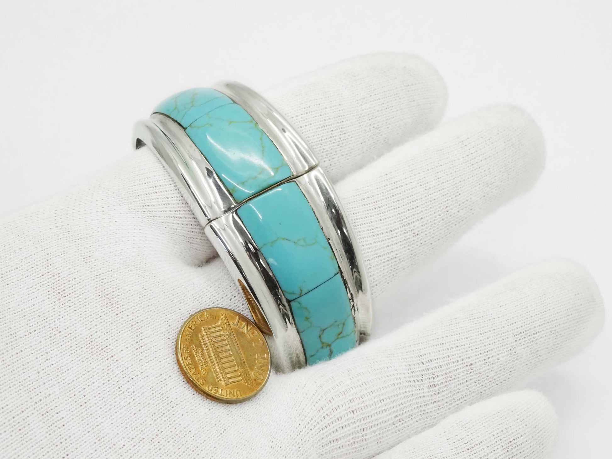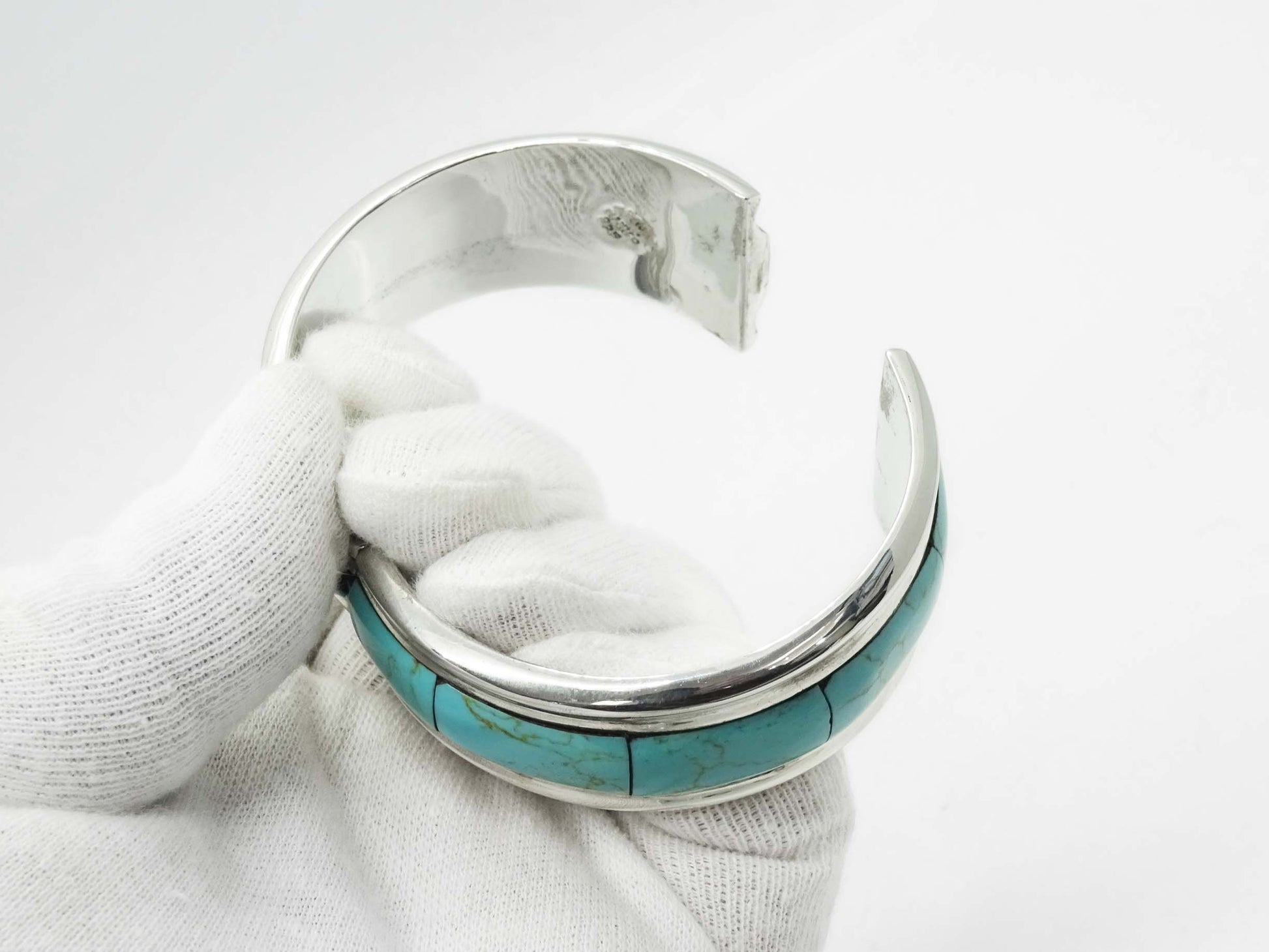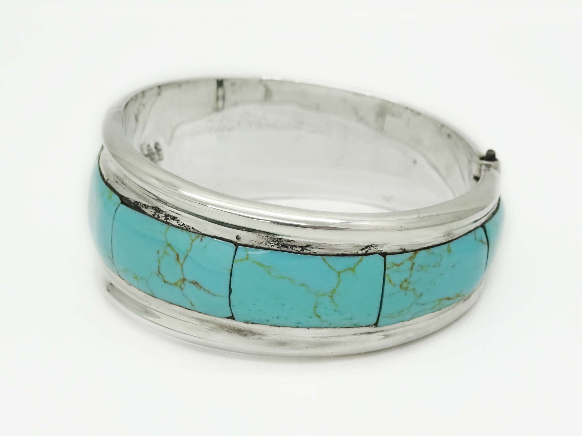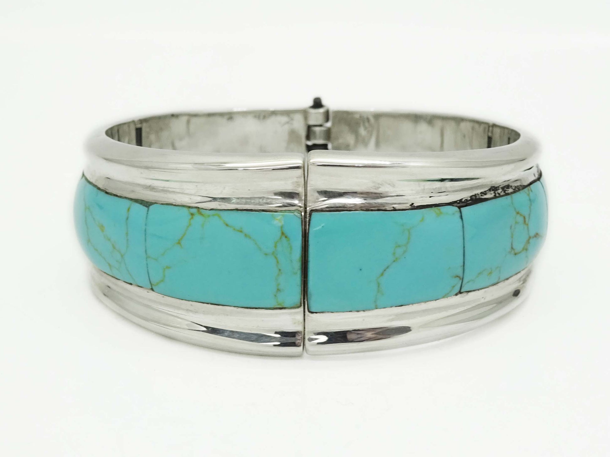 Taxco TR-164 Turquoise Inlay Hinged Bangle Cuff Bracelet Sterling Silver
