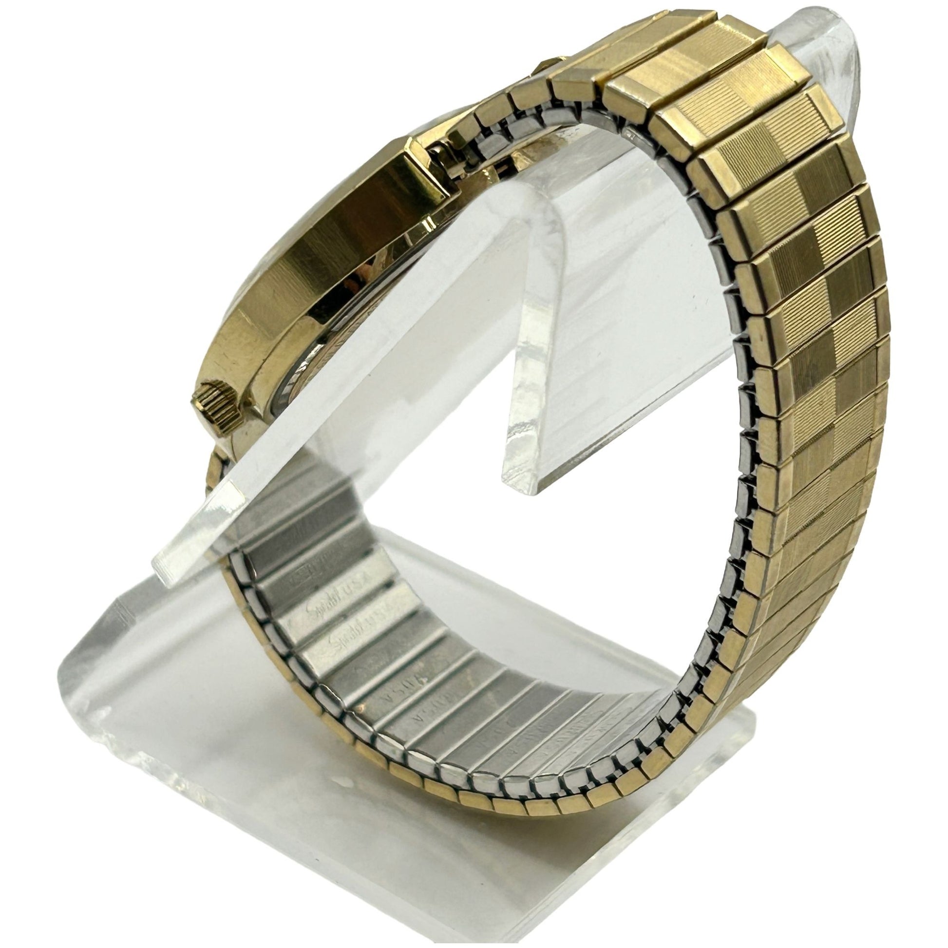 Marked: J42386, N2, BULOVA, 10k ROLLED GOLD PLATE BACK, 18K HEAVY GOLD ELECTROPLATE BEZEL, Speidel USA, STAINLESS STEEL BOTTOM CAPS, 1/20 10K G.F. TOP CAPS USA