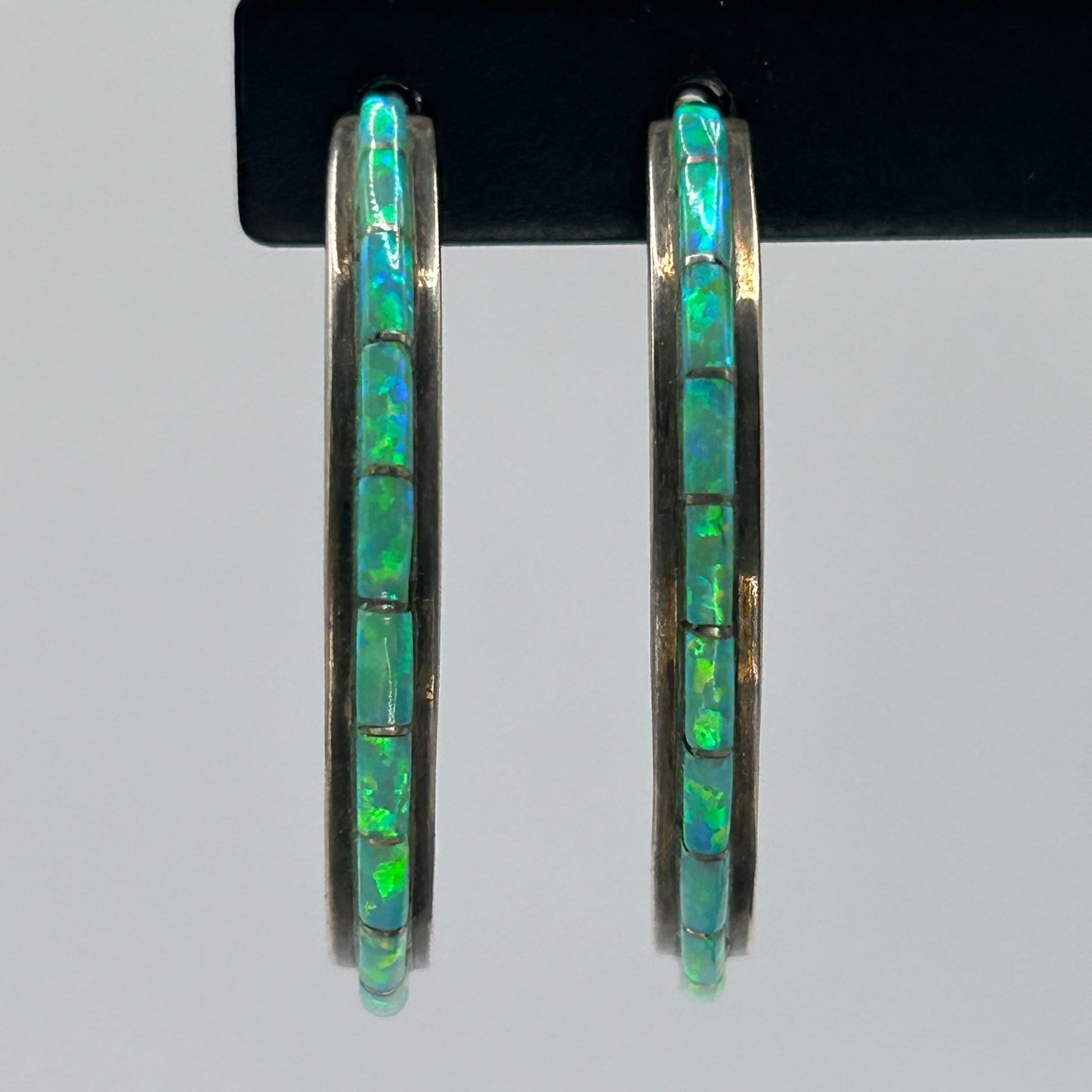 Vintage Green Fire Opal Inlay Half Hoop Earrings 925 Sterling Silver