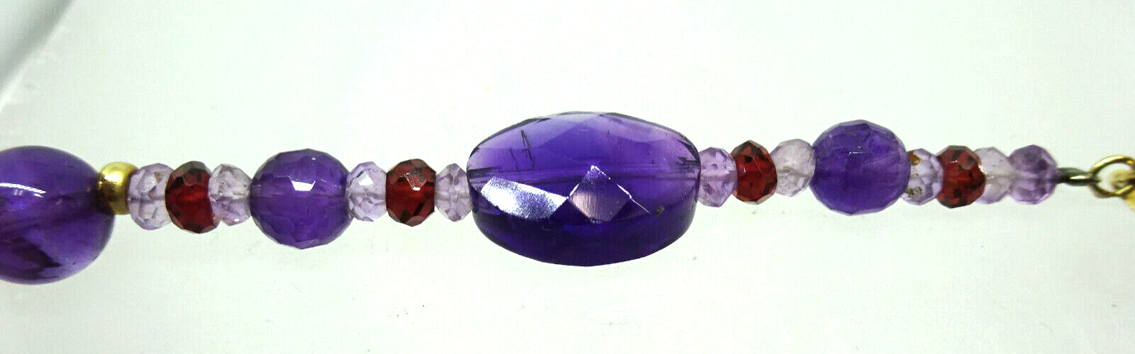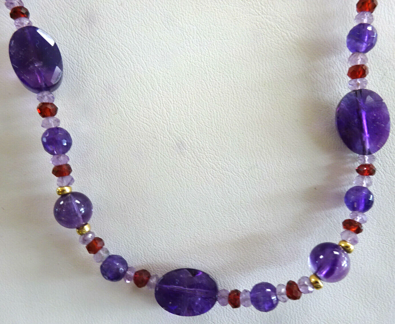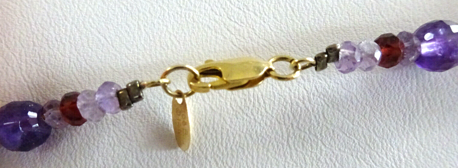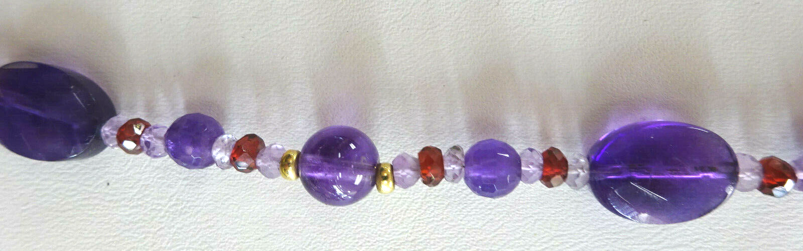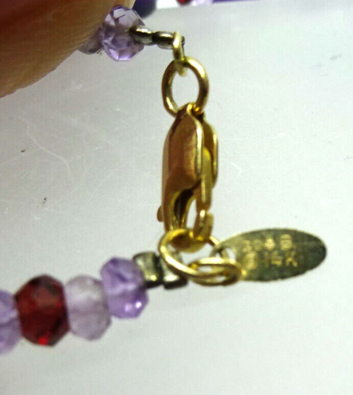 Zoe B. designer signed 14k gold, amethyst and garnet bead necklace.