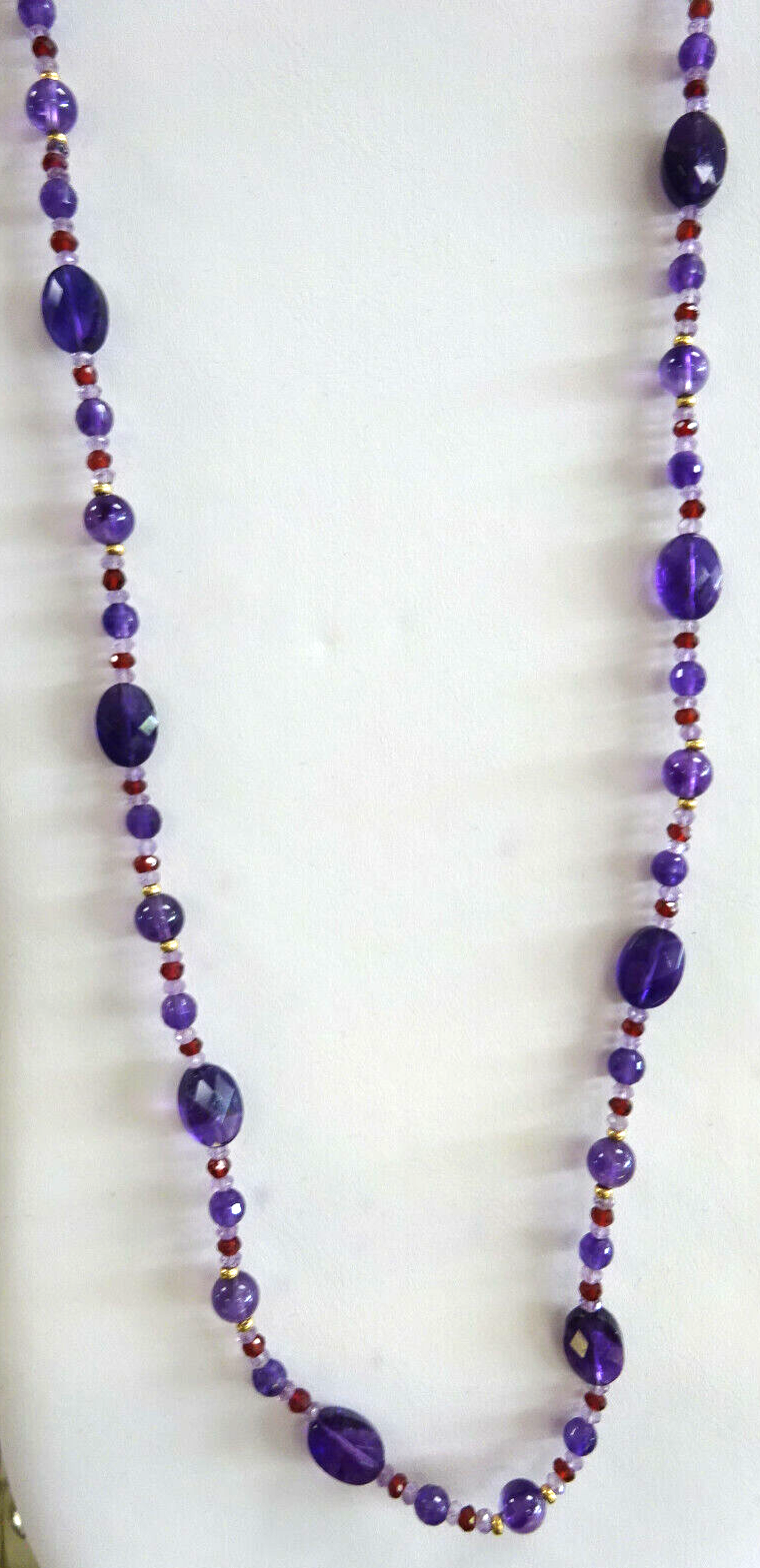 Zoe B. Designer Signed 14K Gold, Amethyst & Garnet Bead Necklace 34", Extra Long